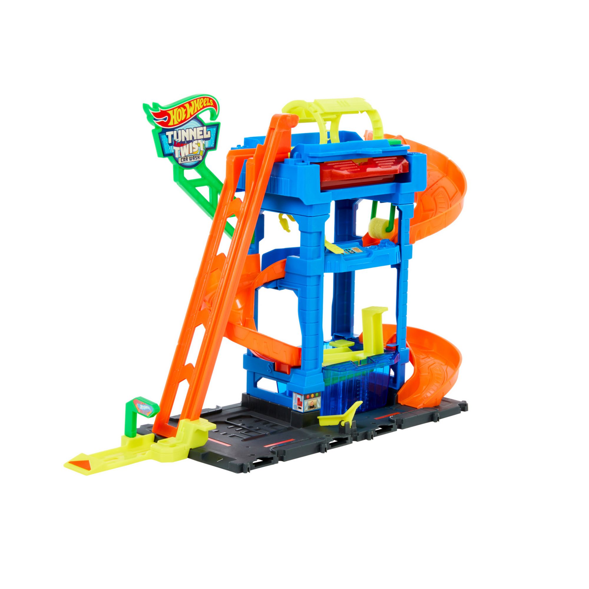 The Hot Wheels City Tunnel Twist Car Wash adds a twist to the color-changing action with an innovative water-spraying tunnel. Kids drive the included Hot Wheels Color Shifter car to the entrance where they take the kid-powered lift to the top floor. Drive into the rotating car wash tunnel where it gets doused in very warm water and you can see the car's deco instantly change. Ride down the ramp through the foam roller and hit up the vacuum to complete the detailing. Finally, drop into the icy cold water dunk station where the car's deco changes back to its original colors. Repeat again and again. Colors and decorations may vary.