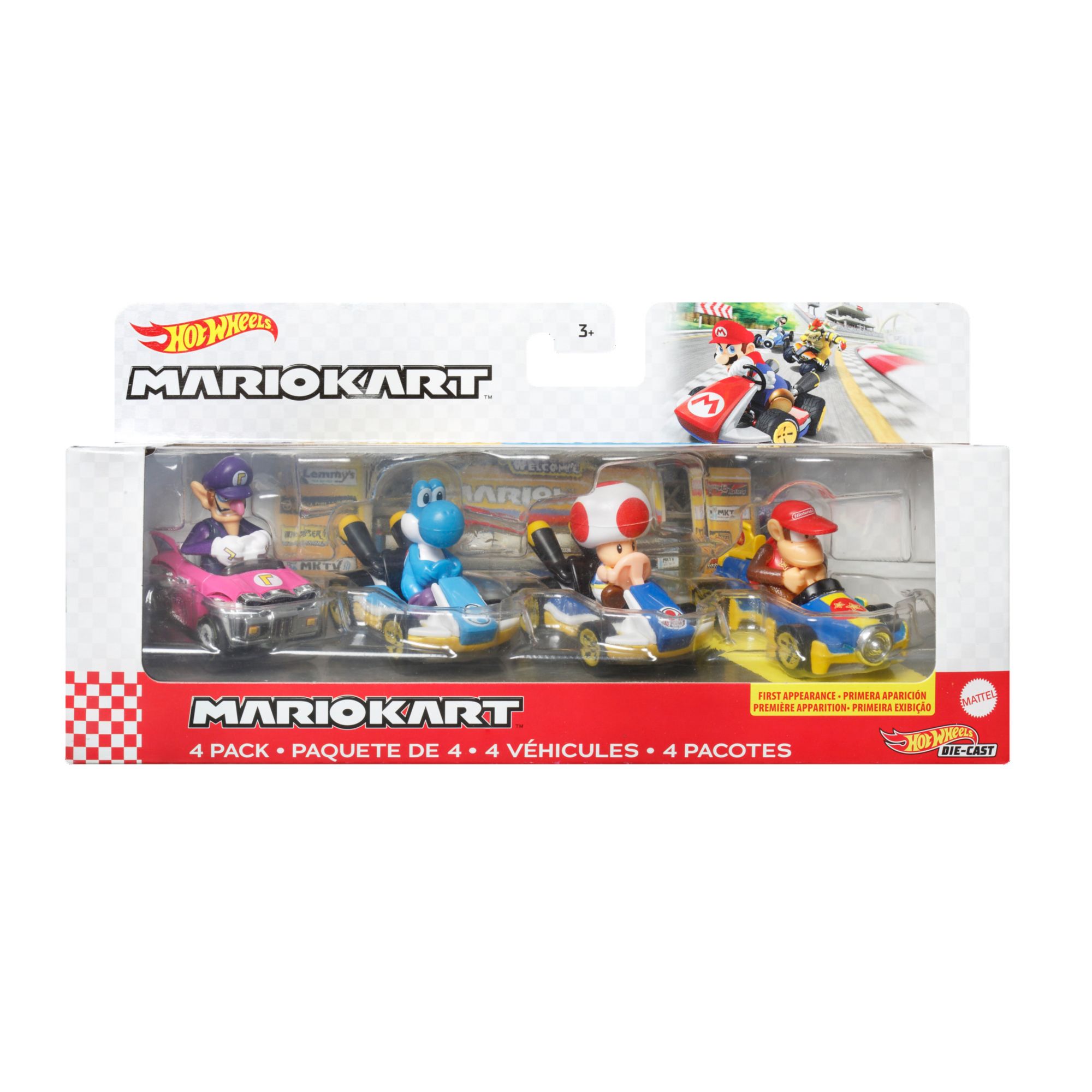 Kids can choose their favorite mix of Mario Kart character-inspired karts and speed off for racing and stunting madness with Hot Wheels Mario Kart four-packs. Each features four 1.64th scale Mario Kart die-cast vehicles, including one exclusive vehicle. The fan-favorite character karts perform on Hot Wheels track to let kids power up their imaginations by combining the thrill of Hot Wheels performance with the racing and thrills of Mario Kart. Offering an instant collection, these Mario Kart Hot Wheels vehicles make a great gift for collectors and fans ages three years and older. Each sold separately, subject to availability. Colors and decorations may vary.