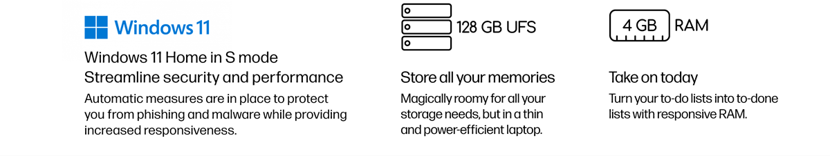 Windows 11 Home in S Mode - This HP laptop comes with the latest Windows 11 Home in S Mode operating system, providing a safe, secure, and easy-to-use environment. It offers features like Snap Layouts and Snap Groups for multitasking, direct access for quick access to important info, and a new Microsoft Store for a better app browsing experience.