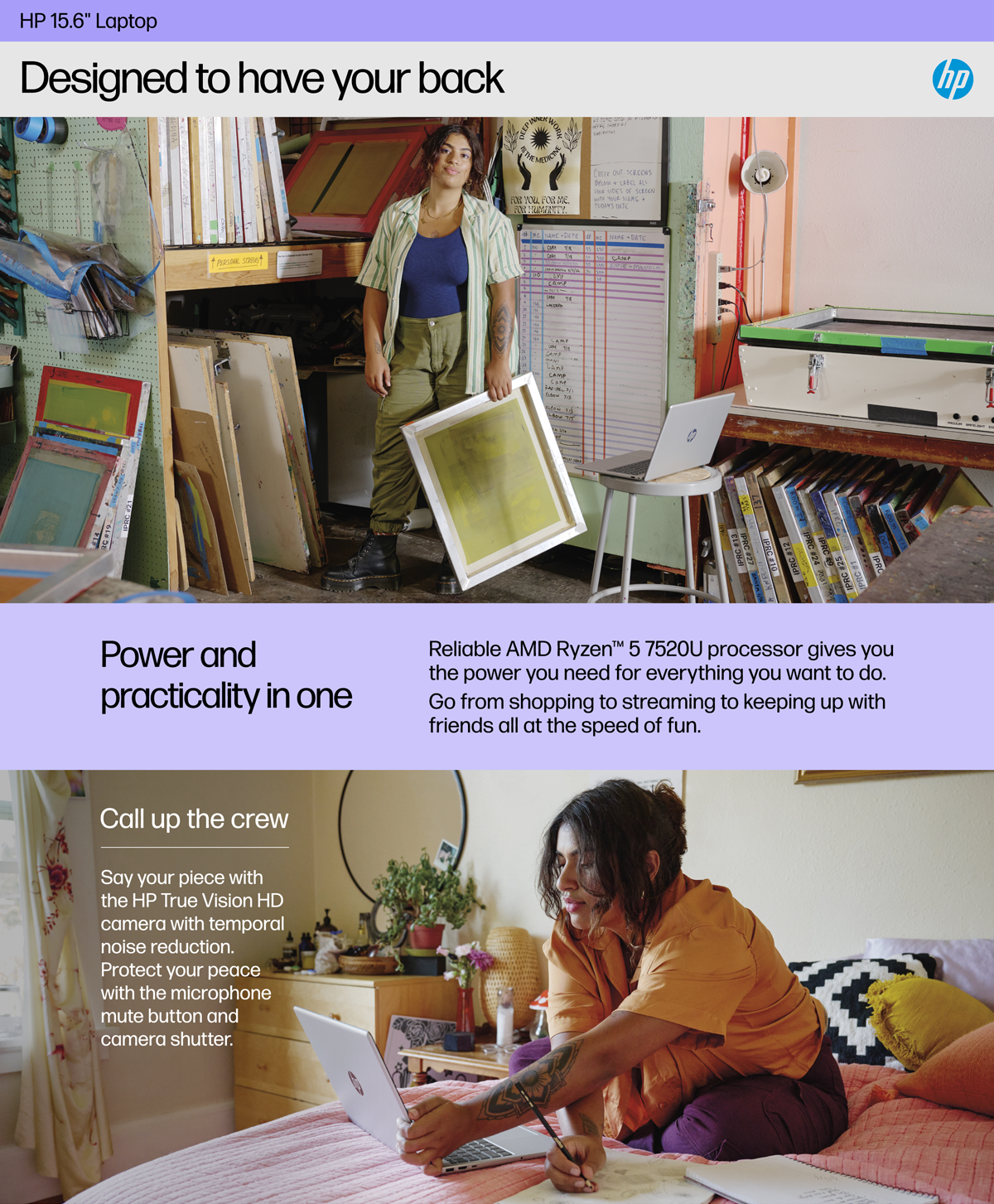 HP 15-FC0041 AMD Ryzen 5 7520U 512GB SSD 8GB 15.6" (1920x1080) WIN11 Natural Silver outfitted with a reliable AMD processor and AMD Radeon graphics. The HP 15" FHD Laptop is designed to have your back. Connect with others on your terms using a high-quality camera you can close when not in use, keeping you safe online. Be in charge of your busy day with long-lasting battery life and the quick charging feature.