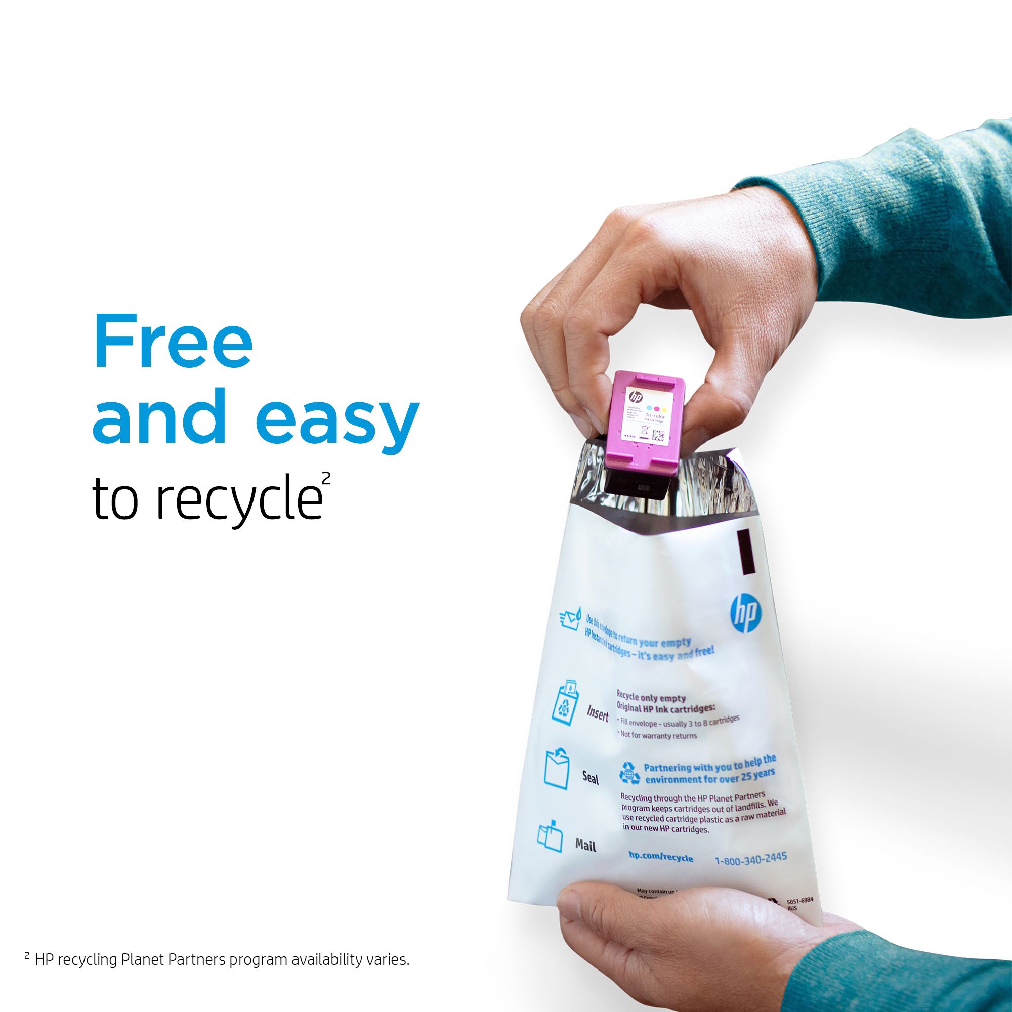 Recycling: Program availability varies. Original HP cartridge return and recycling is currently available in more than 60 countries, territories and regions in Asia, Africa, Europe, and North and South America through the HP Planet Partners program. For details, see hp.com/go/recycle.