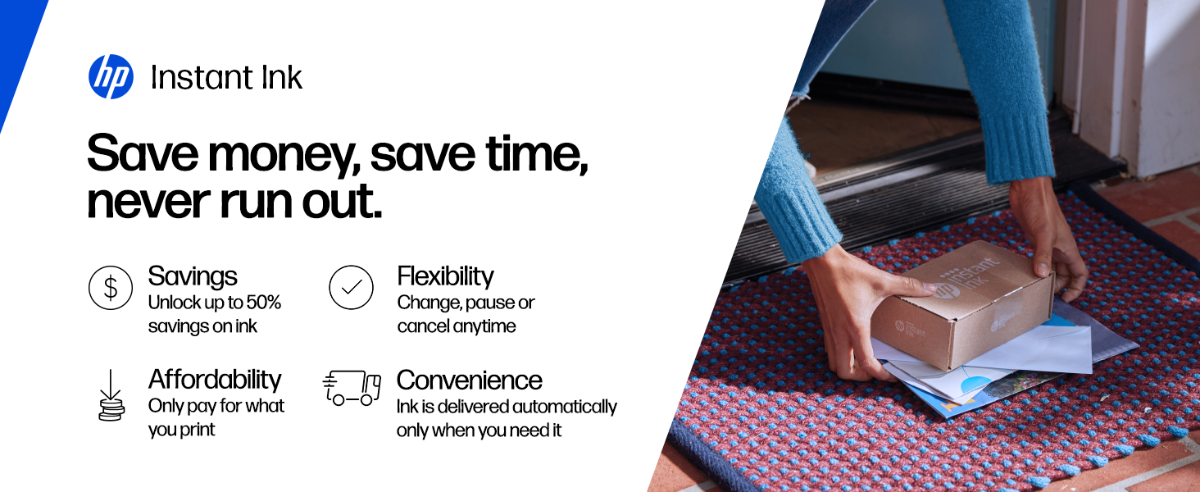 6 months of free Instant Ink: Unless the service is cancelled by you within the offer period online at hpinstantink.com, a monthly service fee, based on the plan chosen, plus tax and any applicable additional fee will be charged to your credit/debit card at the end of the offer period. HP Instant Ink signup must be completed for the applicable enrollment type (e.g. within 7 days of setting up an Instant Ink-enabled printer) as per the instructions that came with the printer. Use of in-box ink cartridge is included in the offer period. One offer is redeemable per printer and cannot be redeemed for cash. The offer is valid for enrollments prior to 12.31.2026. Offer may be combined with other offers; see terms and conditions of other offers for more details. Personal information (including name, postal address, email address, valid credit/debit card details) plus an internet connection to the printer are required to enroll in Instant Ink and activate the offer.