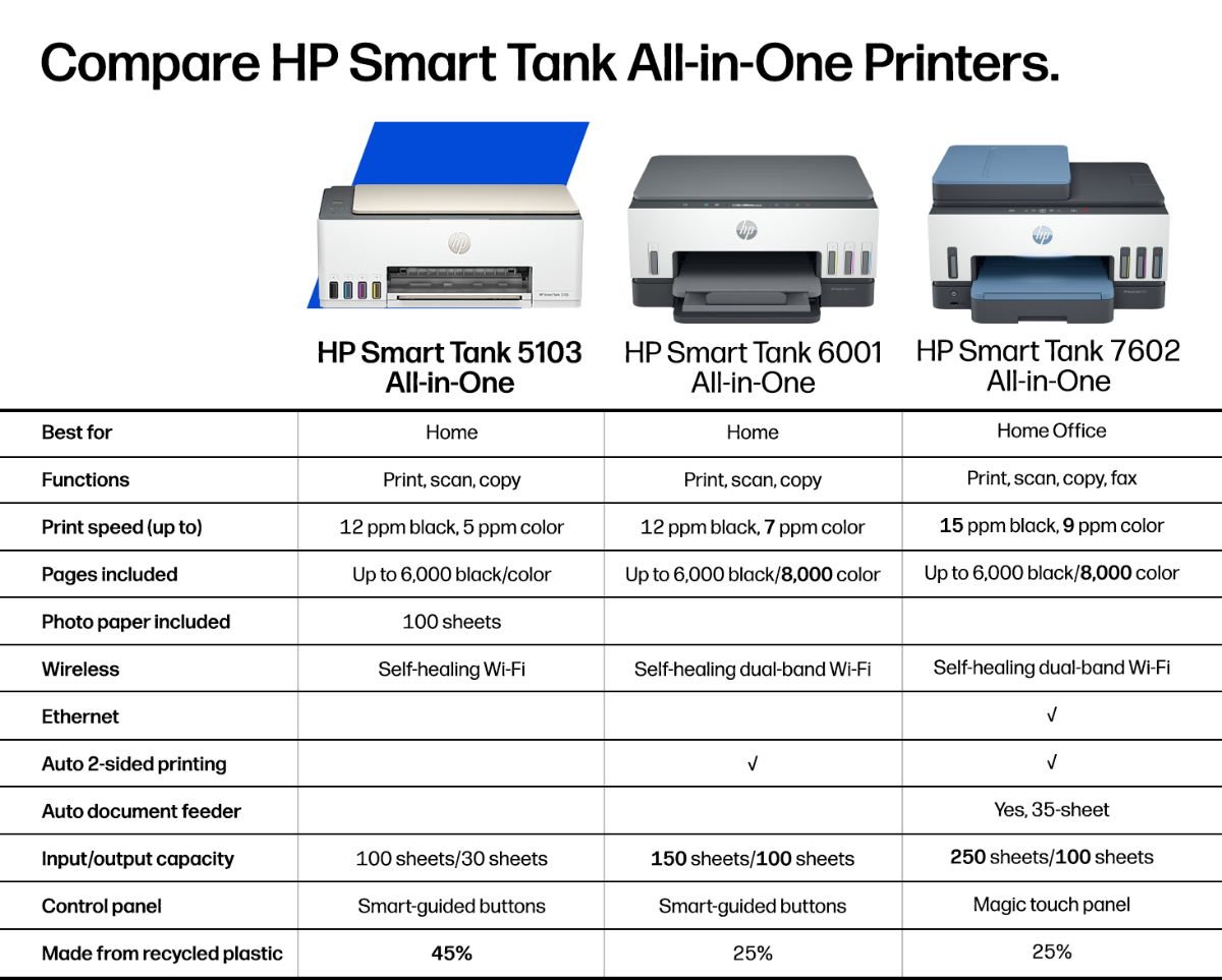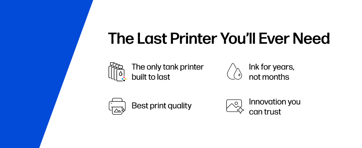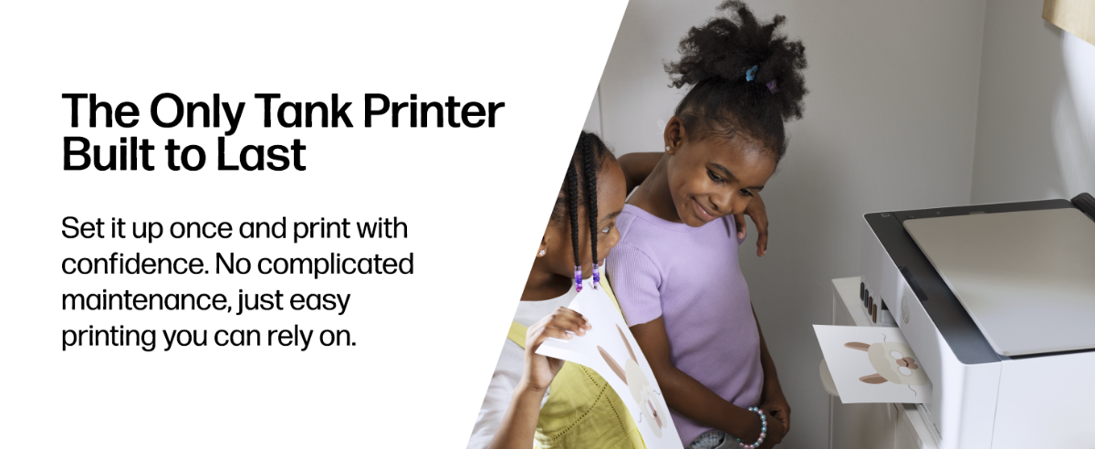 Easiest tank printer you'll ever use: Compared to the majority of in-class 3:1 and 4:1 duplex, wireless A4 ink tank printers under $500 USD. Printers selected by market share as reported by IDC Quarterly Hardcopy Peripherals Tracker–Final Historical CYQ3 2025. Claim based on publicly available information as of December 2025 and Keypoint Intelligence hands-on testing and study commissioned by HP in December 2025. For details: keypointintelligence.com/HPEasiesttoUseTank.