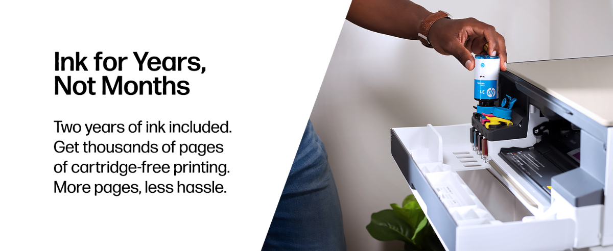 2 years of ink in the box: Based upon 150 pages per month of HP Smart Tank customers’ usage. Actual yield varies considerably based on content of printed pages and other factors. Average based on ISO/IEC 24711 or HP testing methodology and continuous printing. Some ink from included bottles is used to start up the printer. For details, see: www.hp.com/go/learnaboutsupplies.