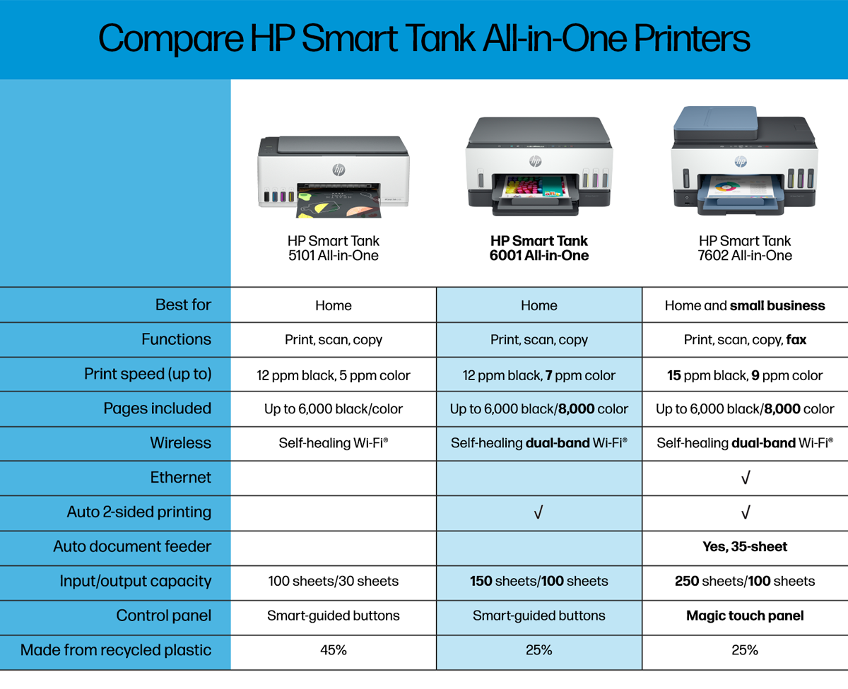 Easiest-to-use tank printers: Compared to the majority of in-class, 3:1 and 4:1 duplex, wireless A4 ink tank printers under $552 USD. Printers selected by market share as reported by IDC Quarterly Hardcopy peripherals Tracker-Final Historical CYQ3 2023. Claim based on publicly available information as of September 2023 and Keypoint Intelligence hands-on testing and study in September 2023 commissioned by HP. Details: www.keypointintelligence.com/HPEasiesttoUseTank.