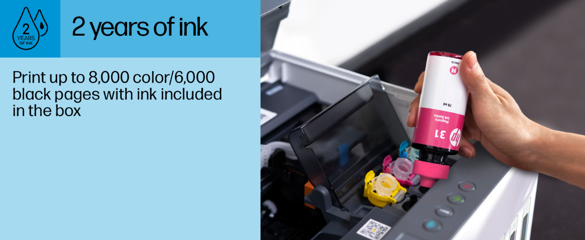 2 years of ink in the box: Based upon 200 pages per month of HP Smart Tank customers’ usage. Actual yield varies considerably based on content of printed pages and other factors. Average yield based on ISO/IEC 24711 or HP testing methodology and continuous printing. Some ink from included bottles is used to start up the printer. For details, see: www.hp.com/go/learnaboutsupplies.
