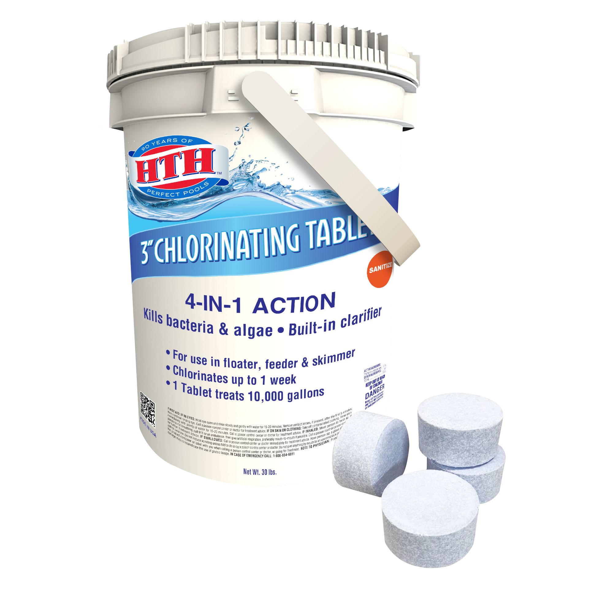HTH 3" Chlorine Tablets are a 4-in-1 action sanitizing tablet for swimming pools. These chlorine tablets kill bacteria and algae with a built in clarifier for sparkling clear water. One tablet treats 10,000 gallons and chlorinates up to one week. Tablets are also formulated to protect against chlorine loss in direct sunlight. For use in floater, feeder and skimmer.