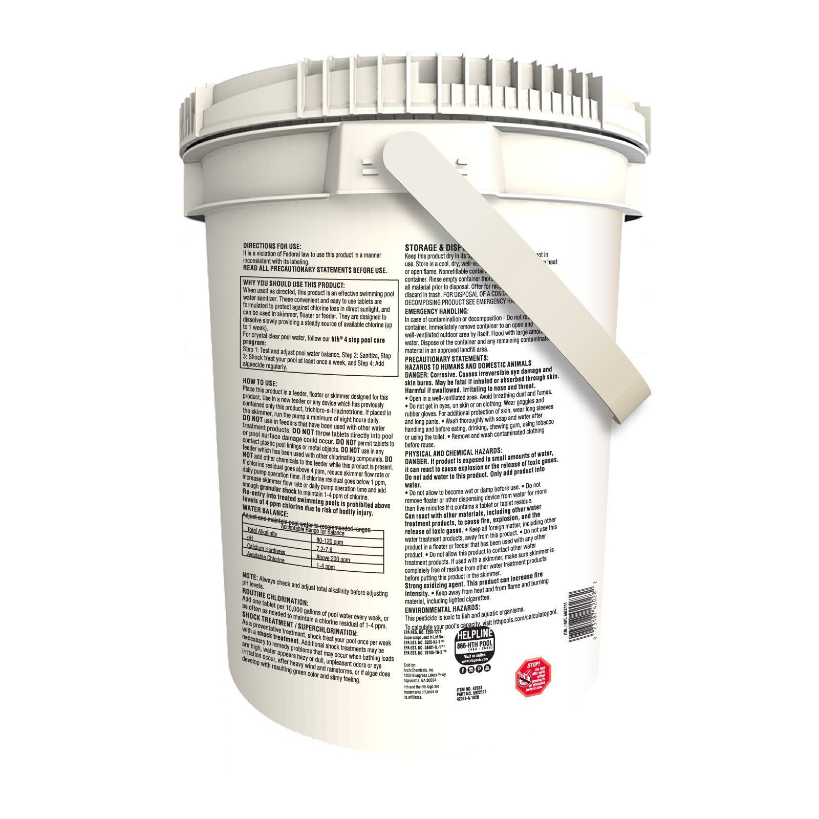 4-in-1 action Kills bacteria and algae with built in clarifier One tablet treats 10,000 gallons Chlorinates up to one week For use in floater, feeder and skimmer Formulated to protect against Chlorine loss in direct sunlight Includes 30 lbs. of 3" chlorinating tablets