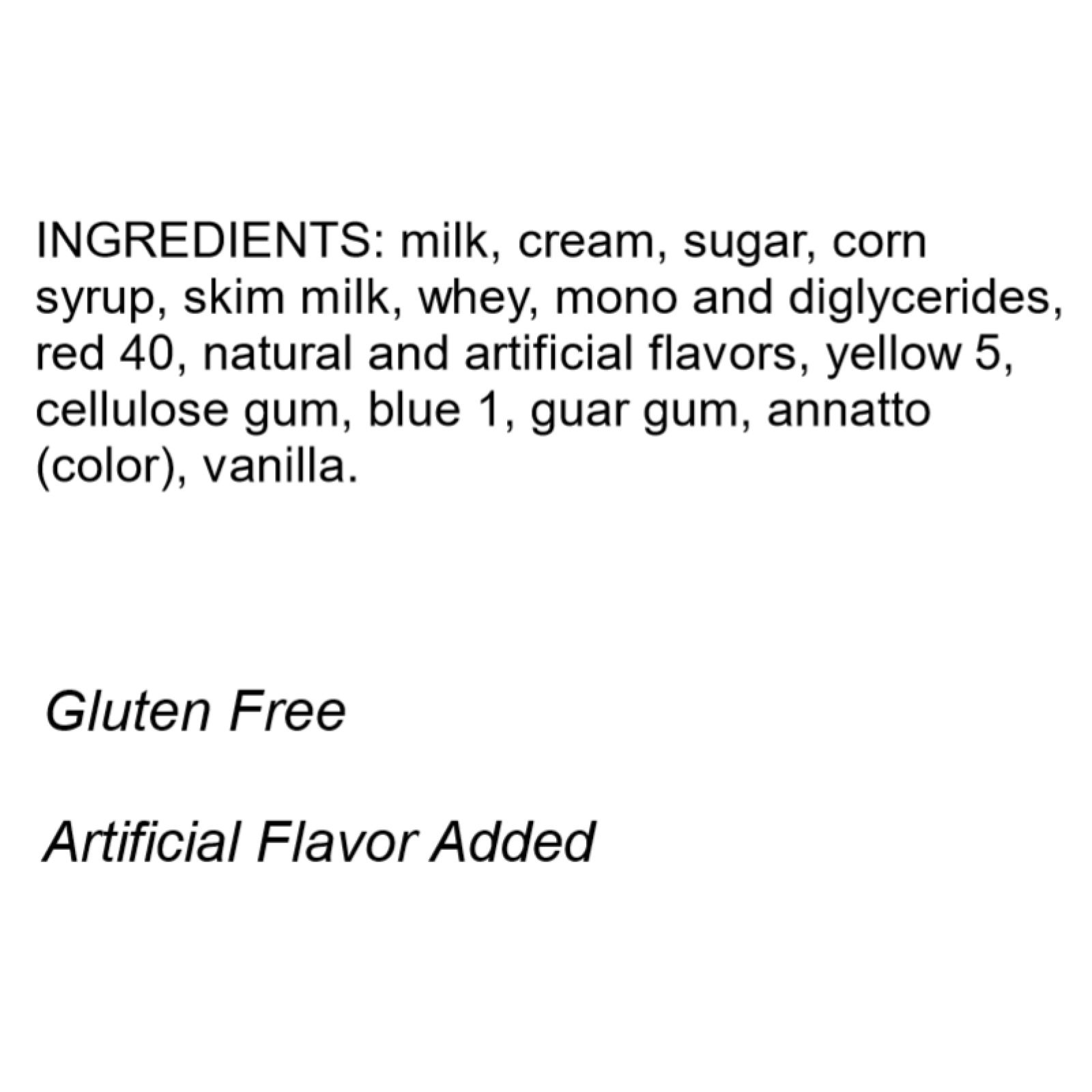 Milk, cream, sugar, corn syrup, skim milk, whey, mono and diglycerides, red 40, natural and artificial flavors, yellow 5, cellulose gum, blue 1, guar gum, annatto (color), vanilla.