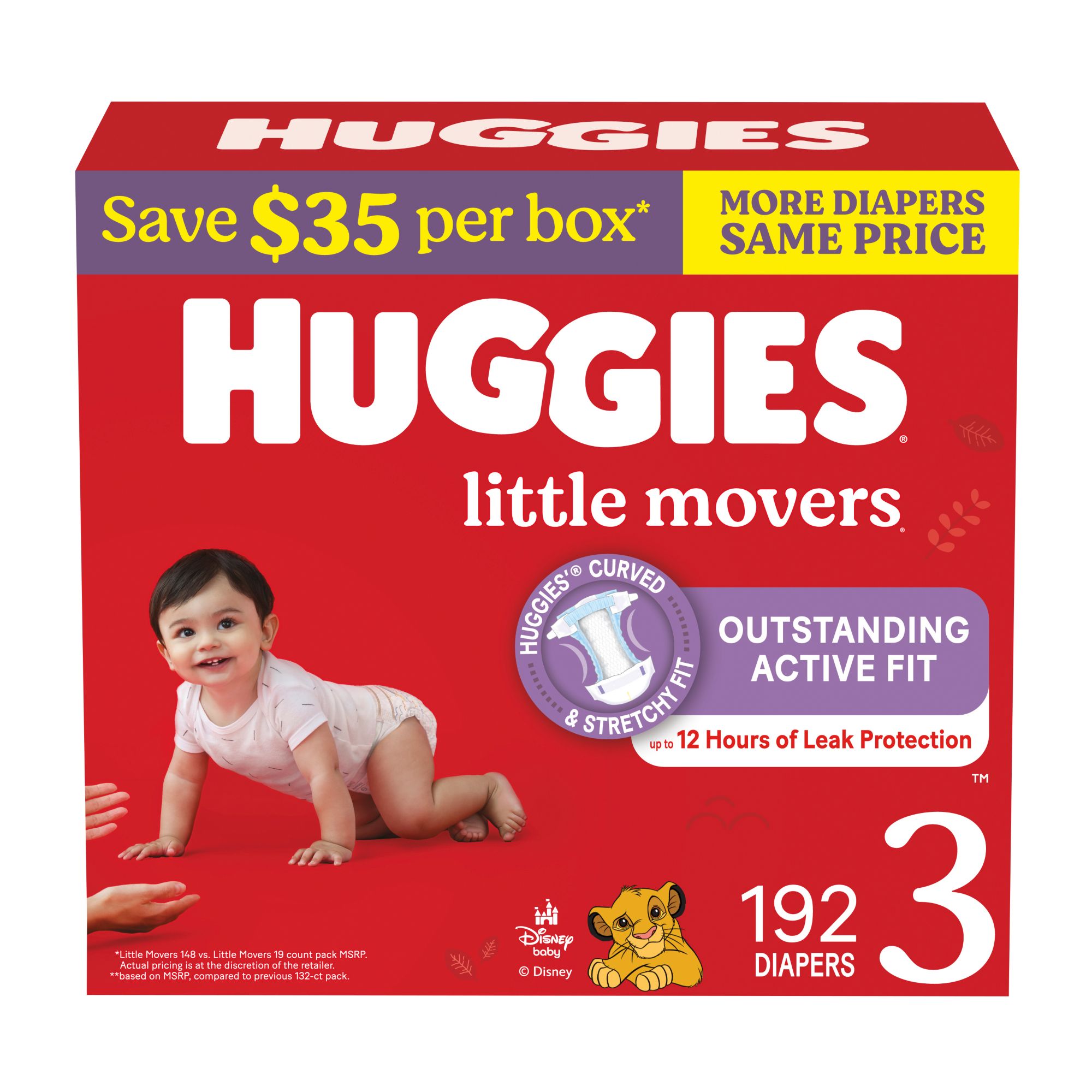 Up to Zero Leaks, Even from Blowouts: Huggies baby diapers have a curved and stretchy fit and are designed to help eliminate gaps at the legs and waist The Perfect Fitting Diaper: Huggies Little Movers Diapers are designed for worry-free running, jumping, and playing The Only Leading Brand Entirely Fragrance Free**: All Huggies diapers are free of fragrance and elemental chlorine and made without parabens or natural rubber latex Unique Waistband: Huggies Little Movers diapers come with a waistband that is designed to prevent leaks and help keep your baby comfortable while on the move For Babies on the Move: Double Grip Strips help provide a secure, flexible fit that moves with your baby Fast-Absorbing Dry Touch Liner helps the diaper lock away 99% of wetness to help keep skin dry Features Disney designs as cute as your baby; packaging may vary
