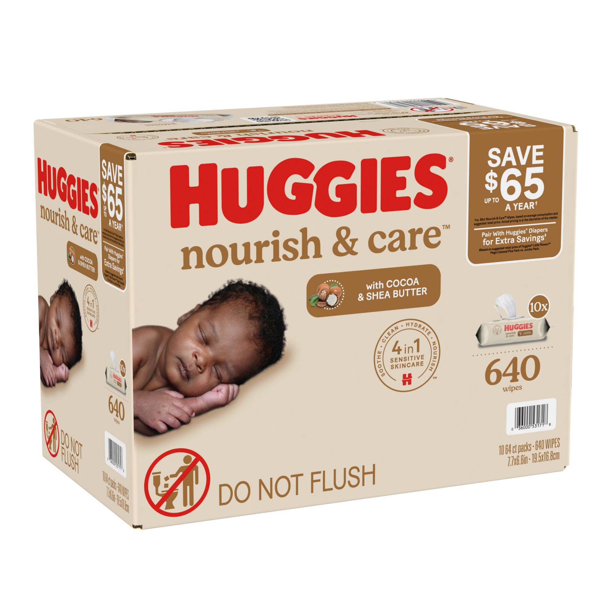 Huggies Nourish & Care Baby Wipes feature 4 in 1 Sensitive Skincare that allows you to clean, hydrate, nourish and soothe your baby's delicate skin. Infused with cocoa and shea butter ingredients, Nourish & Care scented wipes are 20% thicker** for a cloth-like feeling that cleans and moisturizes with every wipe. They’re also hypoallergenic, dermatologist-tested, pH-balanced and have reliably offered you plant-based ingredients since 1990 to help maintain healthy skin. Nourish & Care baby wipes are alcohol free, paraben free and do not contain phenoxyethanol or MIT. Indulge your baby with luxurious softness and feel confident you're giving them soft, smooth skin with every wipe. Plus, with a push-button feature and EZ Pull 1-Handed Dispensing, it’s easy to grab wipes without wasting sheets. Join Huggies Rewards+ powered by Fetch to get rewarded. Earn points on Huggies diapers and wipes, in addition to thousands of other products to redeem for hundreds of gift cards. Download the Fetch Rewards app to get started today.