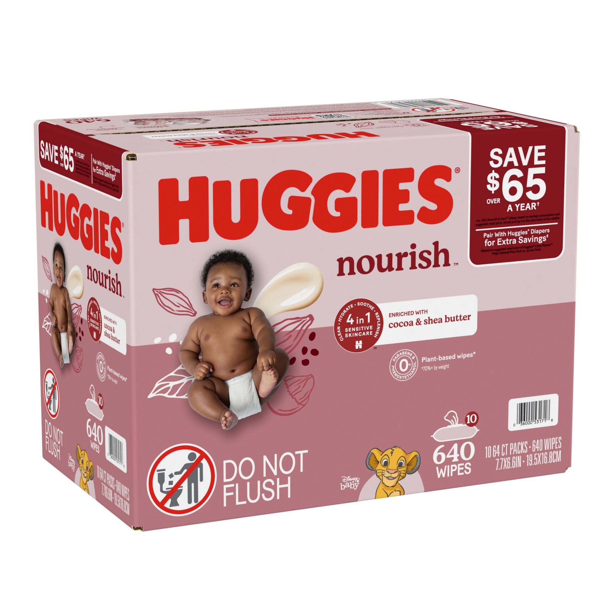 Huggies Nourish Baby Wipes feature 4-in-1 Sensitive Skincare that allows you to clean, hydrate, soothe and replenish your baby's delicate skin. Enriched with cocoa and shea butter, these baby wipes are hypoallergenic, dermatologist-tested, pH-balanced and have reliably offered you plant-based ingredients* since 1990. They are also alcohol free, paraben free and do not contain phenoxyethanol or MIT. Plus, with a push-button feature and EZ Pull 1-Handed Dispensing, it’s easy to grab wipes when your hands are full. Indulge your baby with luxurious softness and feel confident you're giving them soft, smooth skin with every wipe. Featuring Disney's The Lion King designs that are as cute as your baby, Huggies Nourish wipes are perfect to pair with your Huggies diaper! Join Huggies Rewards+ powered by Fetch to get rewarded. Earn points on Huggies diapers and wipes, in addition to thousands of other products to redeem for hundreds of gift cards. Download the Fetch Rewards app to get started today!