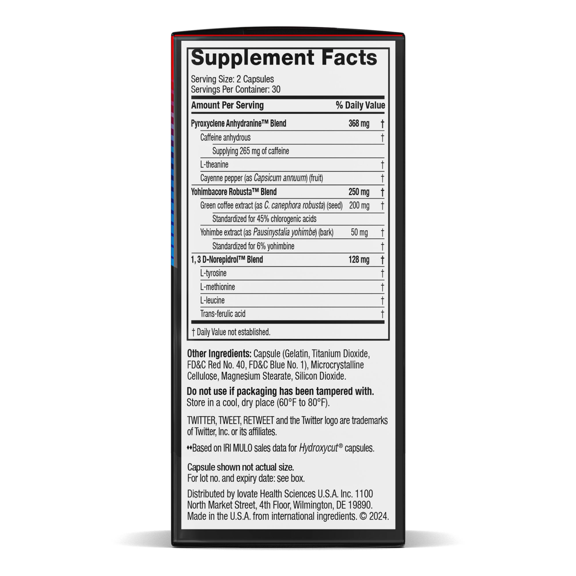 Ingredients: Proxyclene Anhydranine Blend: Caffeine Anhydrous, Supplying 270 mg of Caffeine, L-Theanine, Cayenne Pepper (as Capsicum Annuum) (Fruit), Yohimbacore Robusta Blend: Green Coffee Extract (as C, Canephora Robusta) (Seed), Standardized for 45% Chlorogenic Acids, Yohimbe Extract (as Pausinystalia Yohimbe) (Bark), Supplying Yohimbine, 1, 3 D-Norepidrol Blend: L-Tyrosine, L-Methionine, L-Leucine, Trans-Ferulic Acid. Other Ingredients: Capsule (Gelatin, Titanium Dioxide, FD&C Red 40, FD&C Blue 1), Microcrystalline Cellulose, Magnesium Stearate, Silicon Dioxide.