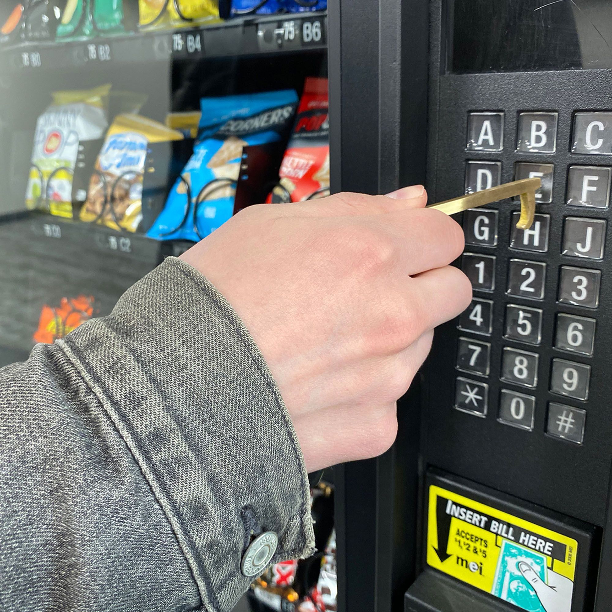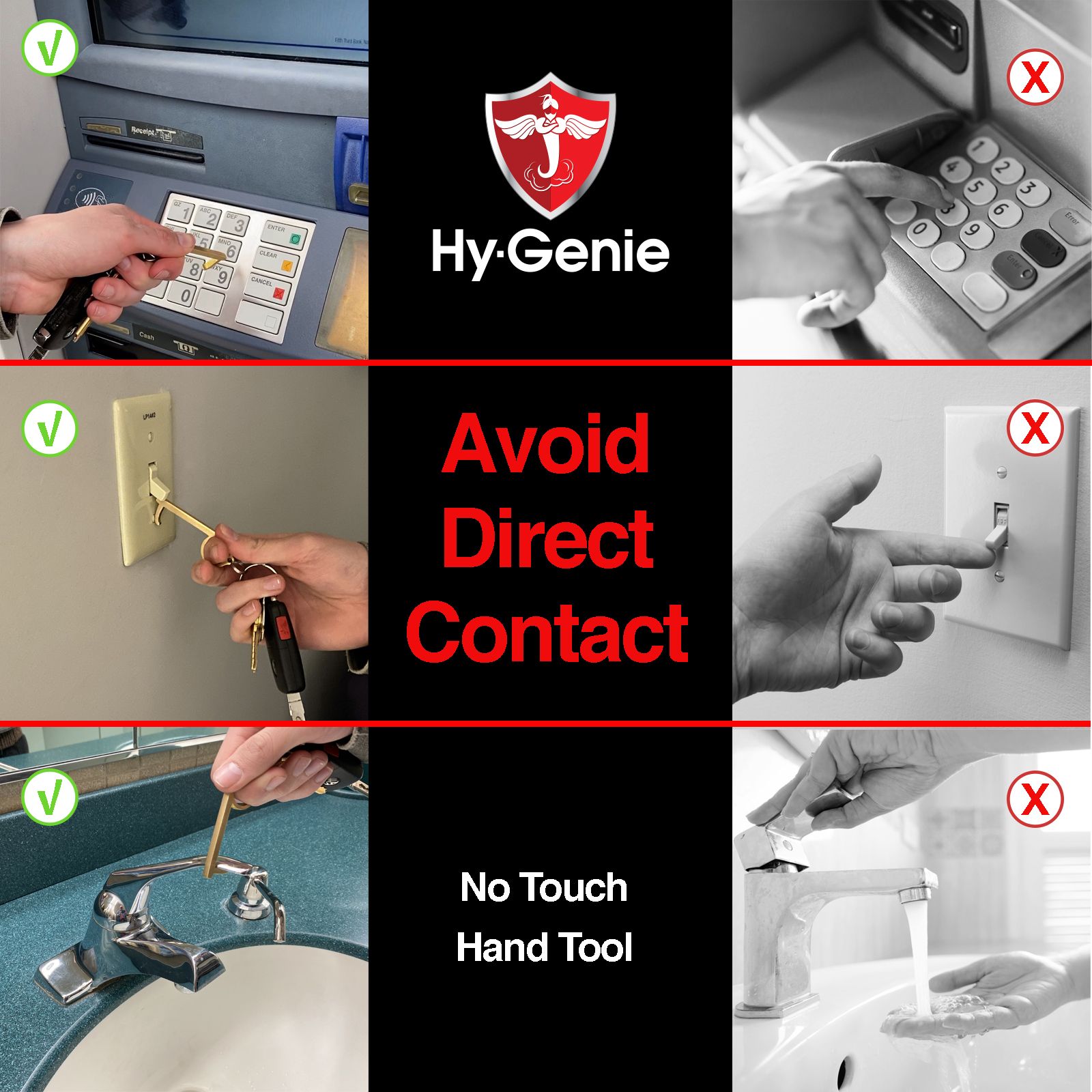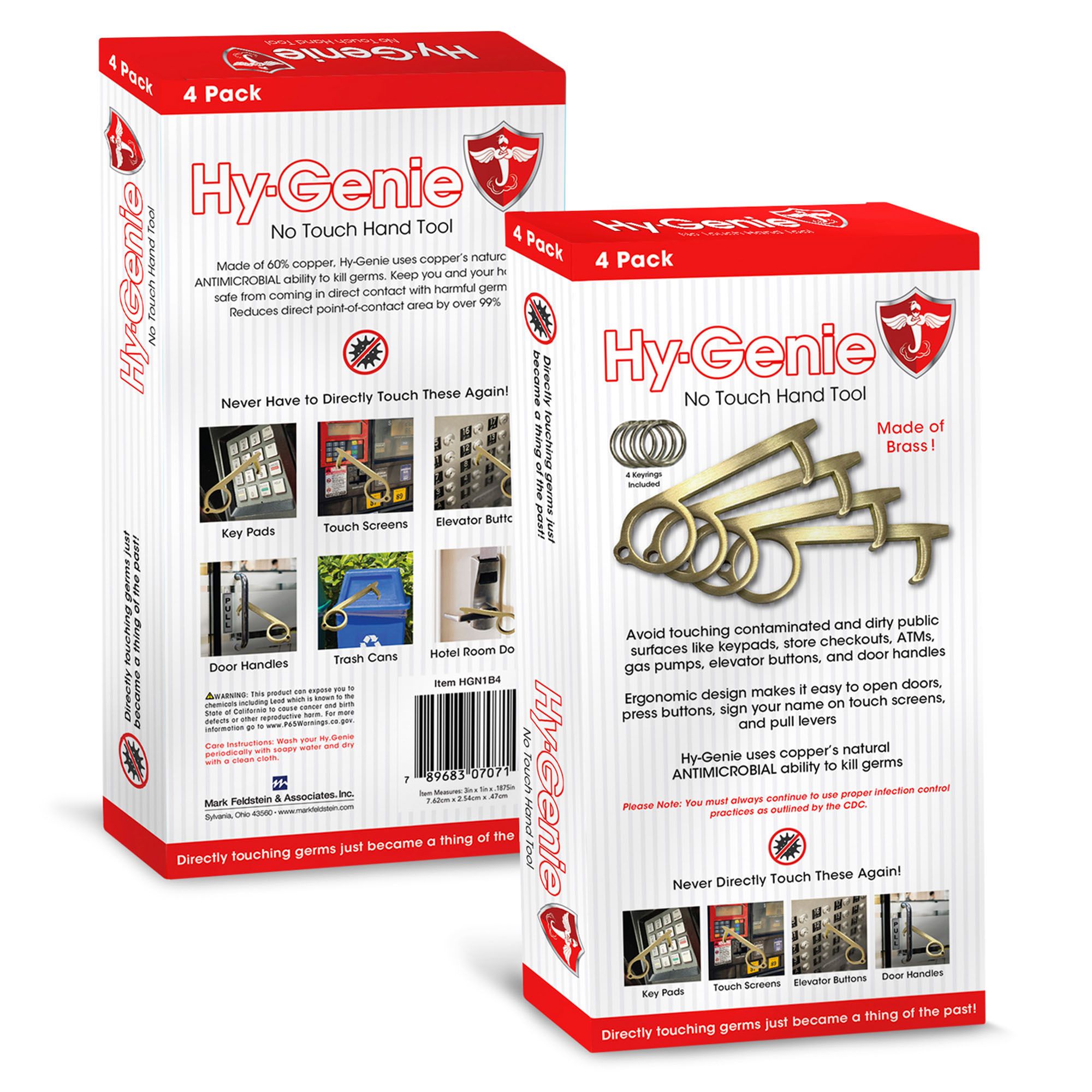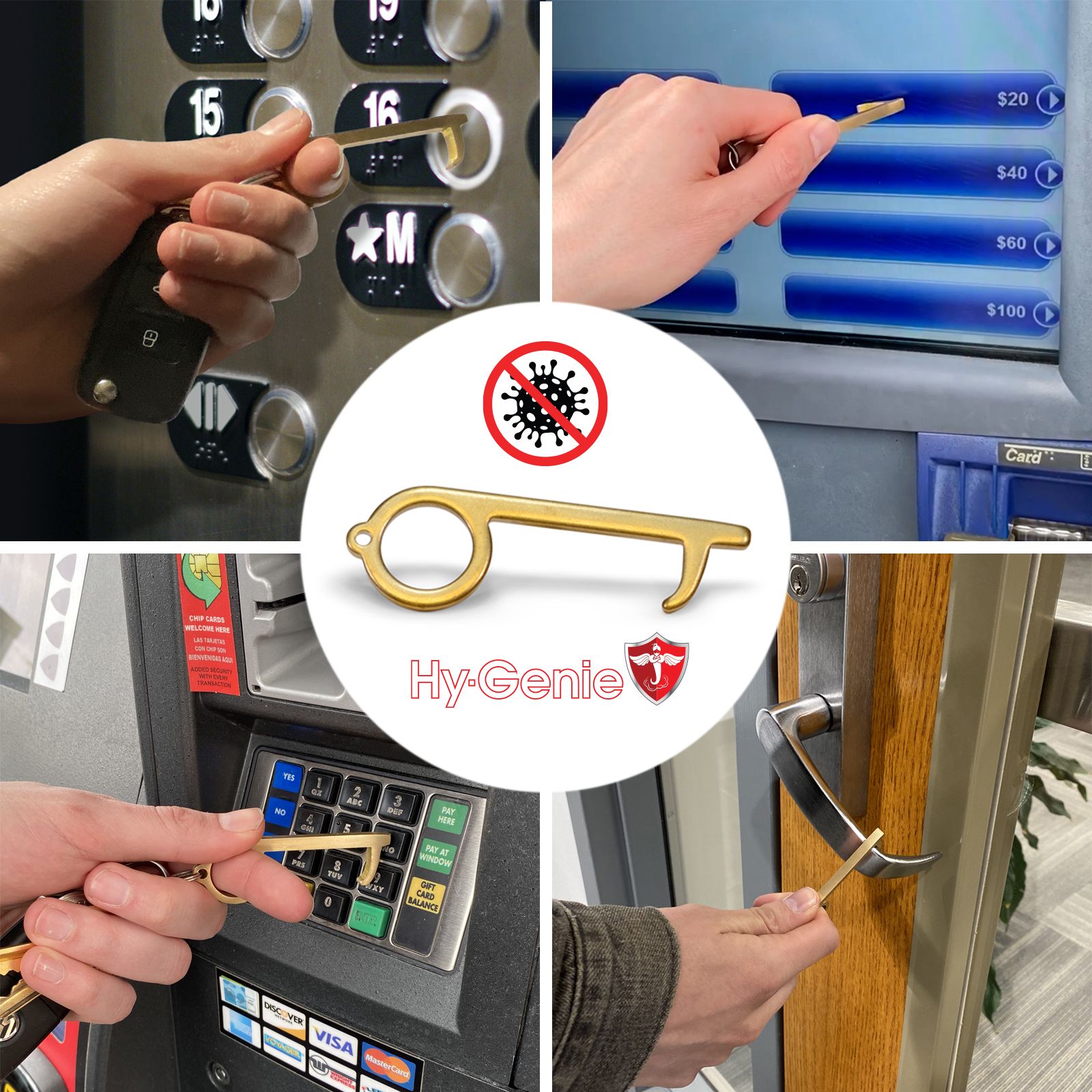 Looking for a way to avoid touching contaminated and dirty public surfaces like, key pads, store checkouts, ATMs, elevator buttons, and door handles? Made of 60% copper, our Hy-Genie No Touch Hand Tool uses copper’s natural ANTIMICROBIAL ability to kill germs. In addition, its ergonomic design reduces direct point-of-contact areas by over 99%, making it very easy to press buttons, open doors, sign your name on touch screens, and pull levers. It’s “safe” to say, our one-of-a-kind Hy-Genie No Touch Hand Tool will make directly touching germs a thing of the past! Four HyGenies included in each pack.