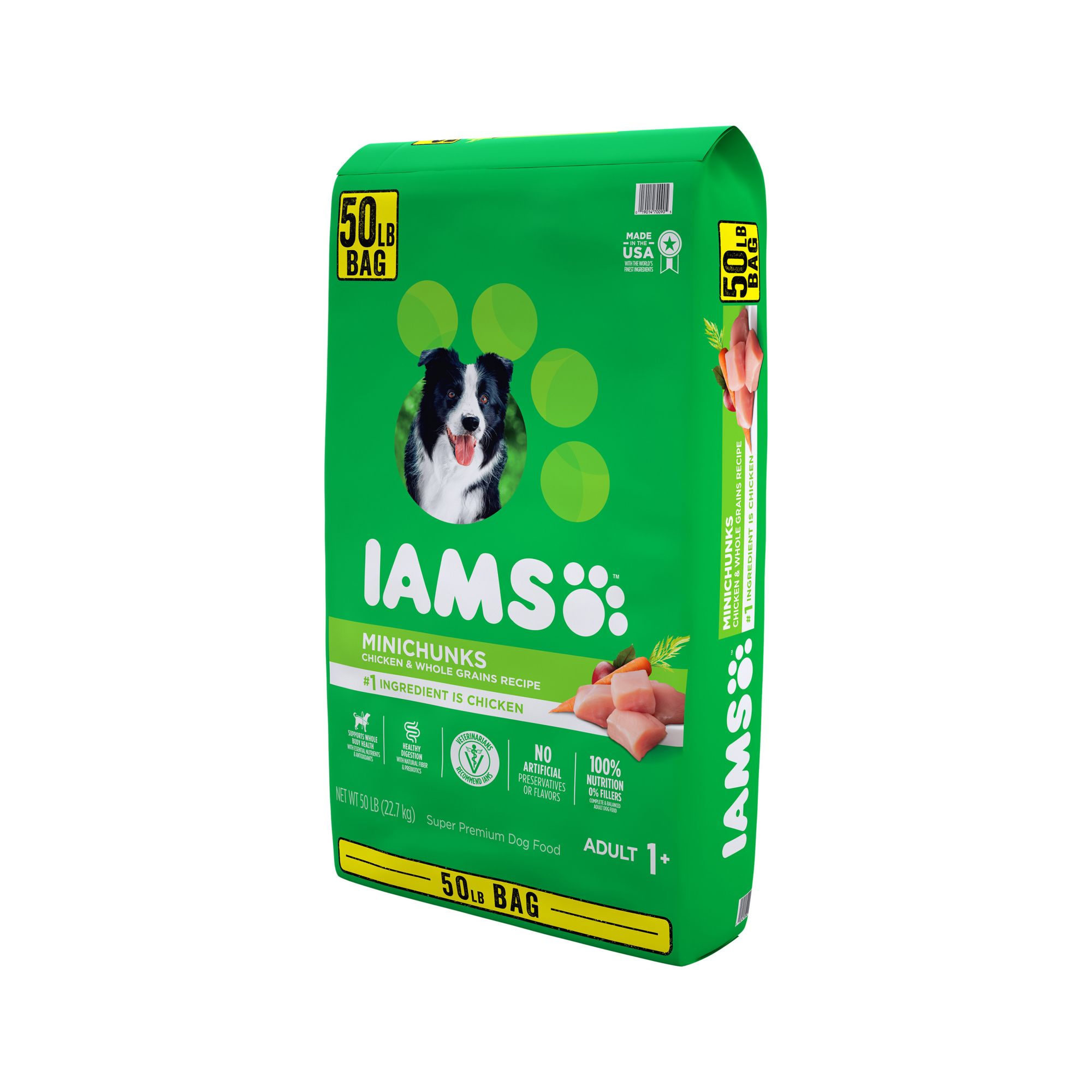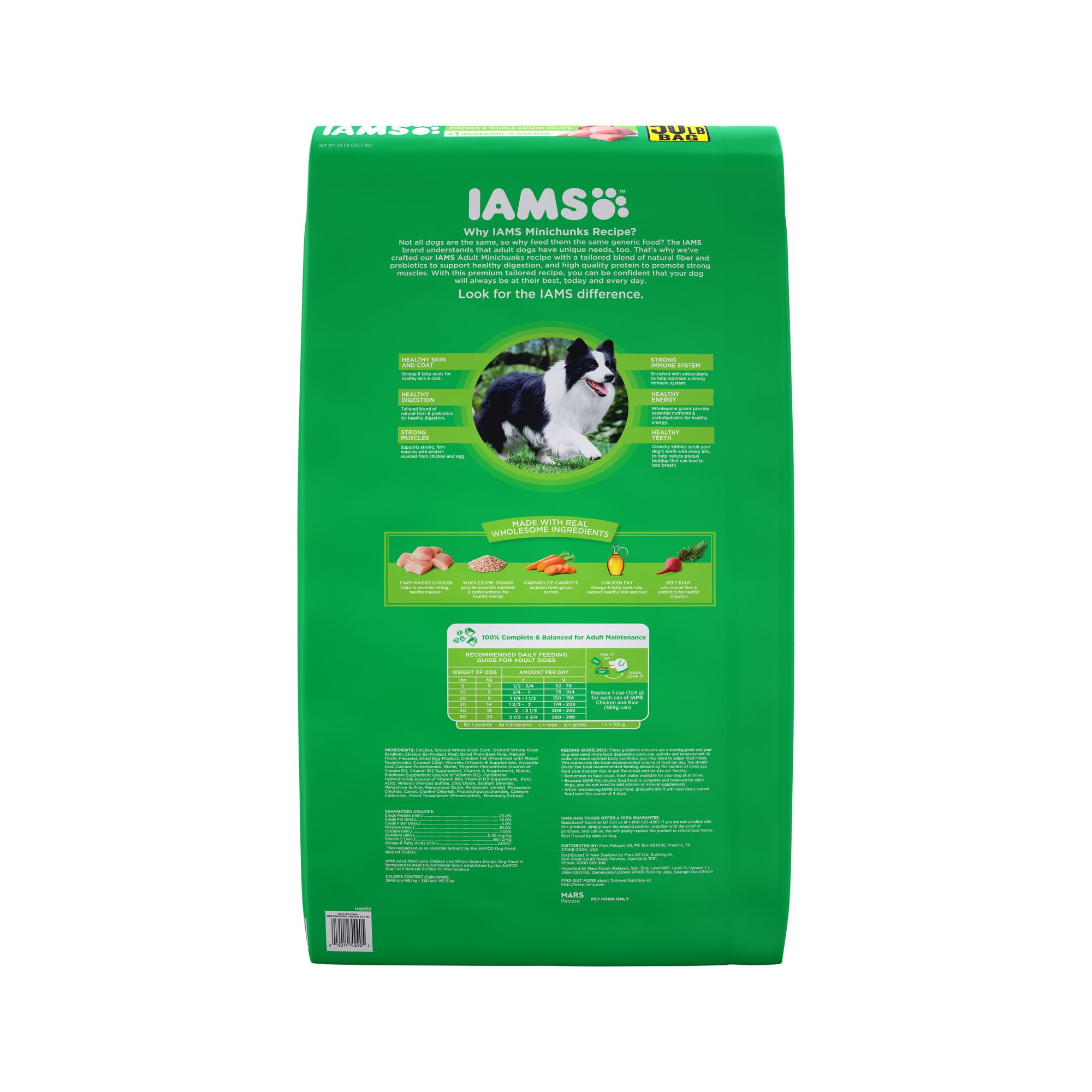 IAMS Minichunks adult dry dog food nourishes your active dog with essential nutrients and probiotics for a healthy body inside and out, in a smaller-sized tasty kibble he or she will love.