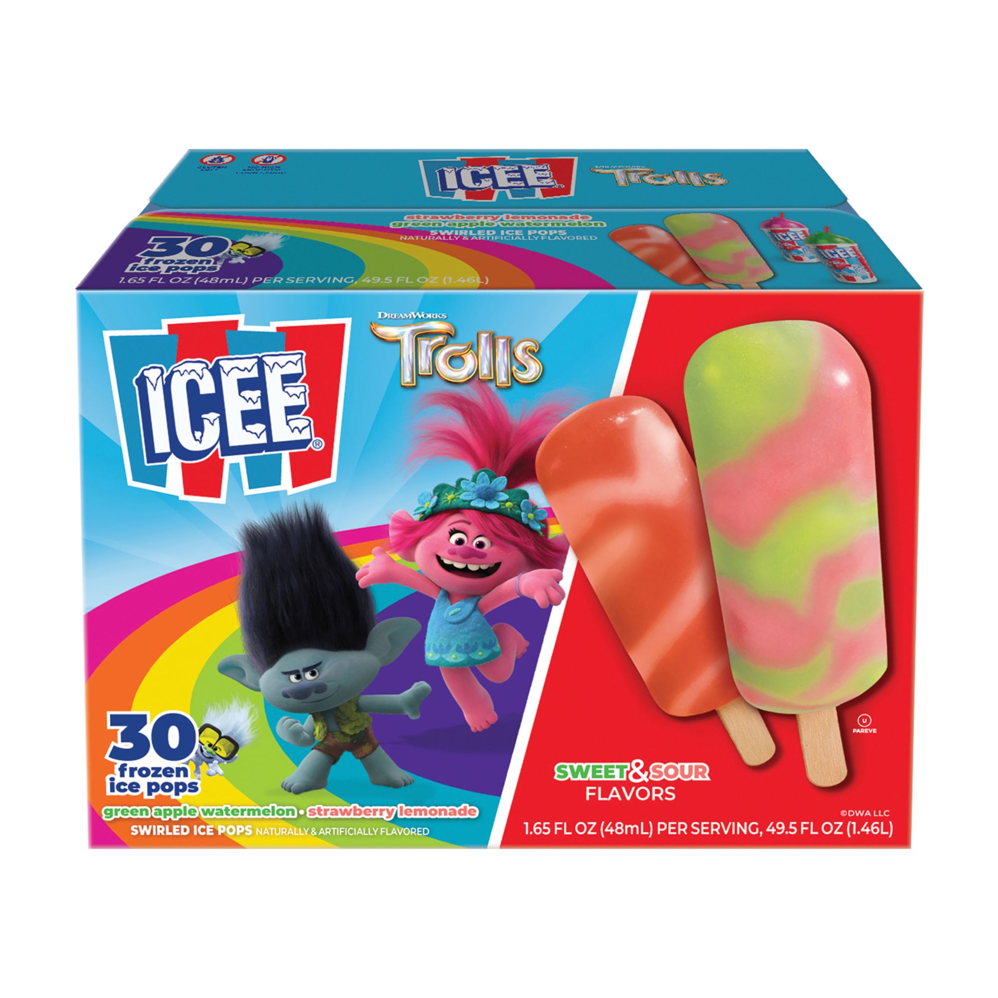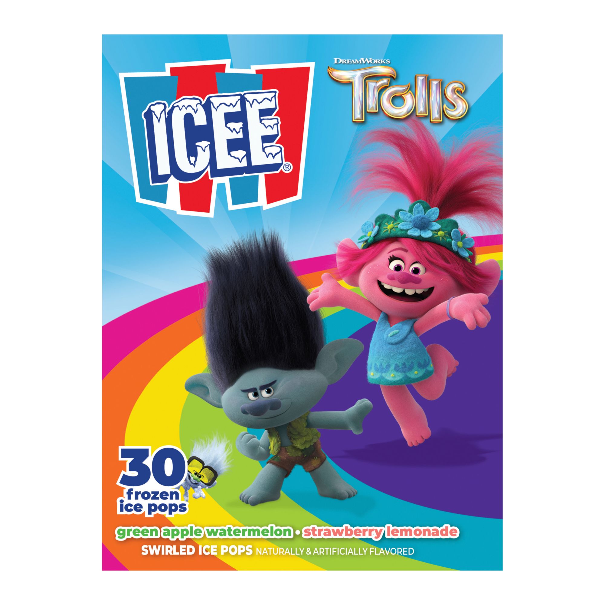 ICEE Trolls sticks are kicking up the fun a notch with sweet and sour frozen ice pop flavors that everyone will enjoy! This swirled variety pack includes green apple watermelon and strawberry lemonade flavored ice pops. Each pop has only 35 calories and offers the coolest excuse to feel like a kid again.