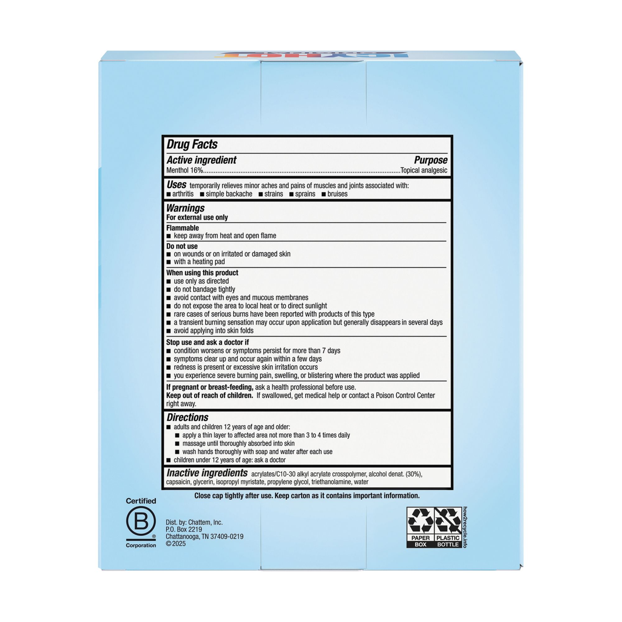 Ingredients: Menthol, Acrylates/c10-30 Alkyl Acrylate Crosspolymer, Capsaicin, Glycerin, Isopropyl Myristate, Propylene Glycol, Sd Alcohol 40 (30%), Triethanolamine, Water.