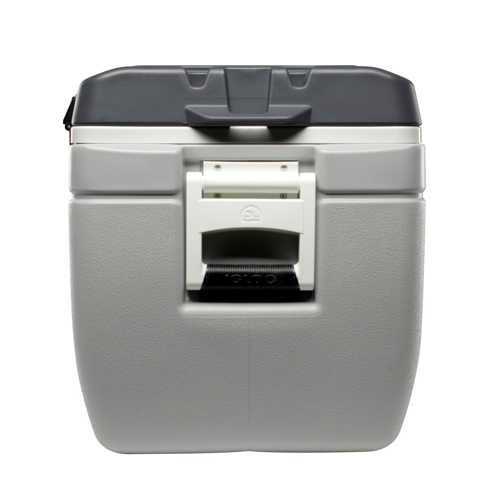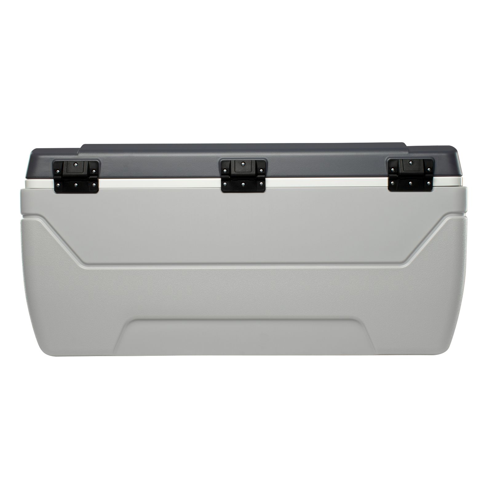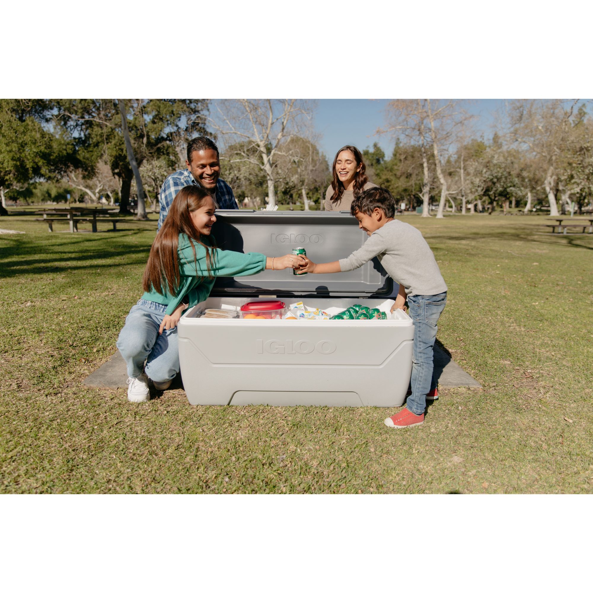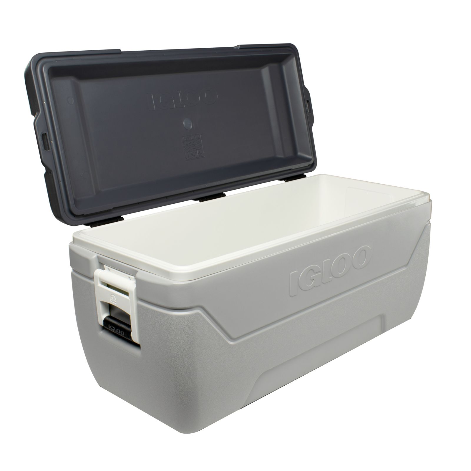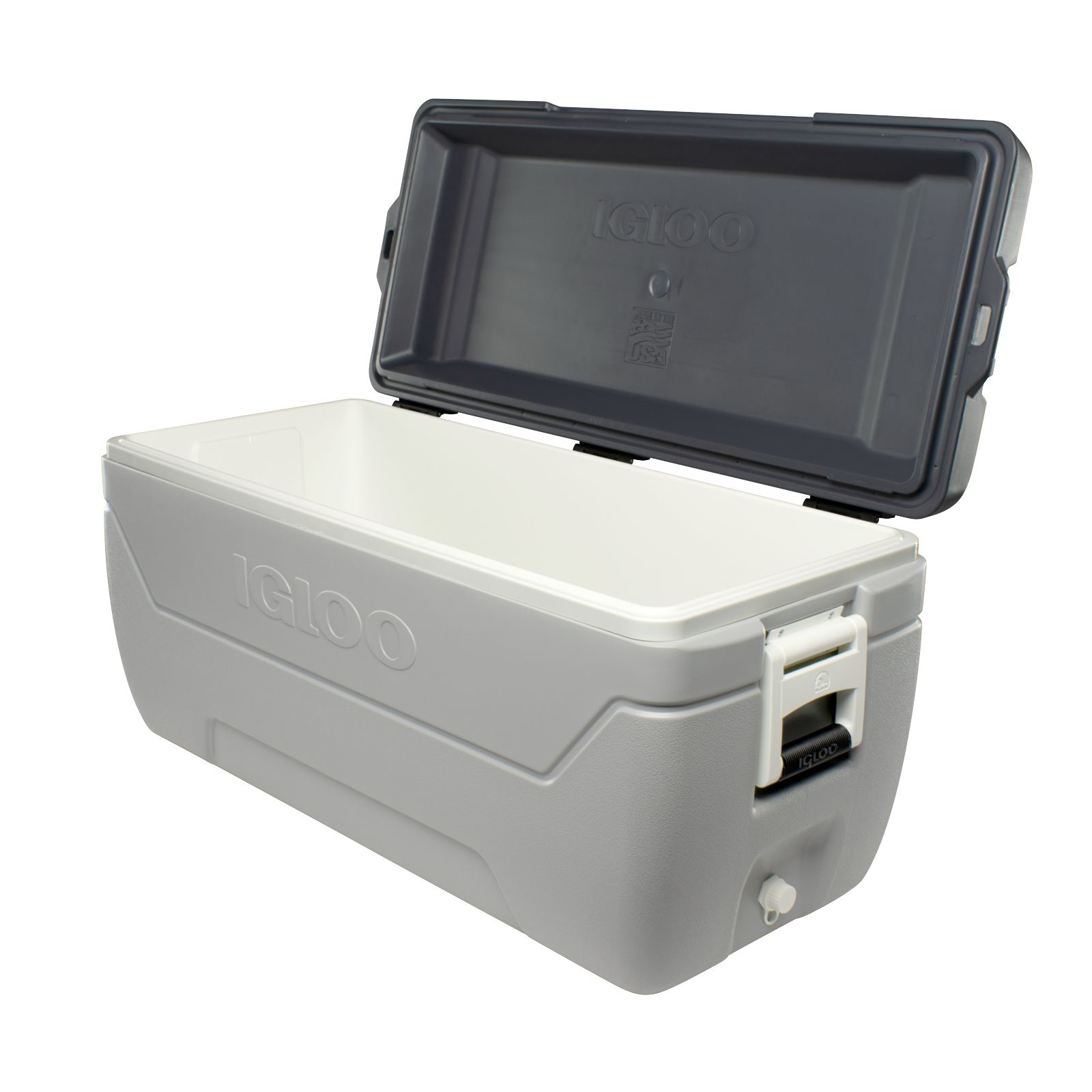 Color exclusive to BJ's 152 qt. cooler with seven-day ice retention Oversized hinges engineered for strength and long-lasting performance with a Stay Open Detent Foamed lid with fish rulers for the Sportsman, Cupholders for the event planners, and tie-down loops for secured transportation Comfort grip carry handles Threaded drain plug for garden hose hookups and remote draining Includes Igloo MaxCold 152-qt. cooler in ash gray/carbonite