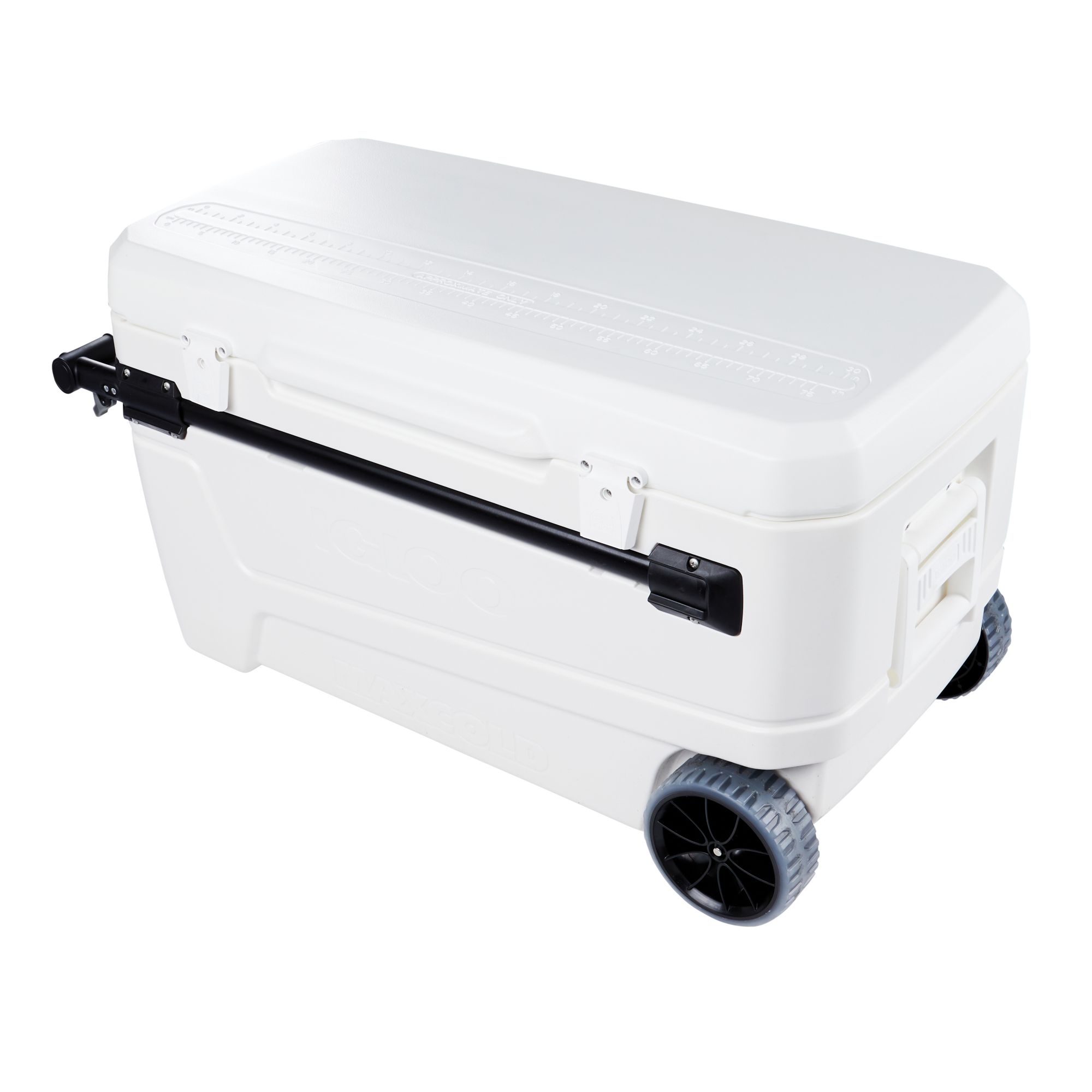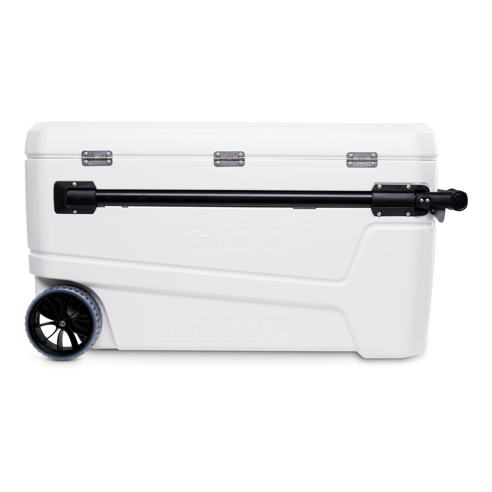 Keep your hands free with this classic 110 qt. cooler. Equipped with MaxCold Technology and a horizontal telescoping handle, the Sunset Glide roller cooler will easily take you where you want to go while keeping everything ice cold. Glide slide-and-lock horizontal handle technology provides better leverage and reduces the lifting load by 50%.