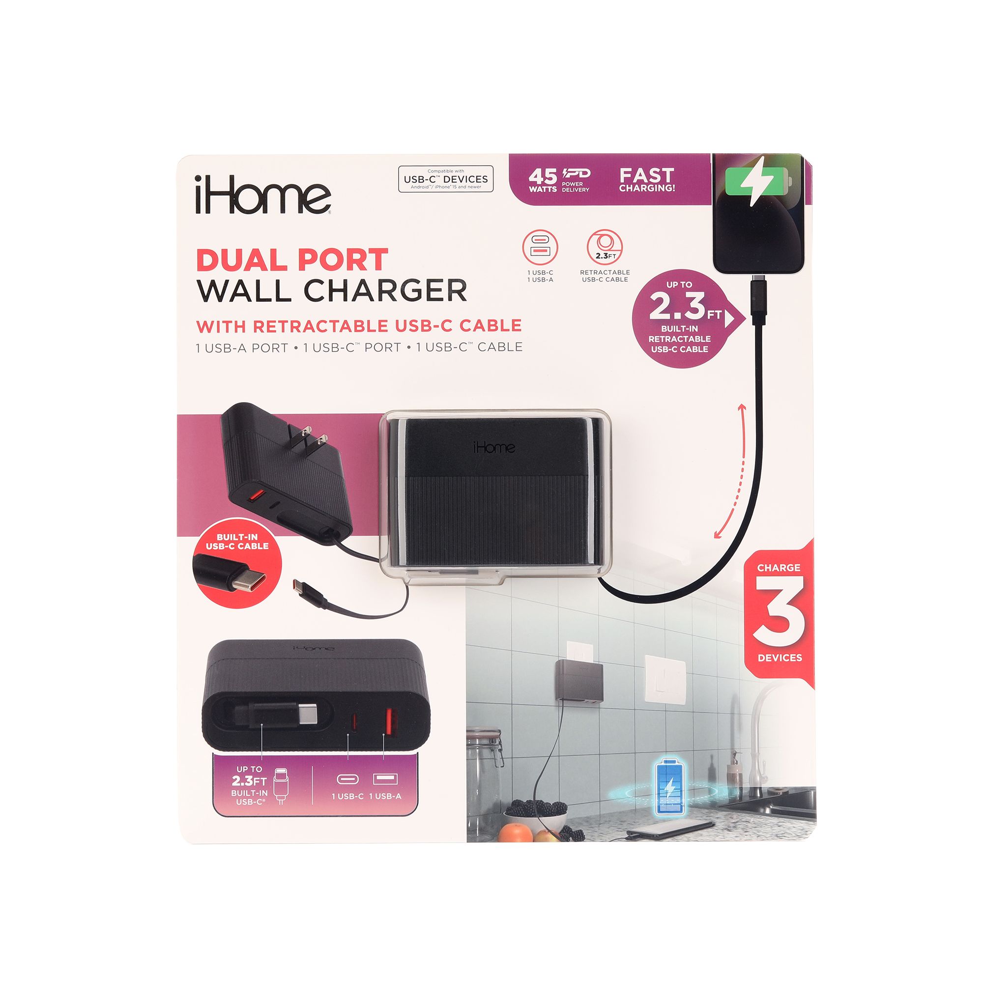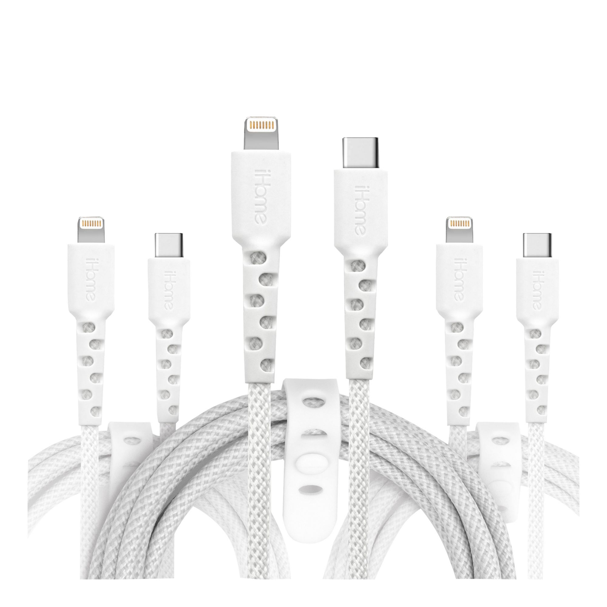 iHome TPE Durastrain Lightning to USB-C Nylon Braided Charging Cable with Silicone Wrap, 3 pk.