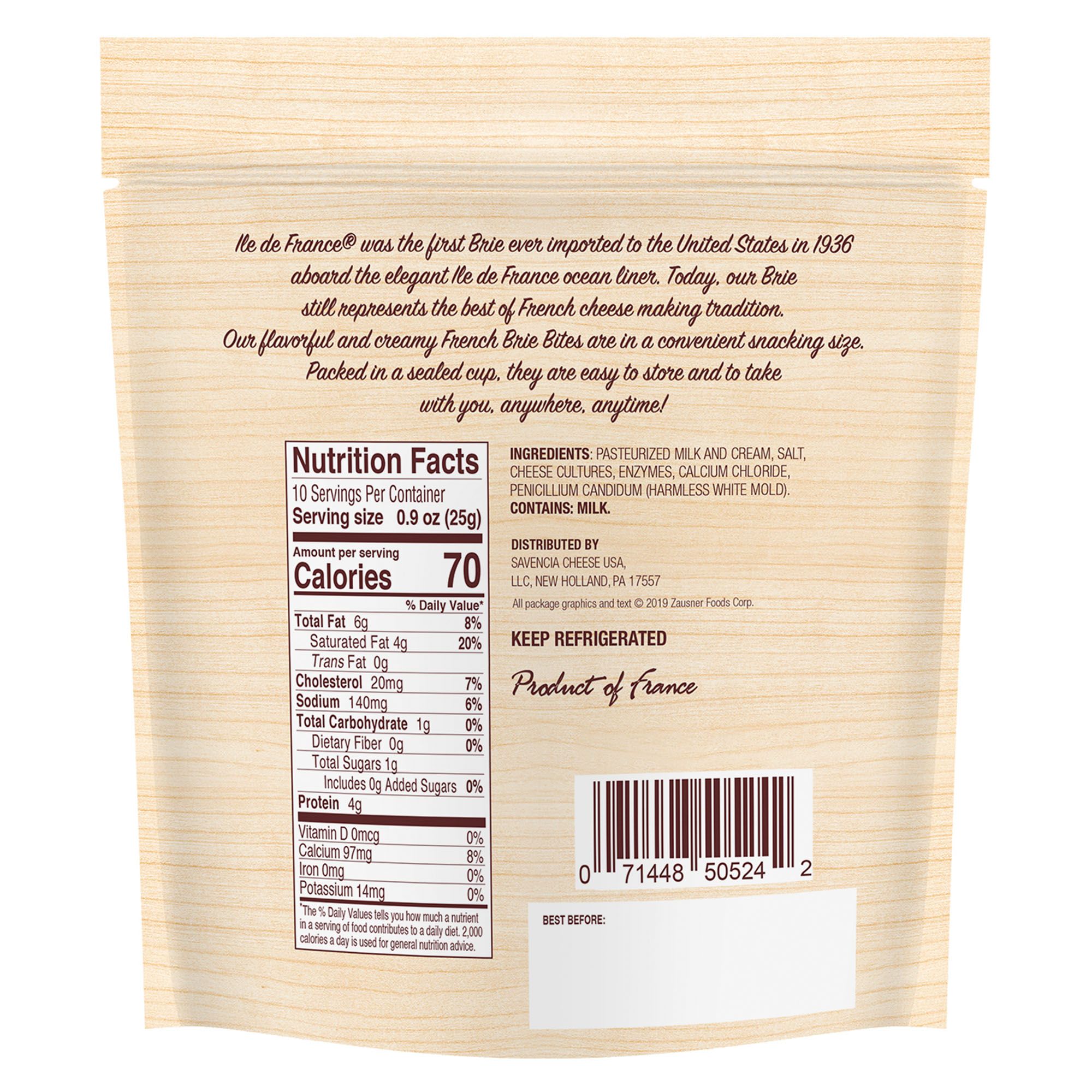 Ile de France was the first Brie ever imported to the United States in 1936 aboard the elegant Ile de France ocean liner. Today, this Brie still represents the best of French cheese making tradition. Ile de France Brie Bites are a buttery cheese with fresh, milky notes and a touch of hazelnut and mushroom. These perfect little bites are packed with protein and are perfect to throw in a lunch box or for an afterschool snack. For adults, one or two bites are the perfect treat with a glass of dry white wine or use the whole bag as part of the perfect cheese board.