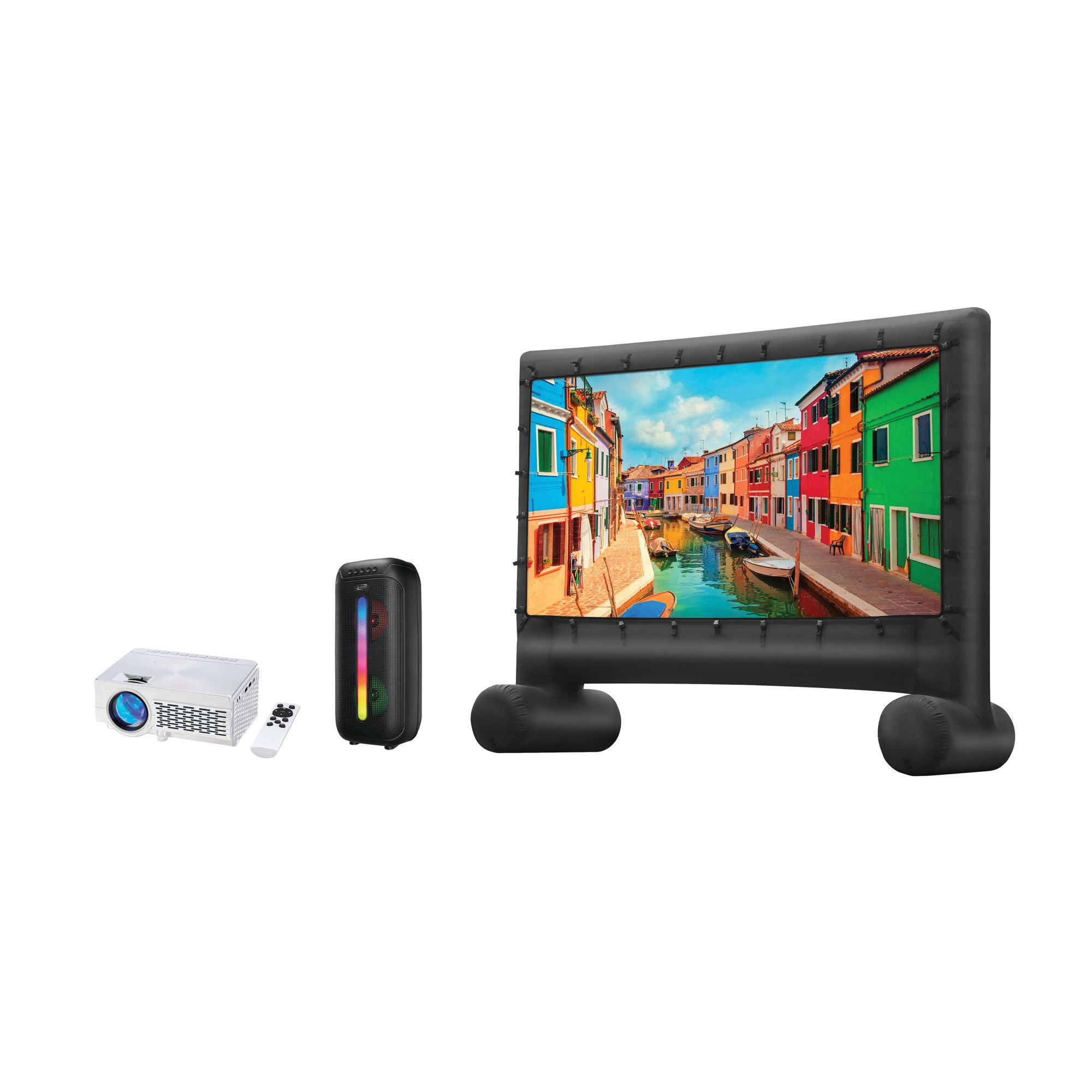 Includes Projector with Bluetooth transmitter, inflatable screen, Bluetooth party speaker