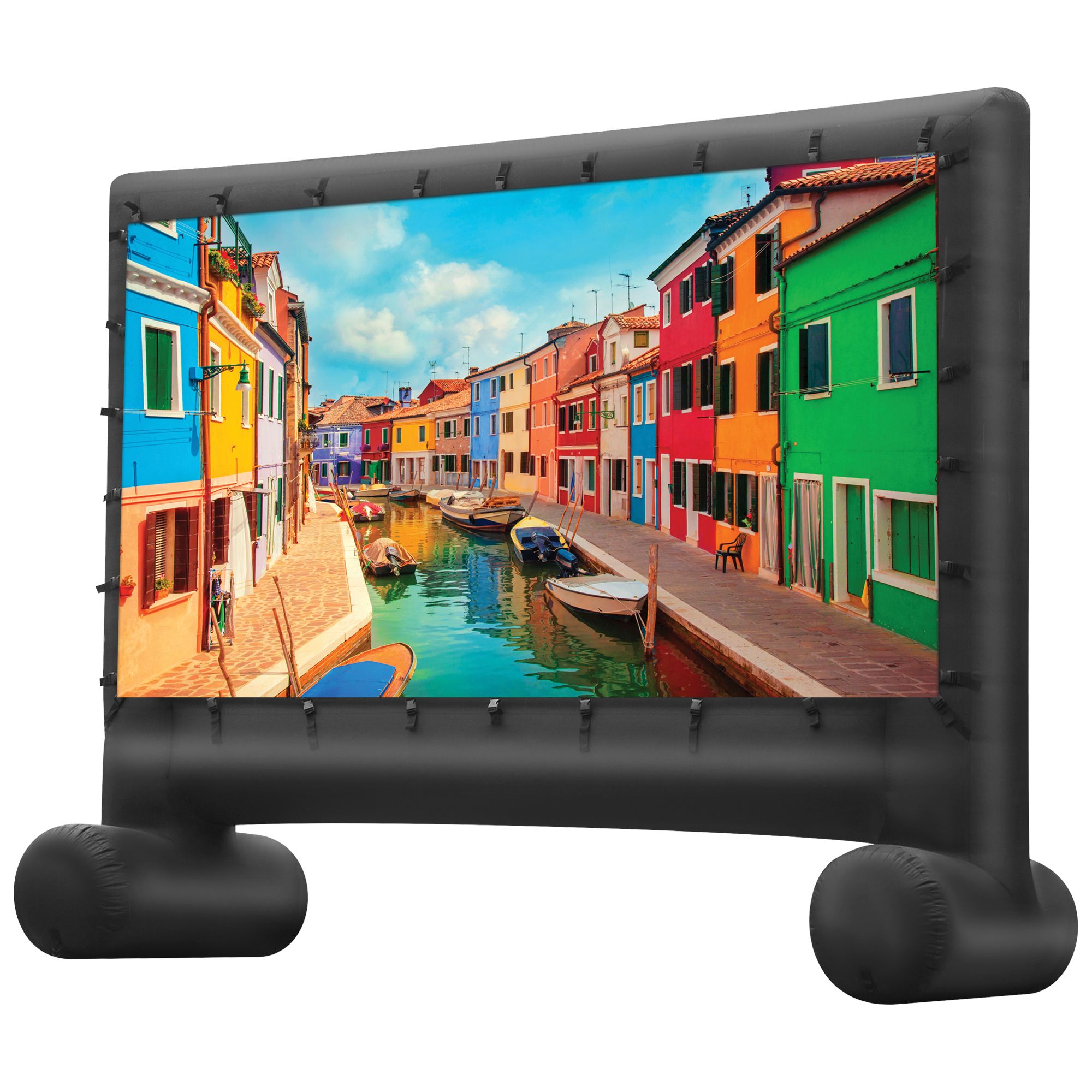 120" diagonal inflatable screen supports front and rear projection for more flexible projector placement
