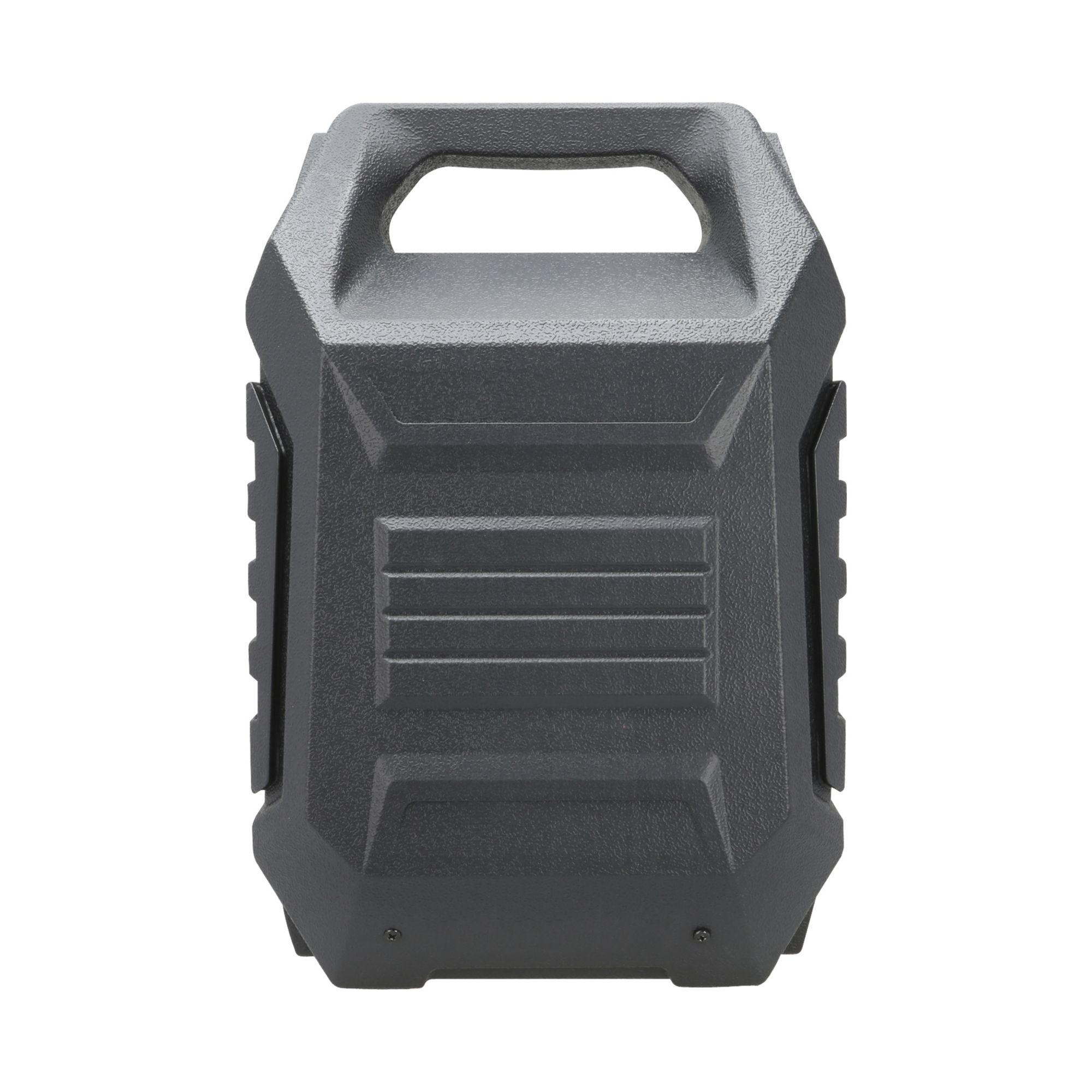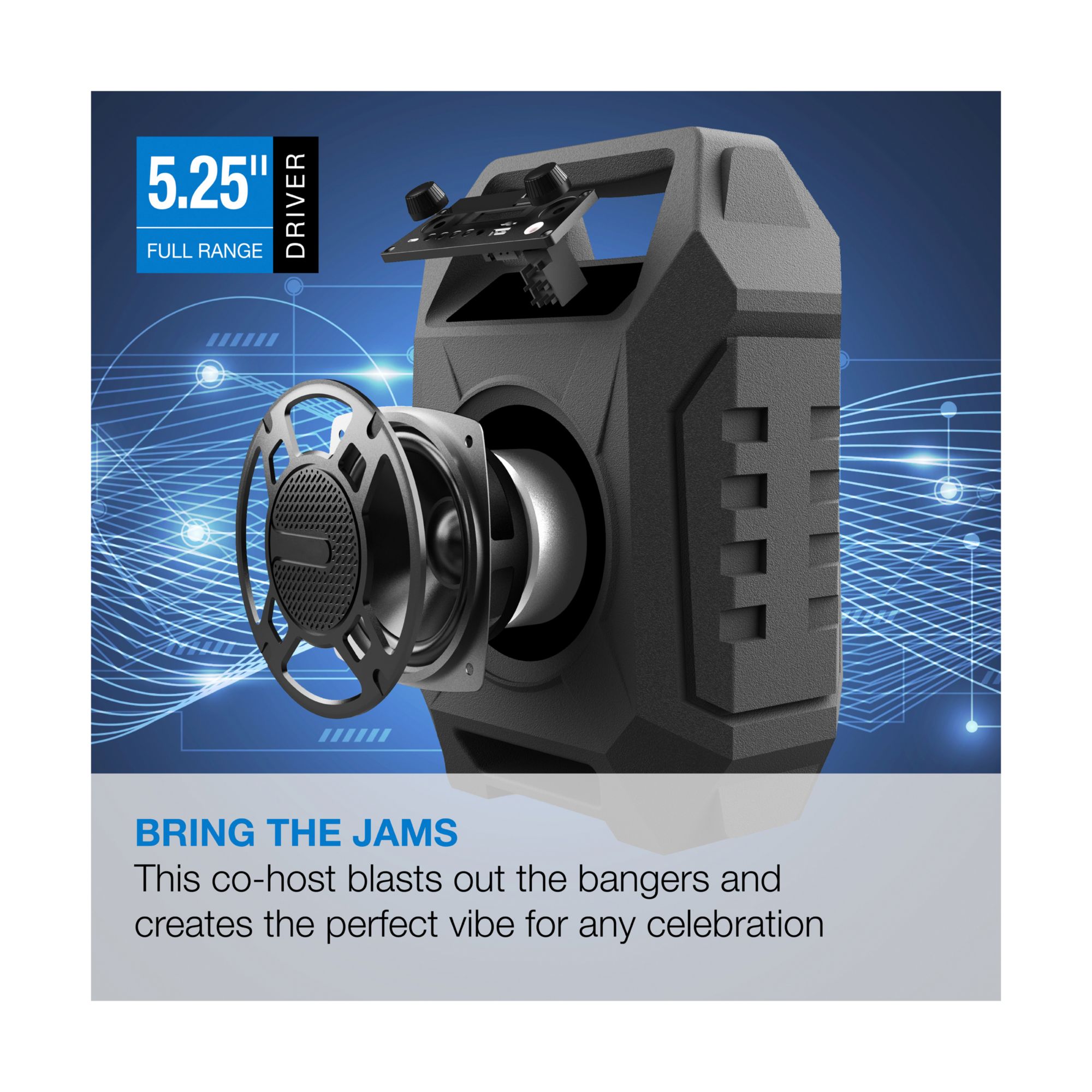 Blast your playlist indoor and out with this feature-packed wireless speaker. With a transportable design to take on all your adventures and rugged exterior, this speaker is the perfect side-kick. Connect via Bluetooth or plug into the aux to listen to your favorite song. Need to make a quick announcement at the party? No problem, plug your mic into the microphone input and speak. When you are in the mood to hunker down and listen to your favorite stations, the speaker has you covered with a built-in digital FM radio. There are USB and SD memory card ports for your saved MP3 music files, so you can listen to your music no matter where you are. Turn on the color changing LED light effects and create a party atmosphere.