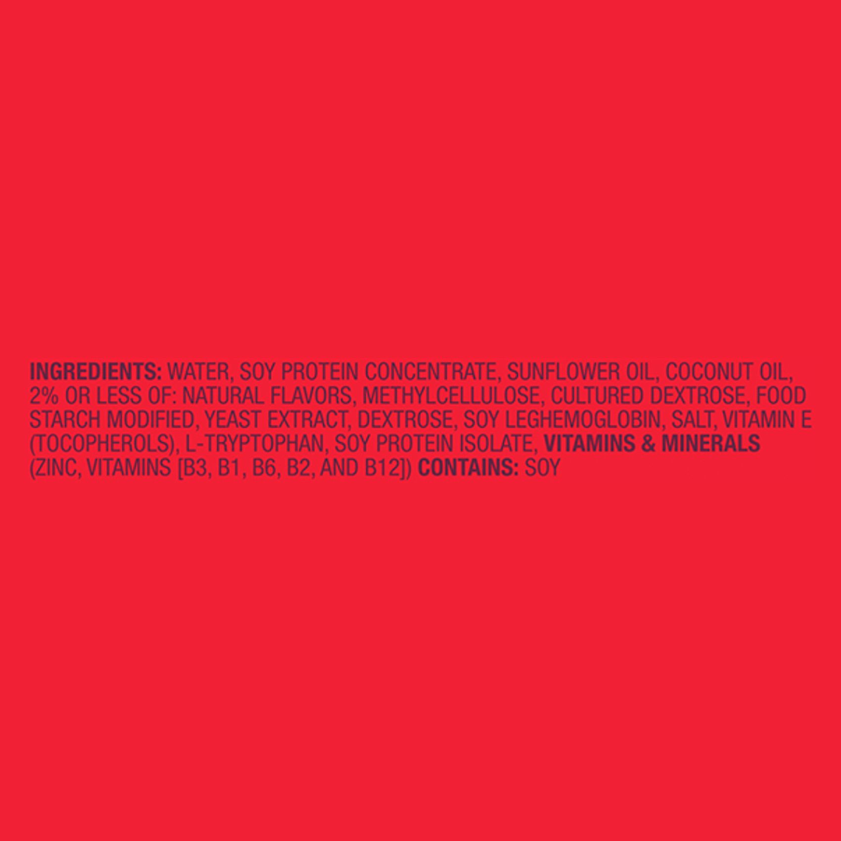 Ingredients: Water, Soy Protein Concentrate, Sunflower Oil, Coconut Oil, 2% Or Less Of: Natural Flavors, Methylcellulose, Cultured Dextrose, Food Starch Modified, Yeast Extract, Dextrose, Soy Leghemoglobin, Salt, Vitamin E (Tocopherols), L-Tryptophan, Soy Protein Isolate Vitamins & Minerals: Zinc, Vitamins (B3, B1, B6, B2, and B12).