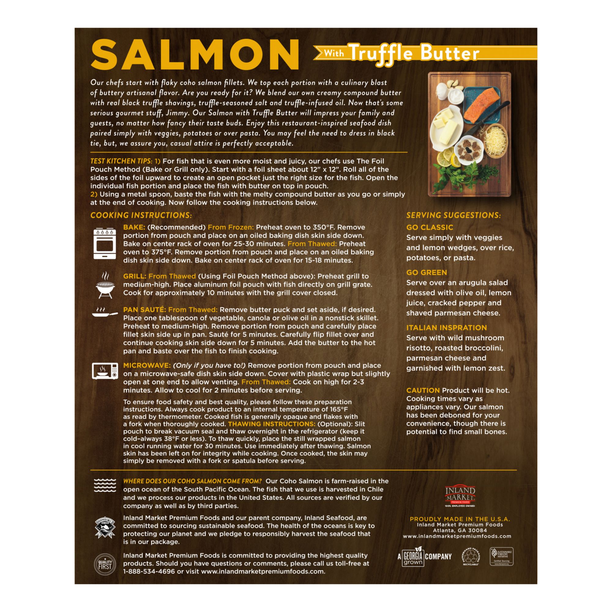 To prepare Inland Market Bourbon Marinated Wild Salmon, the chefs start with the finest wild caught salmon, which they delicately marinate in a rich signature blend of wood-aged Bourbon, brown sugar, garlic and zesty spices. Whether you serve them grilled, sautéed or broiled, these salmon fillets will make a delicious centerpiece for any meal.
