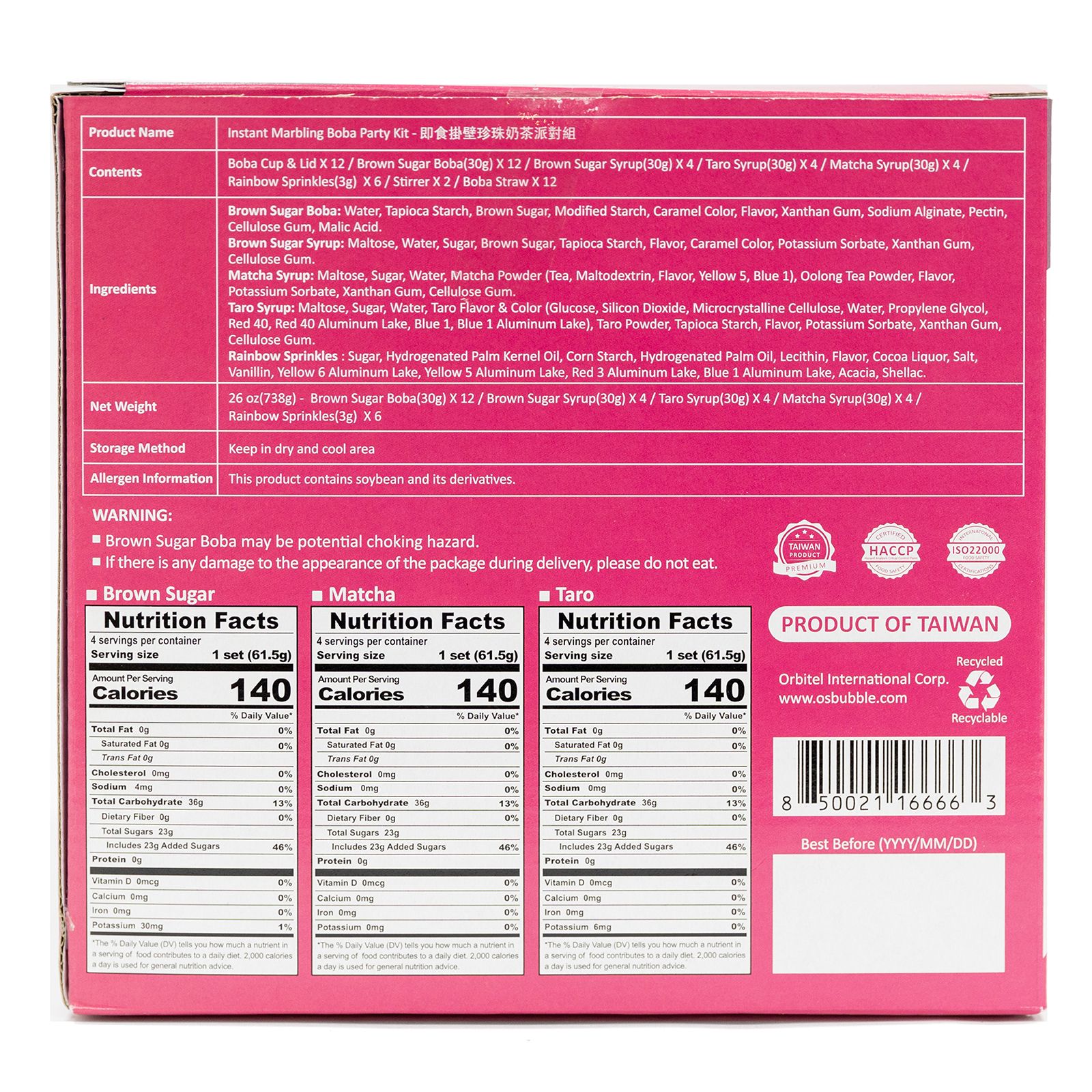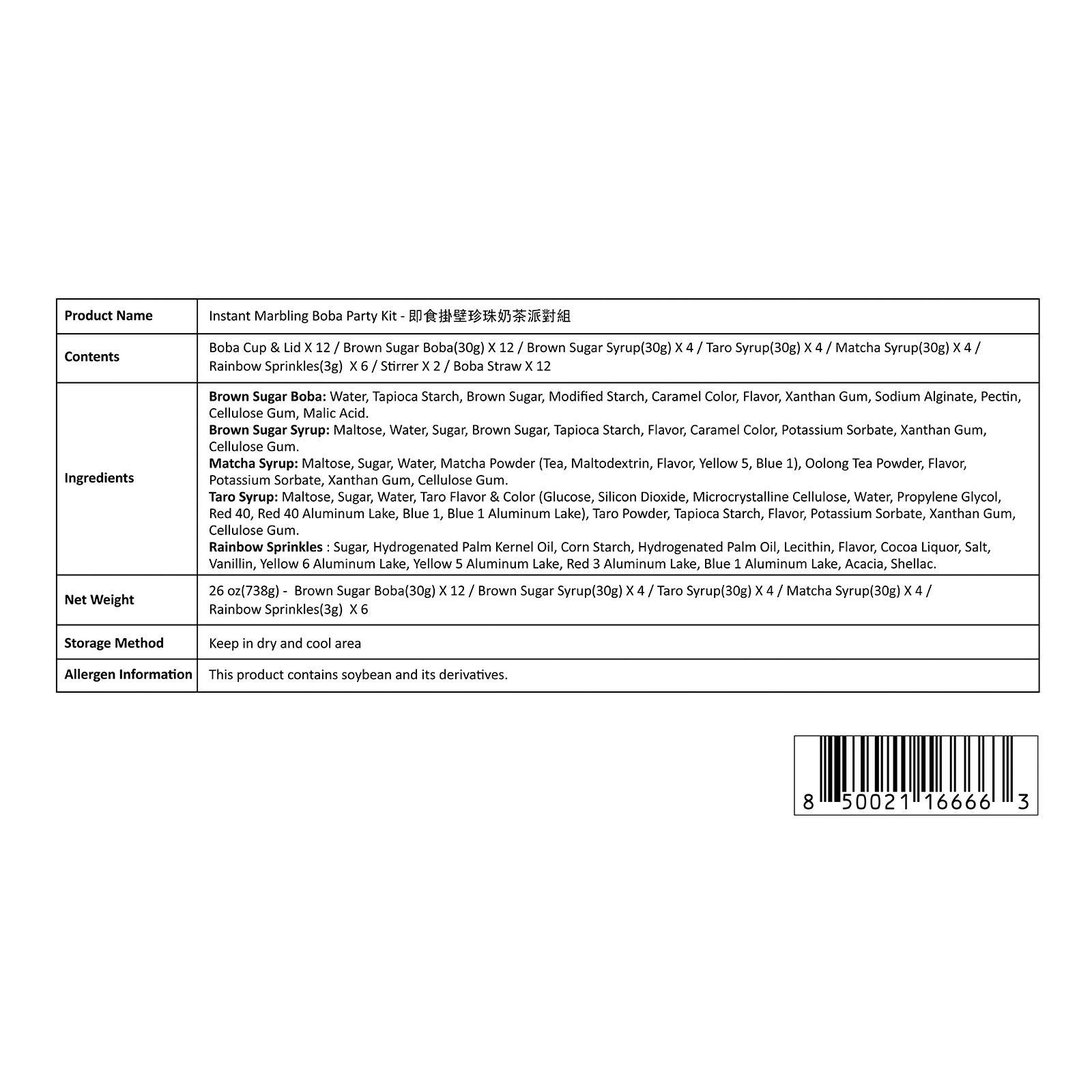 Ingredients: Brown Sugar Boba: Water, Tapioca Starch, Brown Sugar, Modified Starch, Caramel Color, Flavor, Xanthan Gum, Sodium Alginate, Pectin, Cellulose Gum, Malic Acid. Brown Sugar Syrup: Maltose, Water, Sugar, Brown Sugar, Tapioca Starch, Flavor, Caramel Color, Potassium Sorbate, Xanthan Gum, Cellulose Gum. Matcha Syrup: Maltose, Sugar, Water, Matcha Powder (Tea, Maltodextrin, Flavor, Yellow 5, Blue 1), Oolong Tea Powder, Flavor, Potassium Sorbate, Xanthan Gum, Cellulose Gum. Taro Syrup: Maltose, Sugar, Water, Taro Flavor & Color (Glucose, Silicon Dioxide, Microcrystalline Cellulose, Water, Propylene Glycol, Red 40, Red 40 Aluminum Lake, Blue 1, Blue 1 Aluminum Lake), Taro Powder, Tapioca Starch, Flavor, Potassium Sorbate, Xanthan Gum, Cellulose Gum. Rainbow Sprinkles: Sugar, Hydrogenated Palm Kernel Oil, Corn Starch, Hydrogenated Palm Oil, Lecithin, Flavor, Cocoa Liquor, Salt, Vanillin, Yellow 6 Aluminum Lake, Yellow 5 Aluminum Lake, Red 3 Aluminum Lake, Blue 1 Aluminum Lake, Acacia, Shellac.