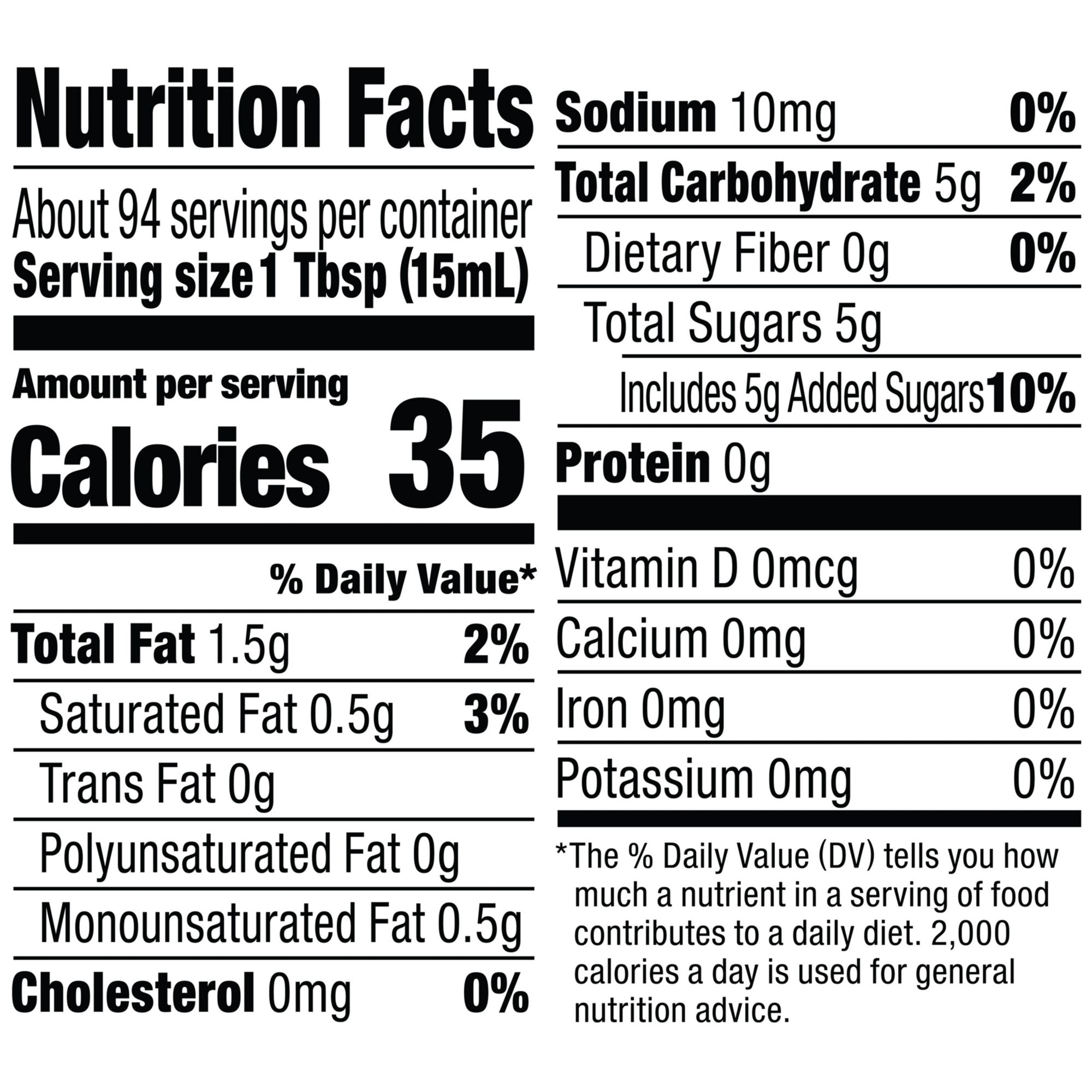 No Trans Fat No Cholesterol No Sodium Low in Saturated Fat 150 Calories per Serving Includes 48-oz Coffee Creamer Bottle