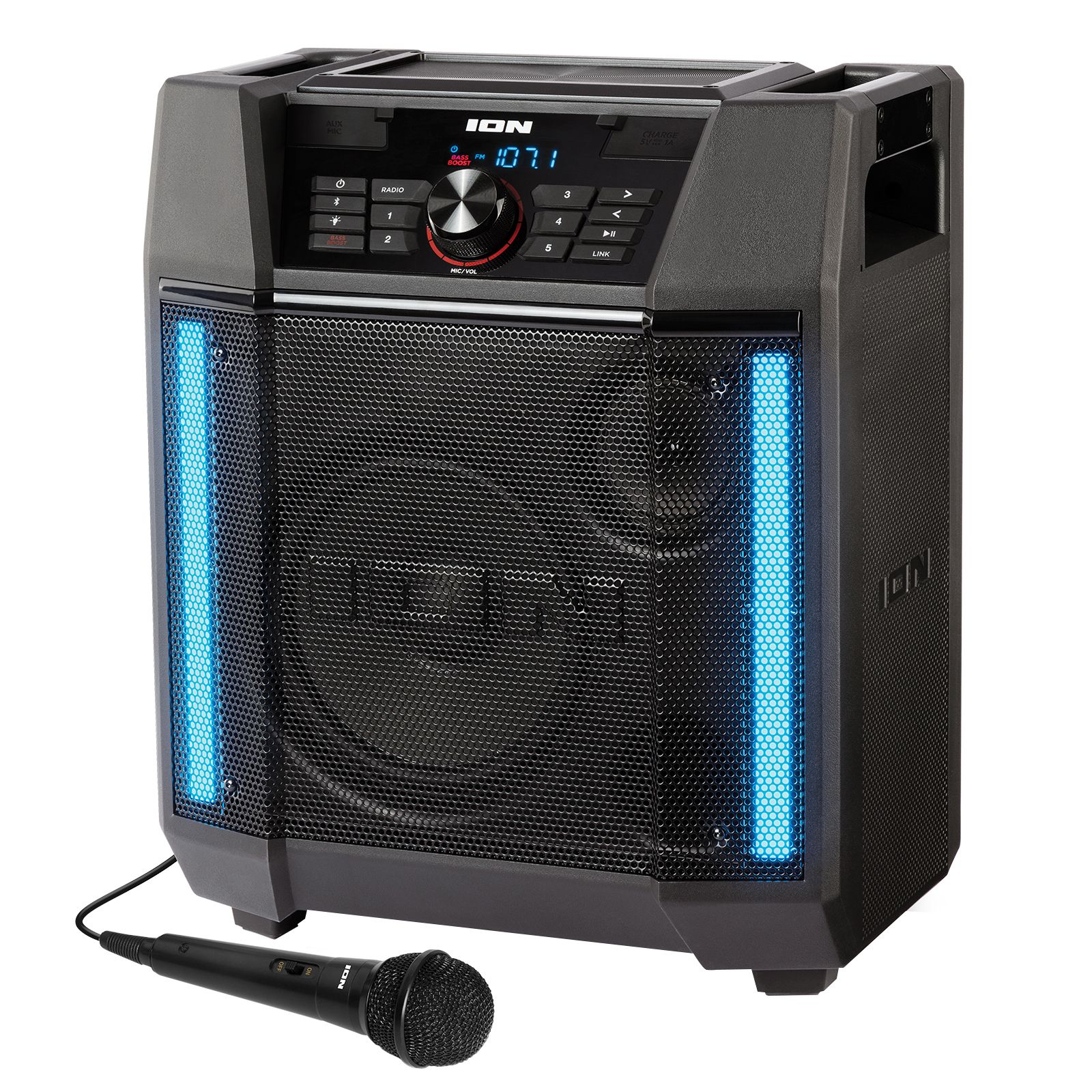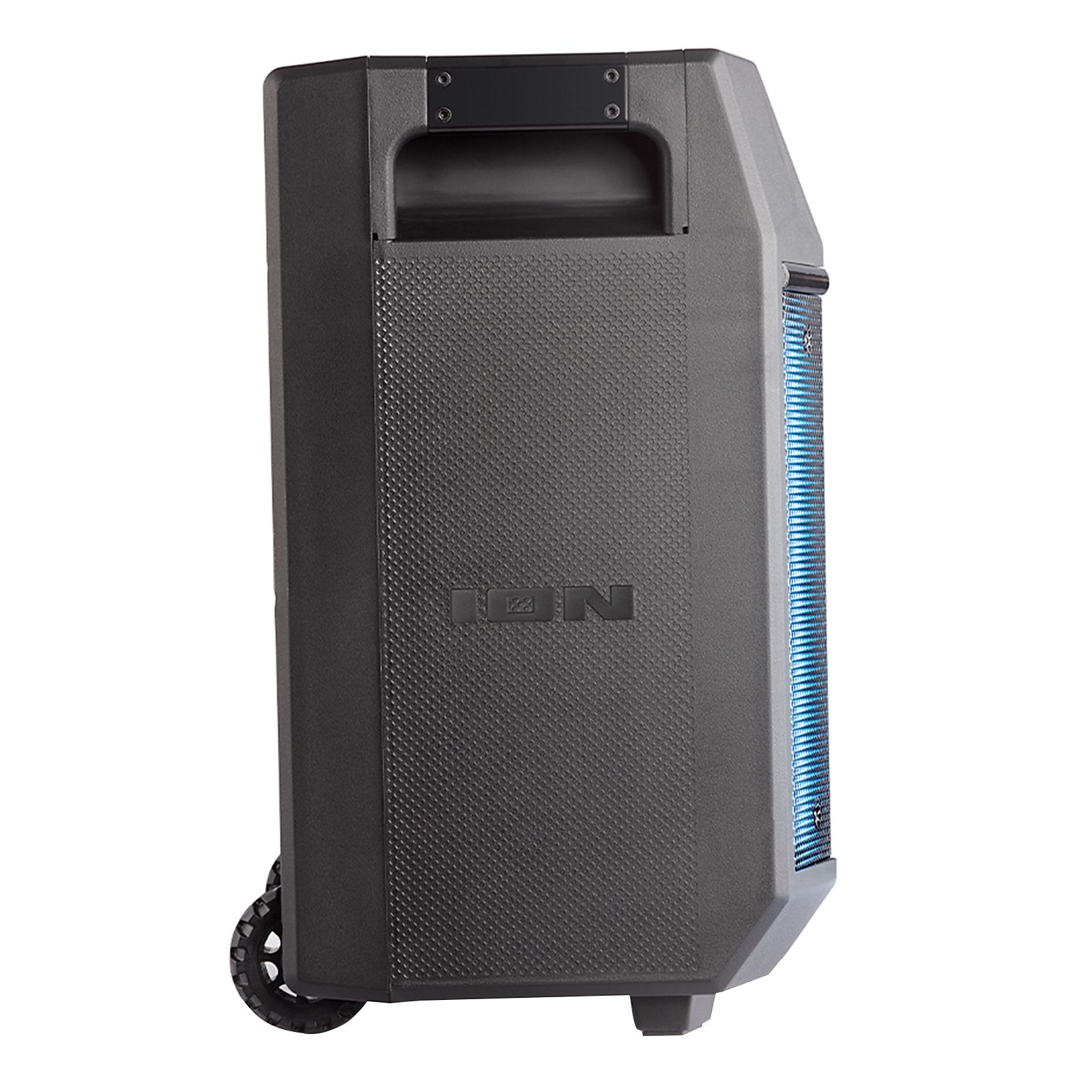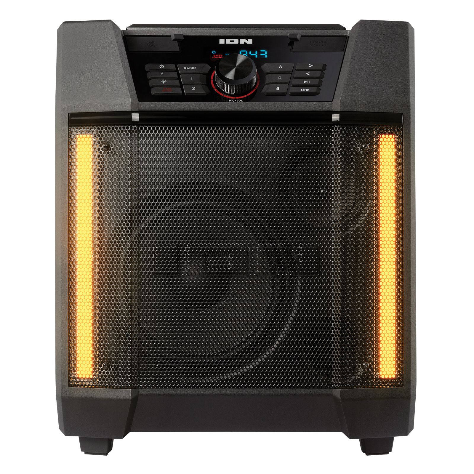Enjoy great times outdoors with the Ion Adventurer High-Power Weather-Resistant Speaker. This powerful and colorful weather-resistant speaker allows you to enjoy great times outdoors in any weather, as this rugged, IPX5 water-resistant, rechargeable speaker streams your favorite music from any Bluetooth-enabled device and pumps out great sound through its powerful 100W dynamic sound system. It also features a built-in multi-color light bar that provides exciting lighting effects for a perfect touch, plus two cup holders that keep your favorite beverages close at hand. Best of all , the speaker's app control works with your iOS or Android phone to control the audio and lighting functions.