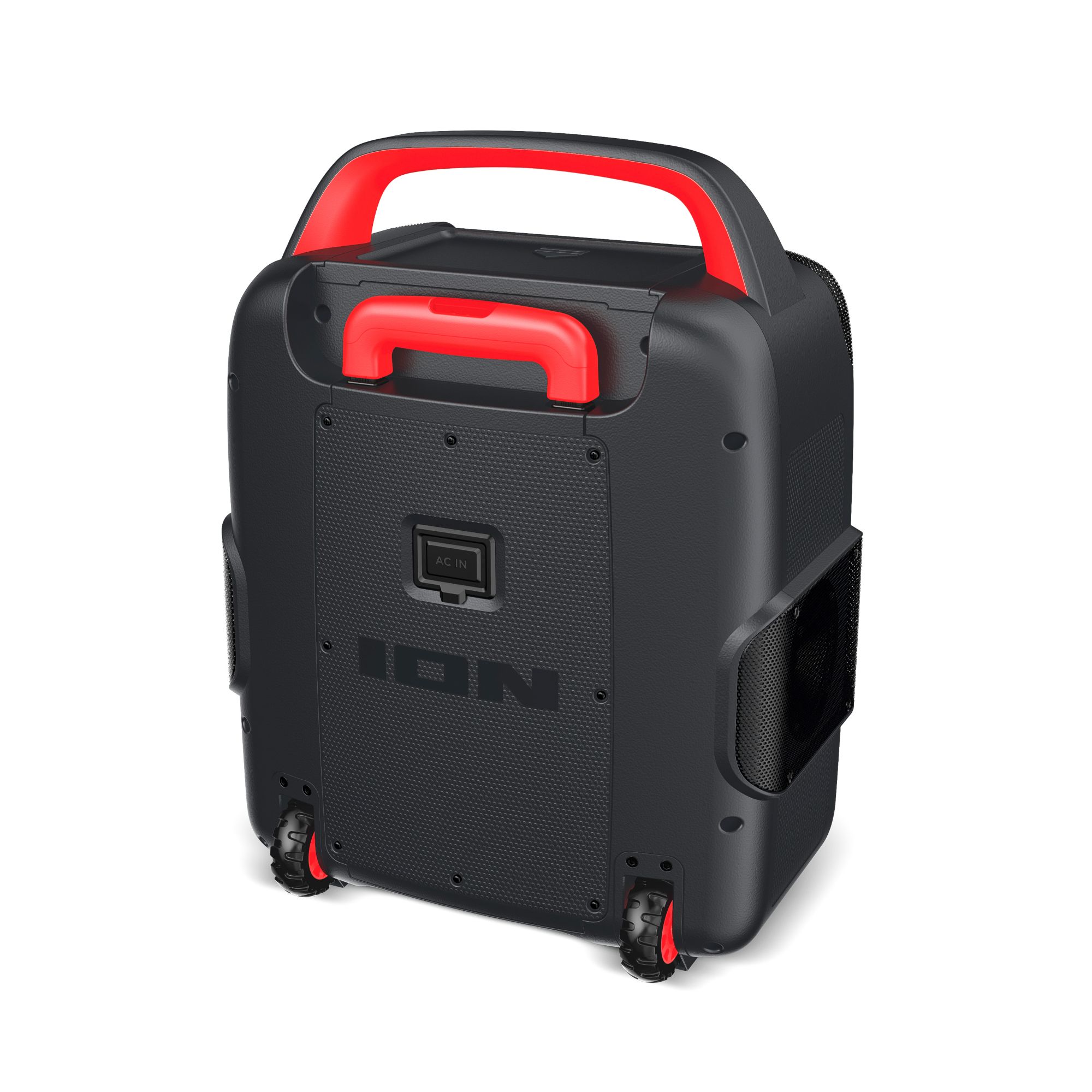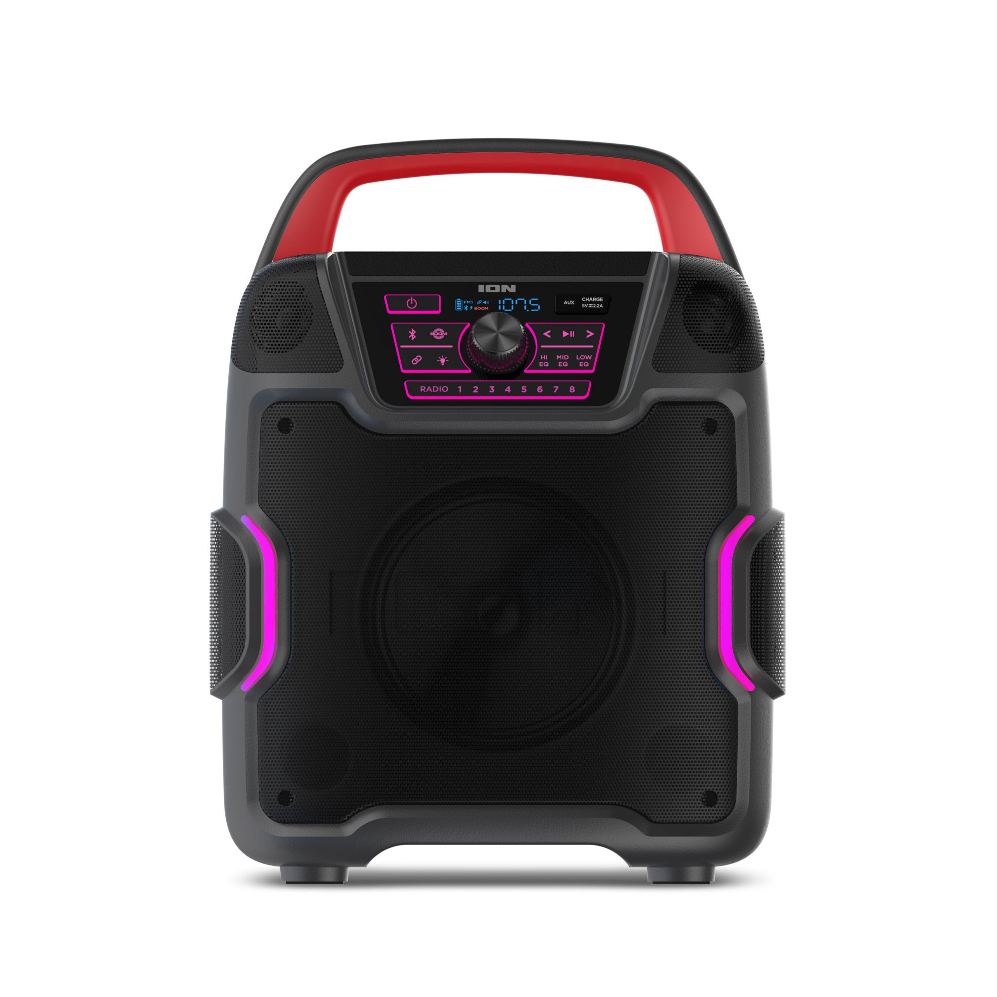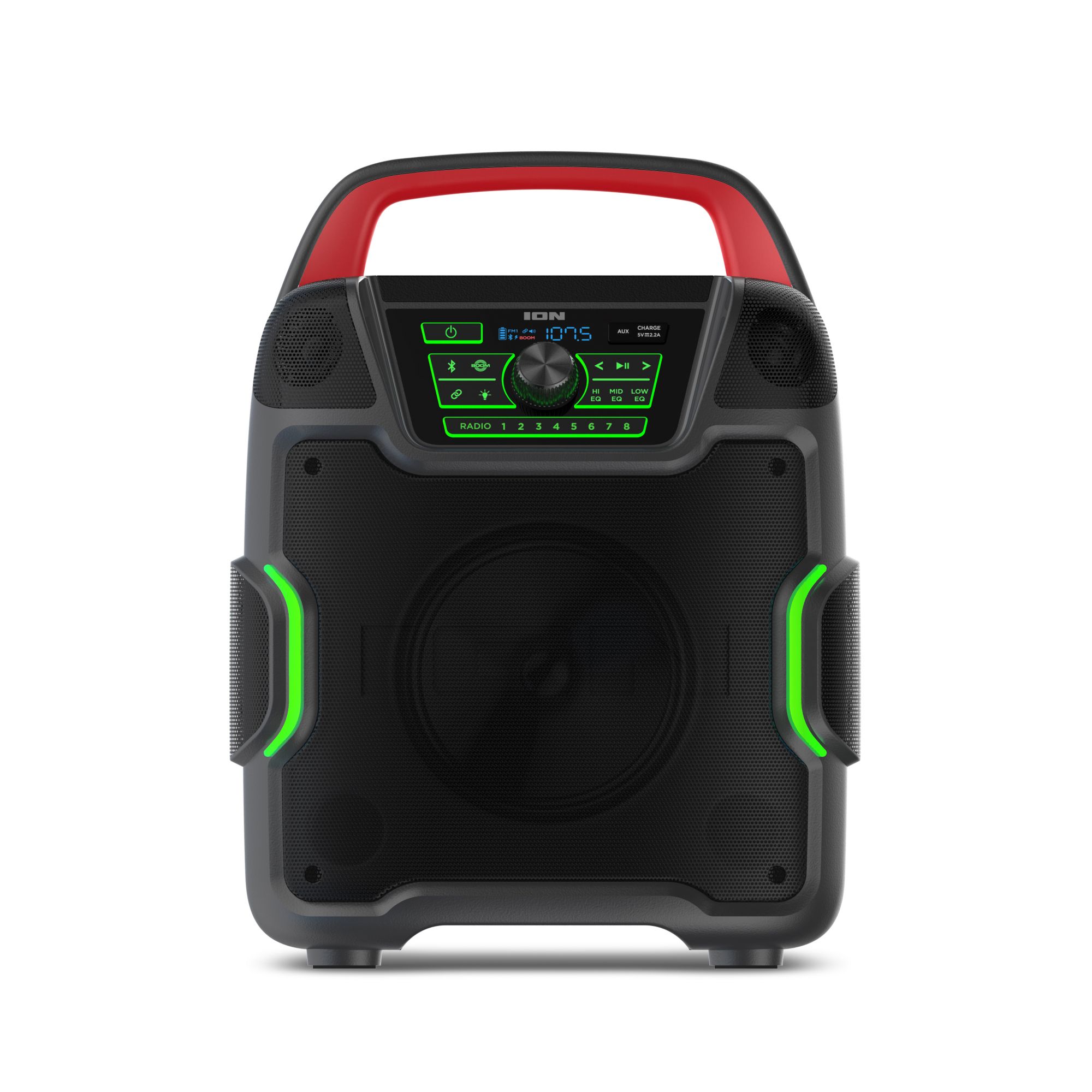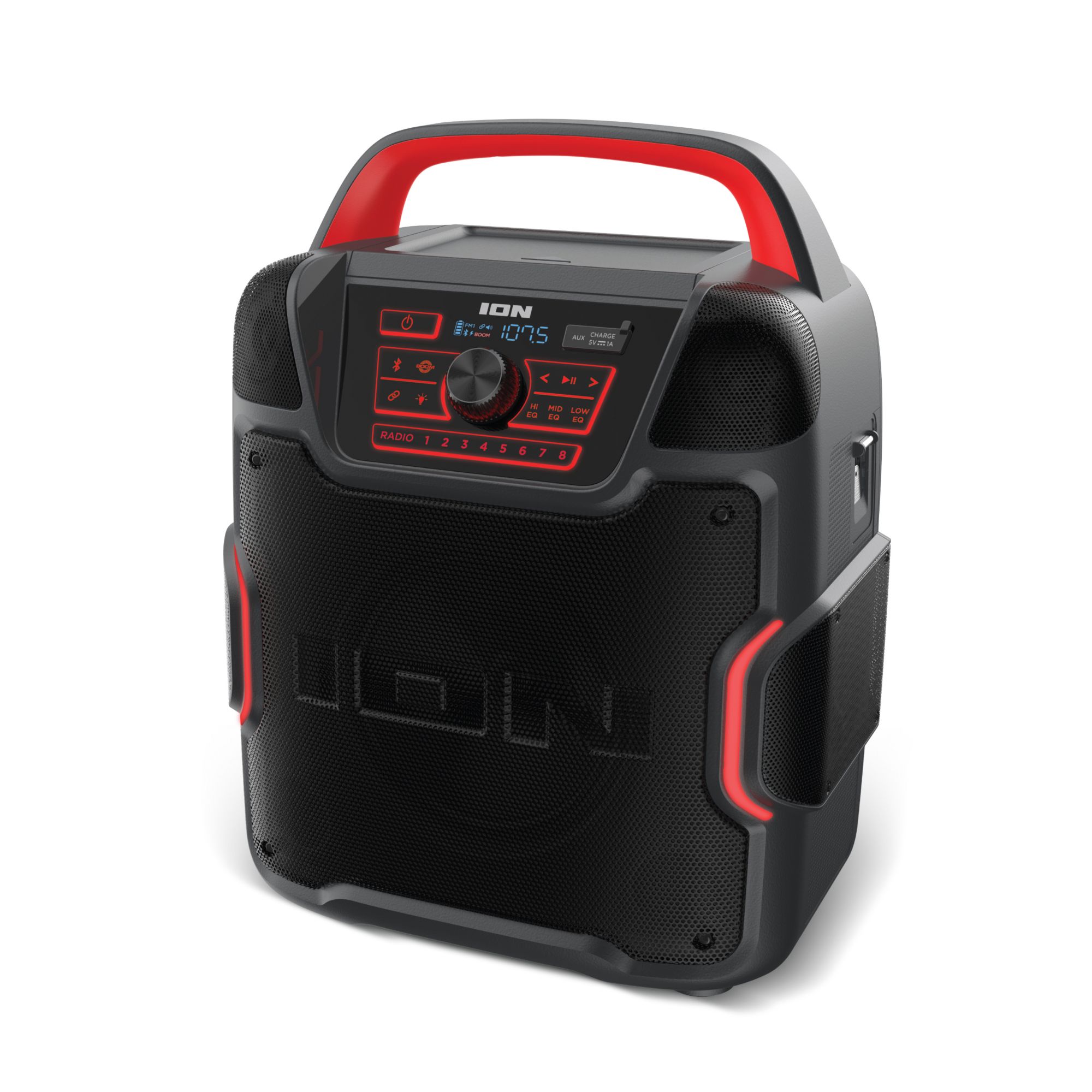 The all-new Pathfinder 320 is a rugged wireless speaker system with a new outdoor speaker design and rechargeable battery. This is the rugged wireless speaker system that you need. ION Pathfinder 320 is a rugged wireless speaker system with a rechargeable battery that provides premium audio via a brand-new cabinet design with five built-in speakers that allow you to enjoy premium five-speaker audio anywhere. The ION Pathfinder 320 has multi-colored LED lights that react to the beat of your music. The Pathfinder 320 has a backlit control panel and buttons that make it so easy to use at night. This rugged wireless speaker is IPX5 water-resistant with a 100-hour rechargeable battery. This new portable speaker system streams music and audio from any Bluetooth-enabled device and pumps out booming sound through its powerful 200W premium five-speaker system. The new five-speaker system includes one 8" woofer, two 1" tweeters, and two 3" drivers. Five speakers, more sound. The Pathfinder 320 features 320-degree wide-range sound which emanates premium quality audio from this rugged wireless speaker to the front, the left, and the right of the speaker cabinet casting a wider arc of sound than a typical outdoor Bluetooth speaker. The new ION Pathfinder 320 speaker design includes a covered compartment with a fast-charging USB port. Plug in, close the cover, and turbo-charge your mobile device in the shade! Pathfinder 320 has built-in multi-color lights that pulse to the music for exciting visual effects. When you want to put some “boom” in your bass, activate the Boom Button to instantly crank up the bass, volume, and light effects on the speaker. When you want to further increase your sound experience, use ION’s exclusive Wireless Stereo-Link feature to wirelessly connect additional compatible ION wireless speakers. To easily control all audio and lighting functions, use the ION Sound XP App with your iOS or Android phone. Best of all, it comes with a built-in bottle opener for your convenience and built-in handles and wheels for easy transportation. With an FM radio and 16 built-in station presets on top of all that, Pathfinder 320 is a complete water-resistant speaker system suitable for any environment.
