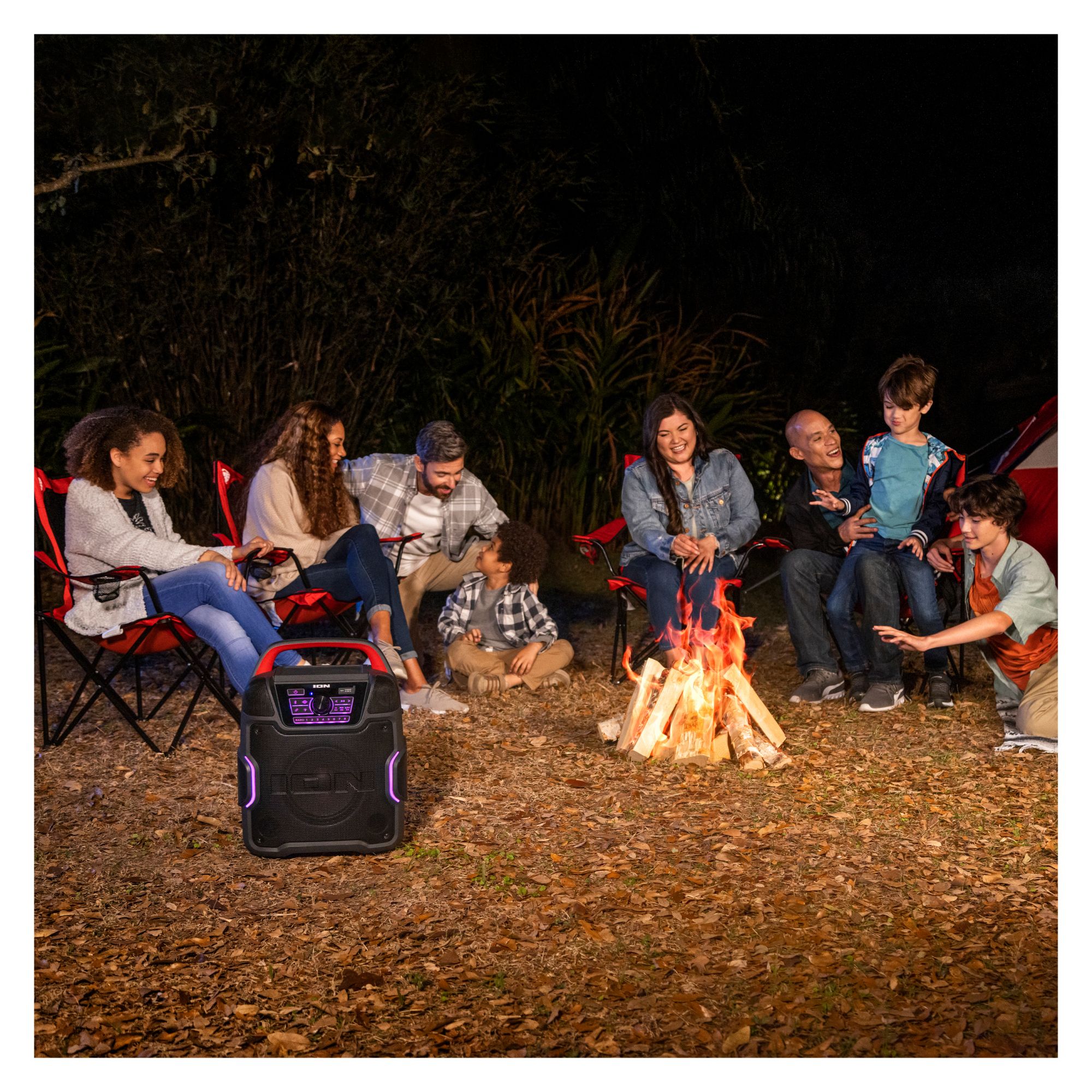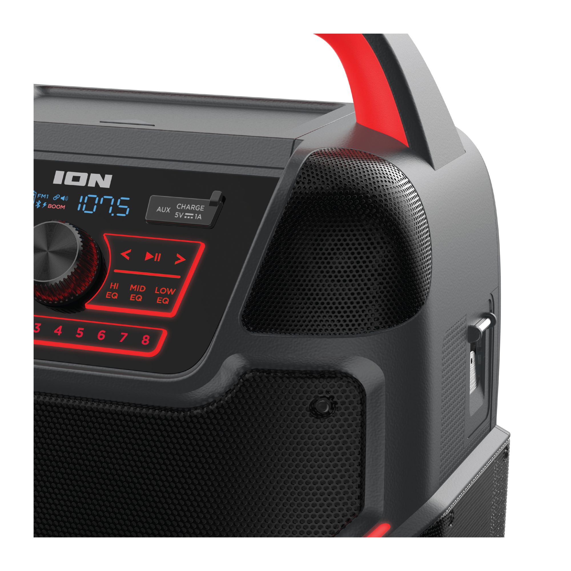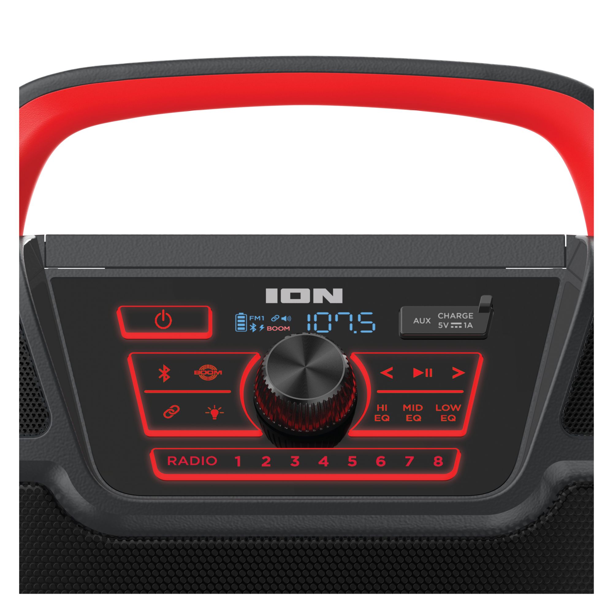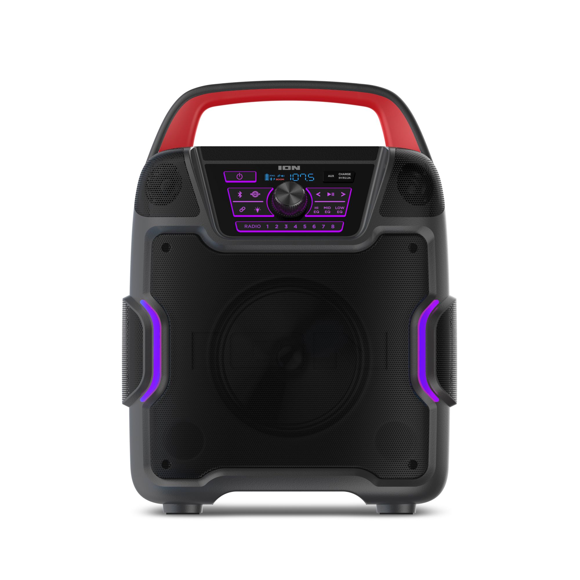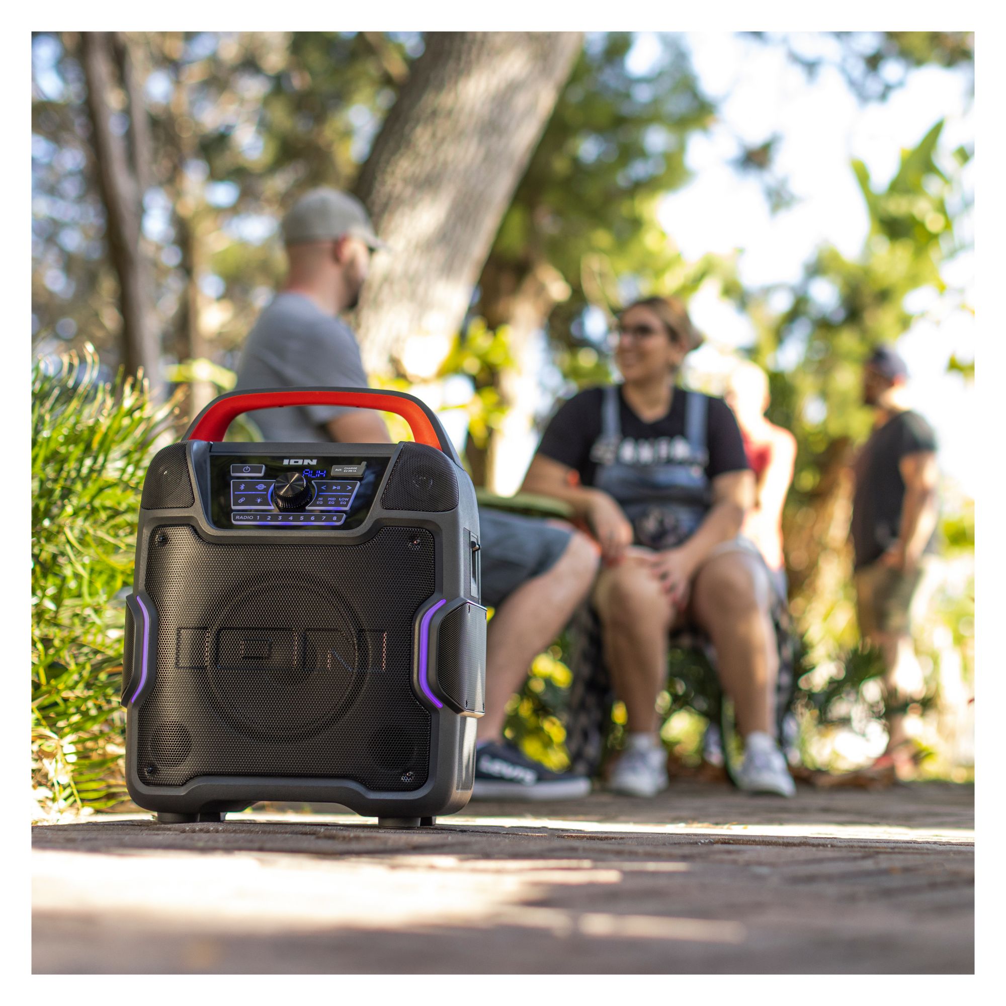 The all-new Pathfinder 320 is a rugged wireless speaker system with a new outdoor speaker design and rechargeable battery. This is the rugged wireless speaker system that you need. ION Pathfinder 320 is a rugged wireless speaker system with a rechargeable battery that provides premium audio via a brand-new cabinet design with five built-in speakers that allow you to enjoy premium five-speaker audio anywhere. The ION Pathfinder 320 has multi-colored LED lights that react to the beat of your music. The Pathfinder 320 has a backlit control panel and buttons that make it so easy to use at night. This rugged wireless speaker is IPX5 water-resistant with a 100-hour rechargeable battery. This new portable speaker system streams music and audio from any Bluetooth-enabled device and pumps out booming sound through its powerful 200W premium five-speaker system. The new five-speaker system includes one 8" woofer, two 1" tweeters, and two 3" drivers. Five speakers, more sound. The Pathfinder 320 features 320-degree wide-range sound which emanates premium quality audio from this rugged wireless speaker to the front, the left, and the right of the speaker cabinet casting a wider arc of sound than a typical outdoor Bluetooth speaker. The new ION Pathfinder 320 speaker design includes a covered compartment with a fast-charging USB port. Plug in, close the cover, and turbo-charge your mobile device in the shade! Pathfinder 320 has built-in multi-color lights that pulse to the music for exciting visual effects. When you want to put some “boom” in your bass, activate the Boom Button to instantly crank up the bass, volume, and light effects on the speaker. When you want to further increase your sound experience, use ION’s exclusive Wireless Stereo-Link feature to wirelessly connect additional compatible ION wireless speakers. To easily control all audio and lighting functions, use the ION Sound XP App with your iOS or Android phone. Best of all, it comes with a built-in bottle opener for your convenience and built-in handles and wheels for easy transportation. With an FM radio and 16 built-in station presets on top of all that, Pathfinder 320 is a complete water-resistant speaker system suitable for any environment.