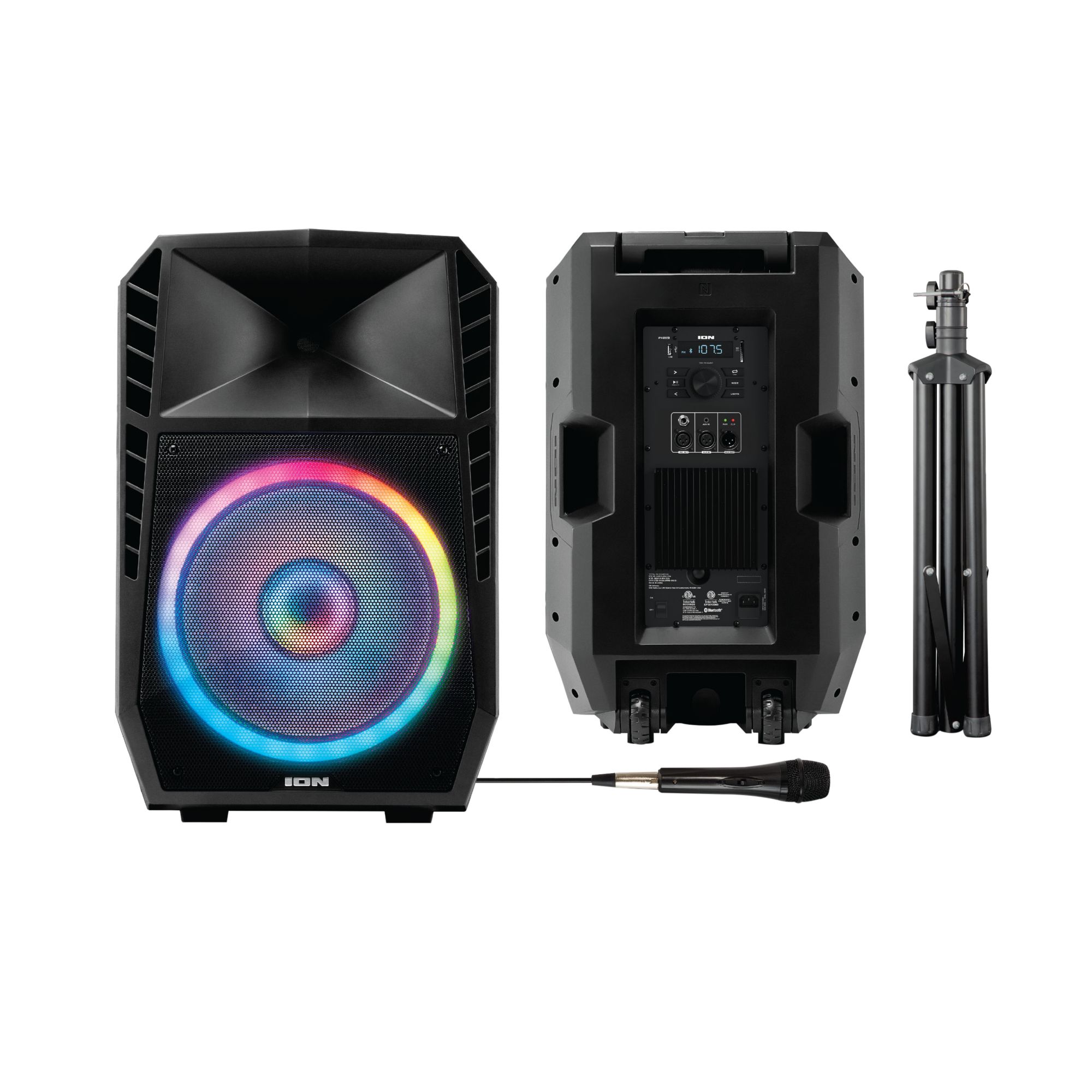 The woofer glows in multiple colors and dances to the beat for exciting visuals. You can wirelessly stream music from any Bluetooth device or take advantage of the onboard FM radio with 30 presets. Plus, the ION Sound XP app allows you to have control of both the speaker's audio and the lighting functions from any iOS or Android device. The included microphone with echo effect, and stand, is great for karaoke. With a top telescoping handle and built-in wheels, transport is a snap for any occasion.