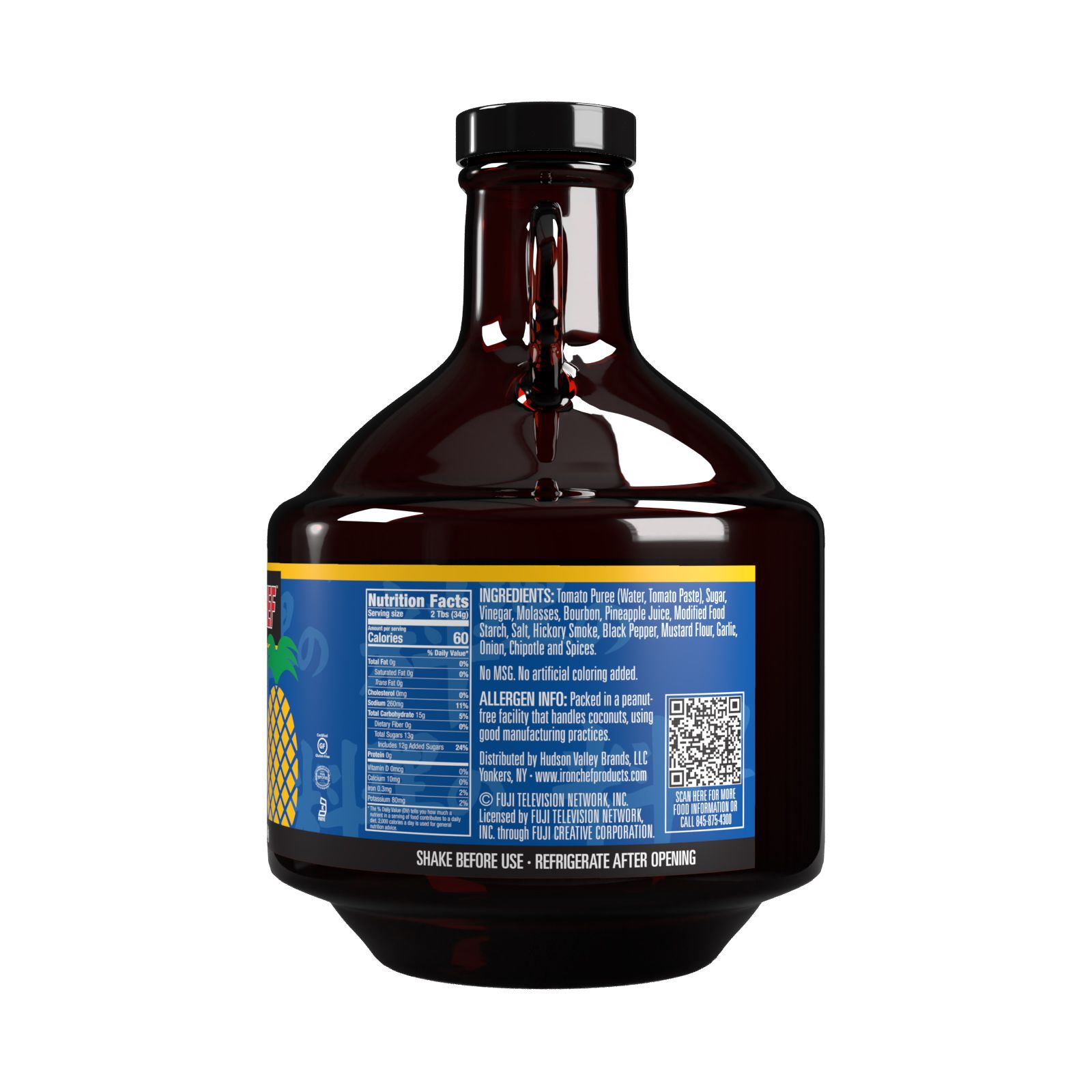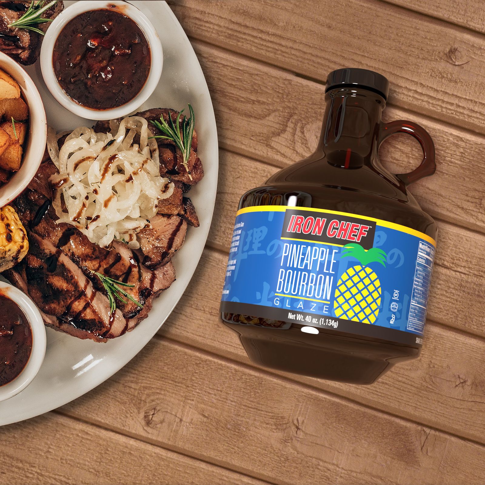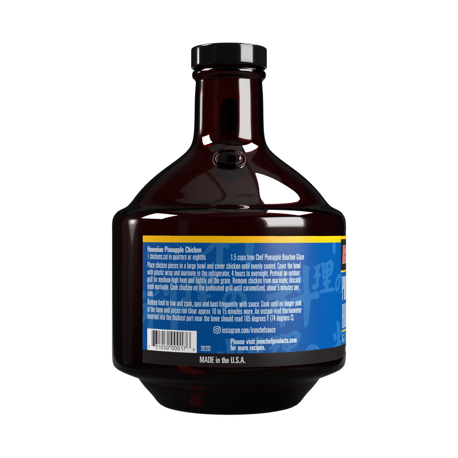 Iron Chef Pineapple Bourbon Glaze is a blend of pineapple and classic Bourbon with a hint of Pepper. Made with a combination of spices: chipotle, cloves, cinnamon, and garlic. The sauce is sweetened with molasses and the flavor is then bumped up with a hint of hickory and mustard. This sauce is made in the USA with gourmet ingredients. Cooked in small batches with care to ensure that the quality of flavor and consistency matches our chefs’ quality. The mix of pineapple and bourbon makes this a unique sauce to use as a glaze on chicken, pork, beef, ribs, or seafood. Looking to add flavor to your chicken tenders or sandwich? This glaze is the perfect dipping sauce. Use it to make amazing wings or on fried cauliflower for an amazing side dish. The Iron Chef Pineapple Bourbon Glaze is certified kosher, dairy-free, and gluten-free. It is sold in amber glass that will preserve its fresh flavor.