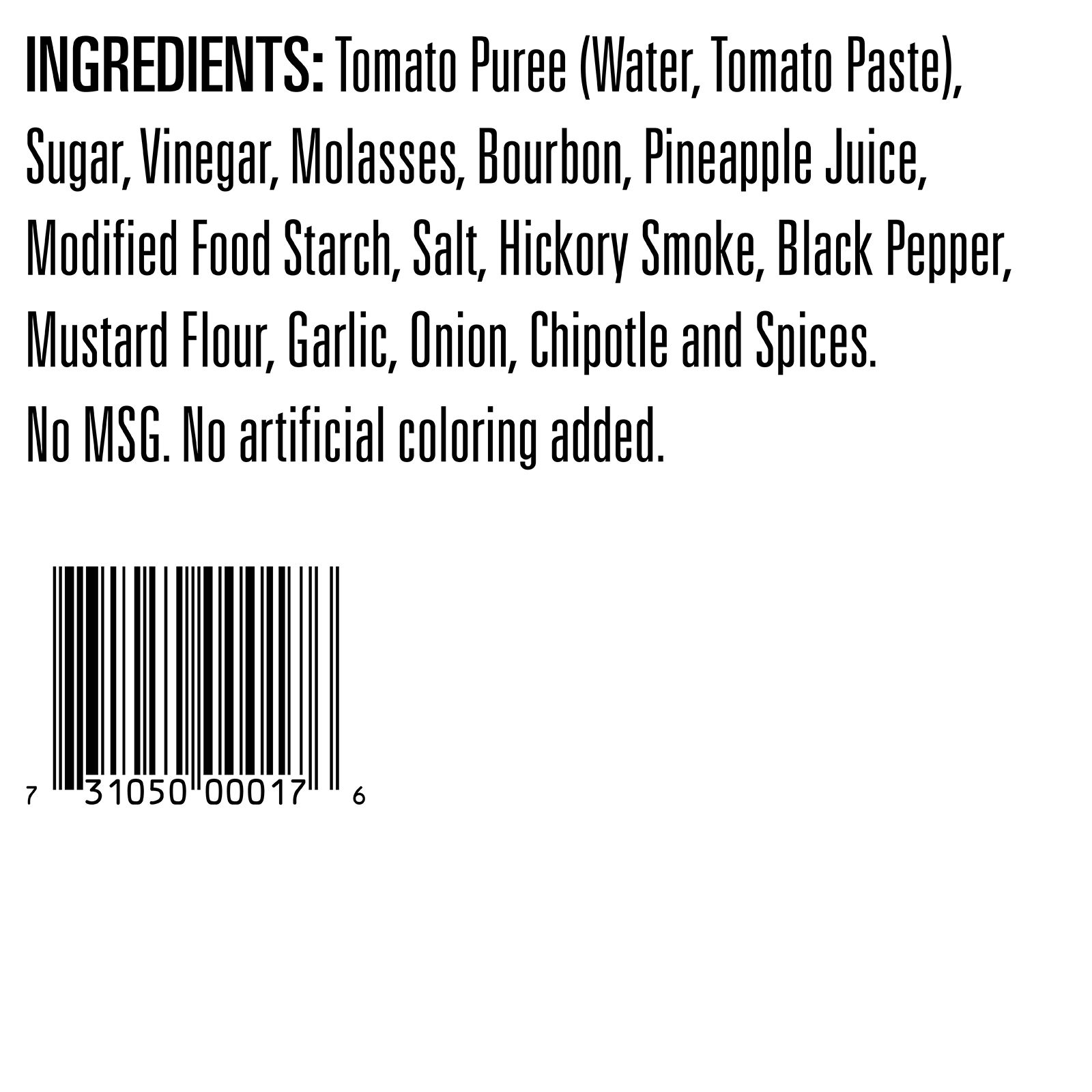 Tomato Puree, Sugar, Vinegar, Molasses, Pineapple Juice, Bourbon, Food Starch, Hickory Smoke, Pepper, Salt, Garlic Chipotle, Onion, Mustard