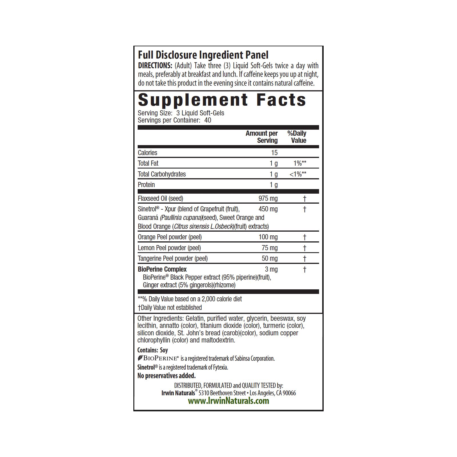 Flaxseed Oil, Sinetrol - Xpur, Guaraná, Sweet Orange and Blood Orange, Orange Peel Powder, Lemon Peel Powder, Tangerine Peel Powder, BioPerine Complex