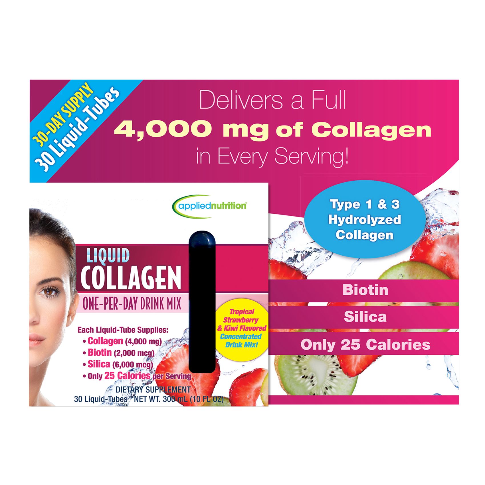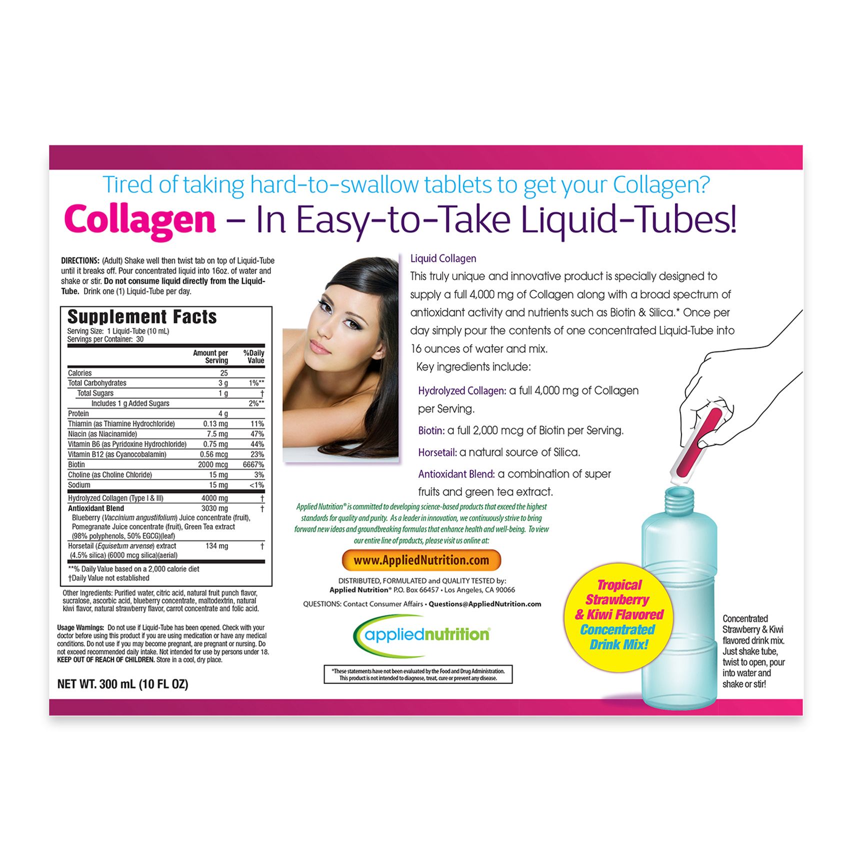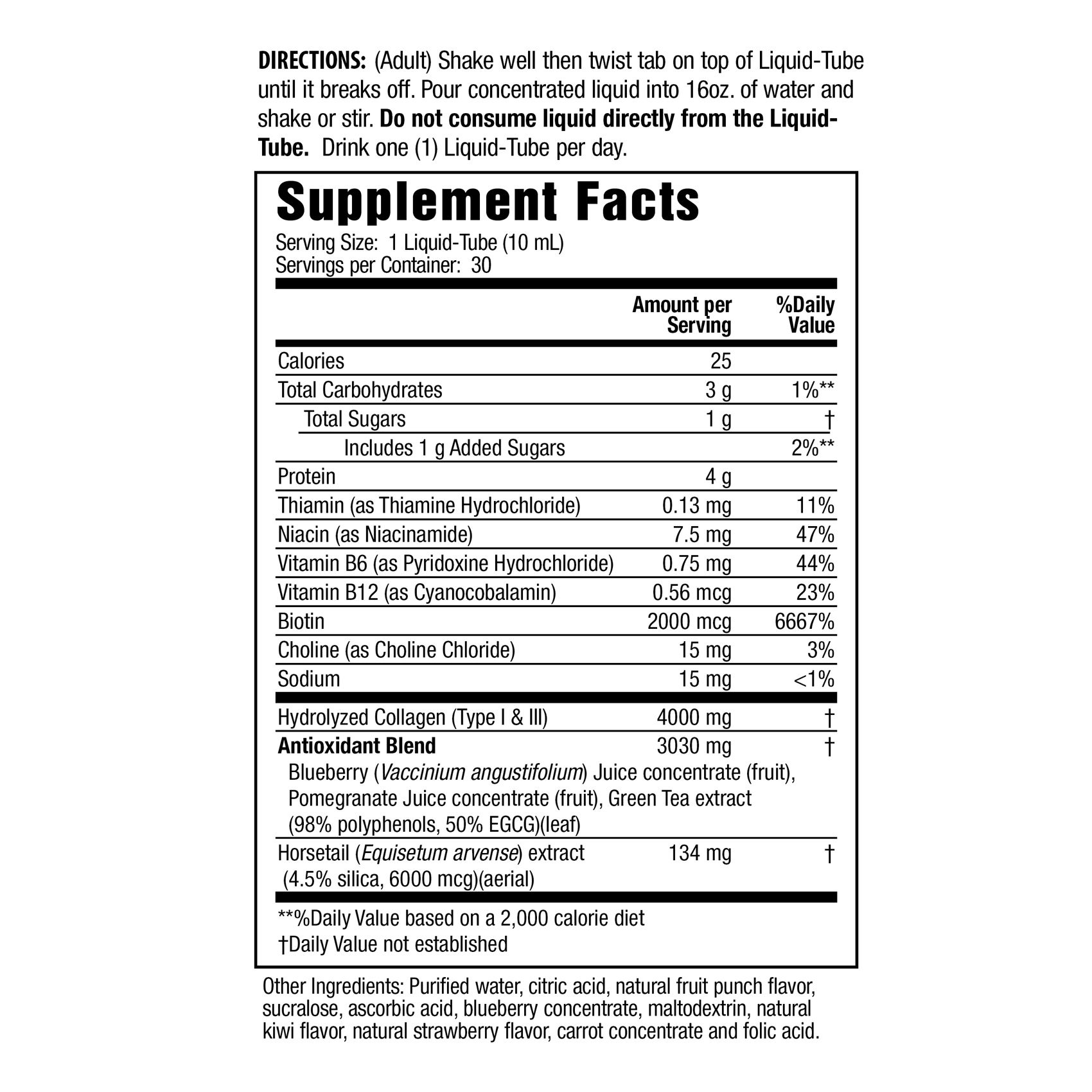 30 liquid tubes Liquid-tubes: an innovative and great-tasting delivery system Convenience: only one liquid-tube per day is needed to revitalize the skin from the inside out Hydrolyzed Collagen: a full 4,000 mg per serving to help replenish the body’s supply of collagen Biotin: the “super beauty nutrient” that supports healthy skin and gives strength & luster to brittle nails Plus Vitamins A, E, Horsetail, and Antioxidant Blend