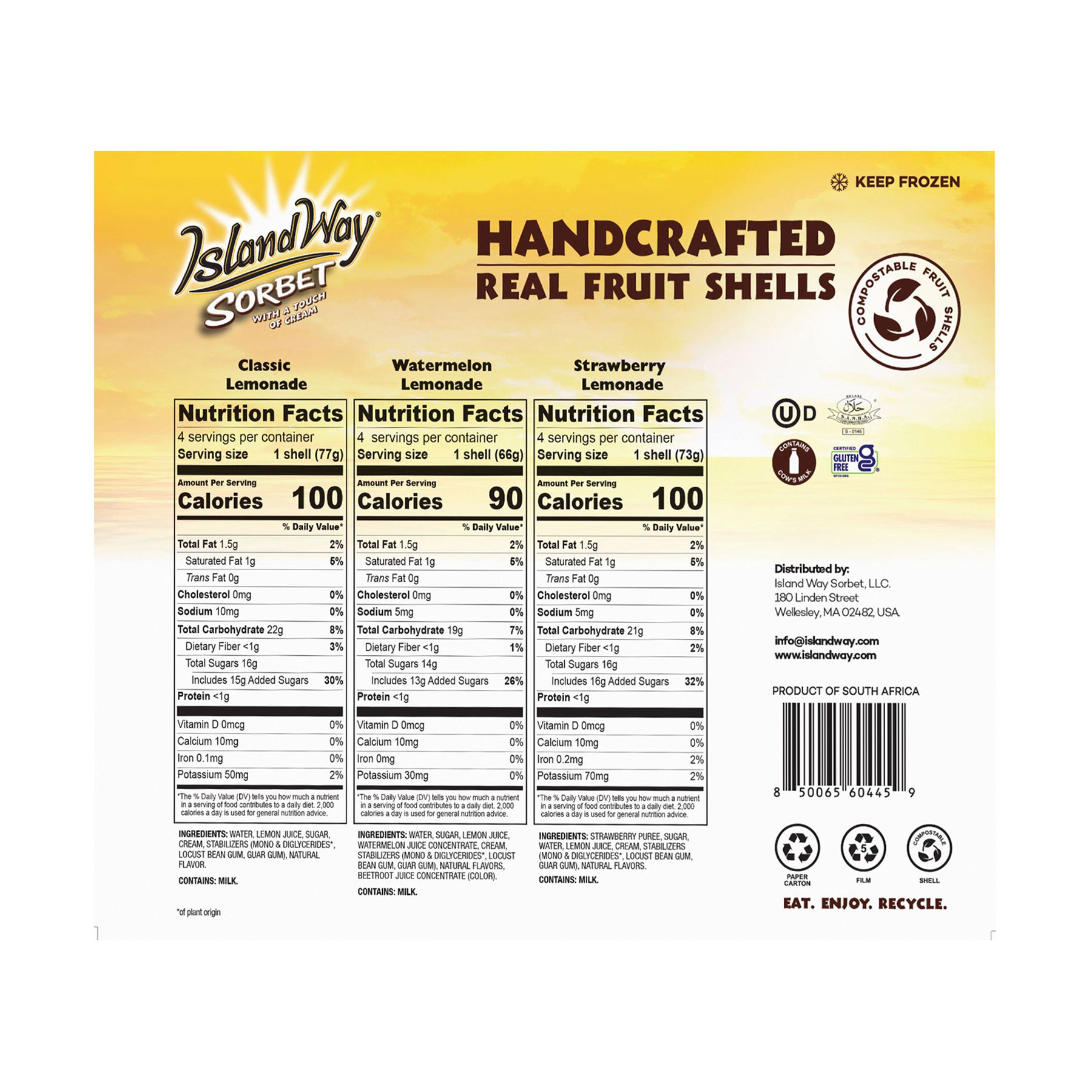 Island Way Sorbets begin their journey in nature. After being picked in nearby orchards and fields, each fruit shell is hand cut; the inside of the fruit is scooped out and upcycled while the shell is filled with our award winning sorbet. Our sorbets are made with the highest quality Non-GMO ingredients and contain no added preservatives, artificial flavors or colors. For a smooth and decadent finish, each sorbet contains a touch of cream. We are driven by a commitment to our communities and our planet. We make use of all parts of the fruit in our products. Each fruit shell is compostable, reducing the need for unnecessary packaging and waste. Island Way is proud to bring you sorbets that strike a perfect balance between nature, taste and happiness. Bursting with flavor, they are sure to invigorate your taste buds and bring wonder to every occasion. Welcome to our Island!