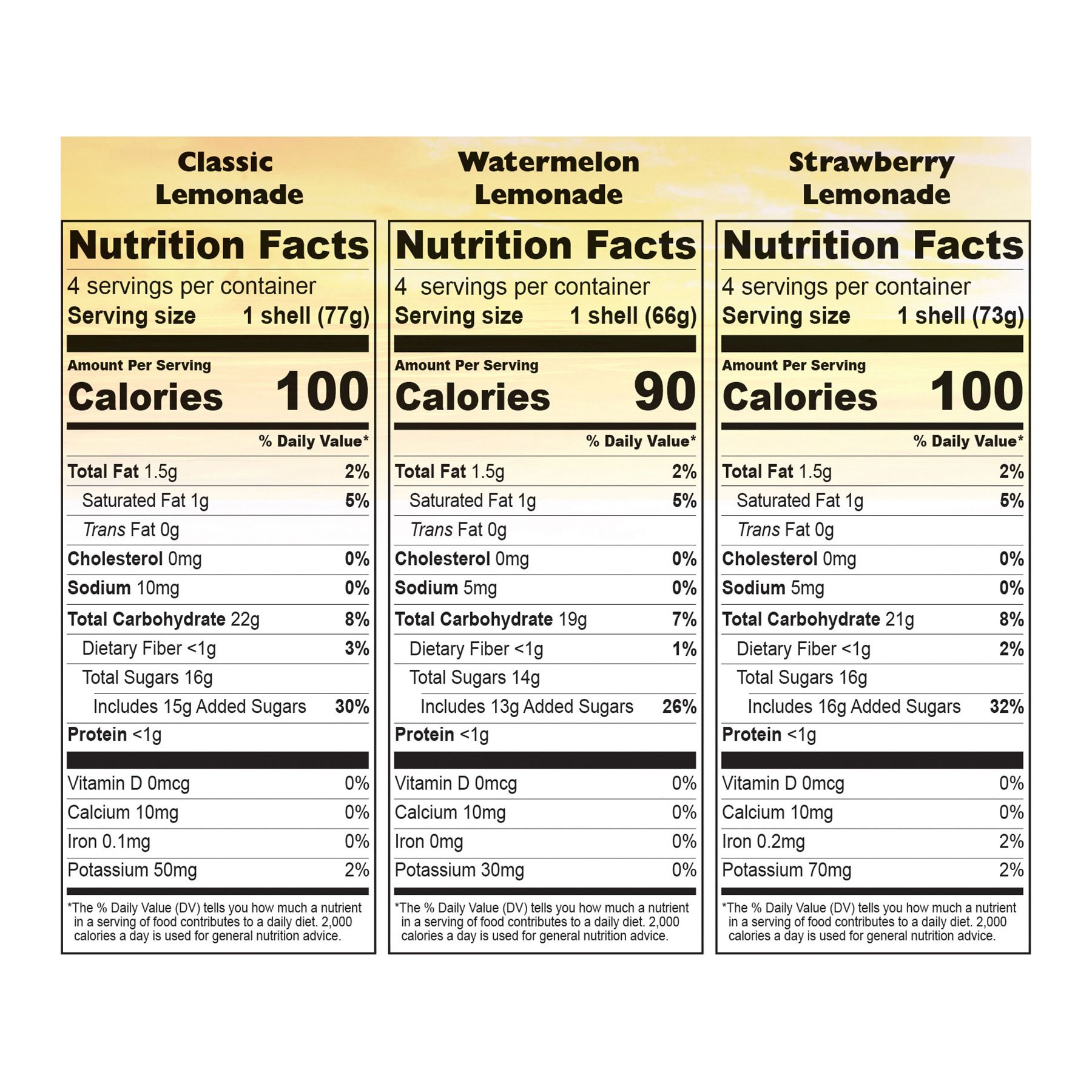 Ingredients: Classic Lemonade Ingredients: Water, Lemon Juice, Sugar, Cream, Stabilizers (Mono & Diglyerides*, Locust Beam Gum, Guar Gum), Natural Flavor. Contains: Milk Watermelon Lemonade Ingredients: Water, Sugar, Lemon Juice, Watermelon Juice Concentrate, Cream, Stabilizers (Mono & Diglyerides*, Locust Beam Gum, Guar Gum), Natural Flavors, Blackcurrant & Carrot Juice Concentrate (Color). Contains: Milk Strawberry Lemonade Ingredients: Strawberry Puree, Sugar, Water, Lemon Juice, Cream, Stabilizers (Mono & Diglyerides*, Locust Beam Gum, Guar Gum), Natural Flavors. Contains: Milk.
