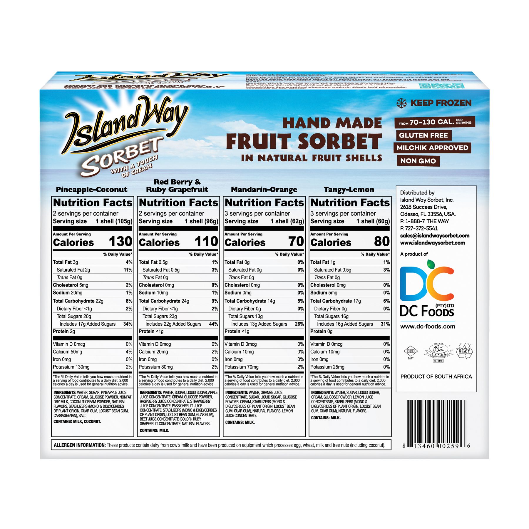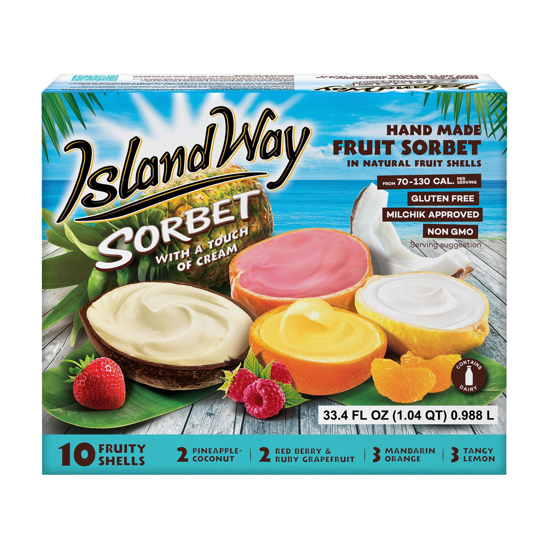 Enjoy the taste of never ending summer. Each individual handmade sorbet has a smooth, luscious flavor that is both refreshing and calorie conscious! Nestled in natural fruit shells, these sorbets contain no preservatives or colorants, maintaining Island Way's commitment to a healthy lifestyle. Each fruit shell is between 70-140 calories per serving. Sorbet has a touch of cream (contains dairy), is Gluten Free, Milchik Approved, and Non-GMO. Island Way's lemon sorbet is bursting with cool and refreshing citrus flavor with just the right amount of lemony tartness. The Ruby Red Berry is a delightful blend of raspberries, strawberries and a touch of ruby red grapefruit. Picked from the finest Florida orange fields, the orange sorbet is bursting with sweet, juicy, tangy goodness. Last, but certainly not least, the Pineapple Coconut sorbet marries sweet pineapple and creamy coconut served in a natural pineapple shell. Bring your tastebuds on a tropical vacation today!