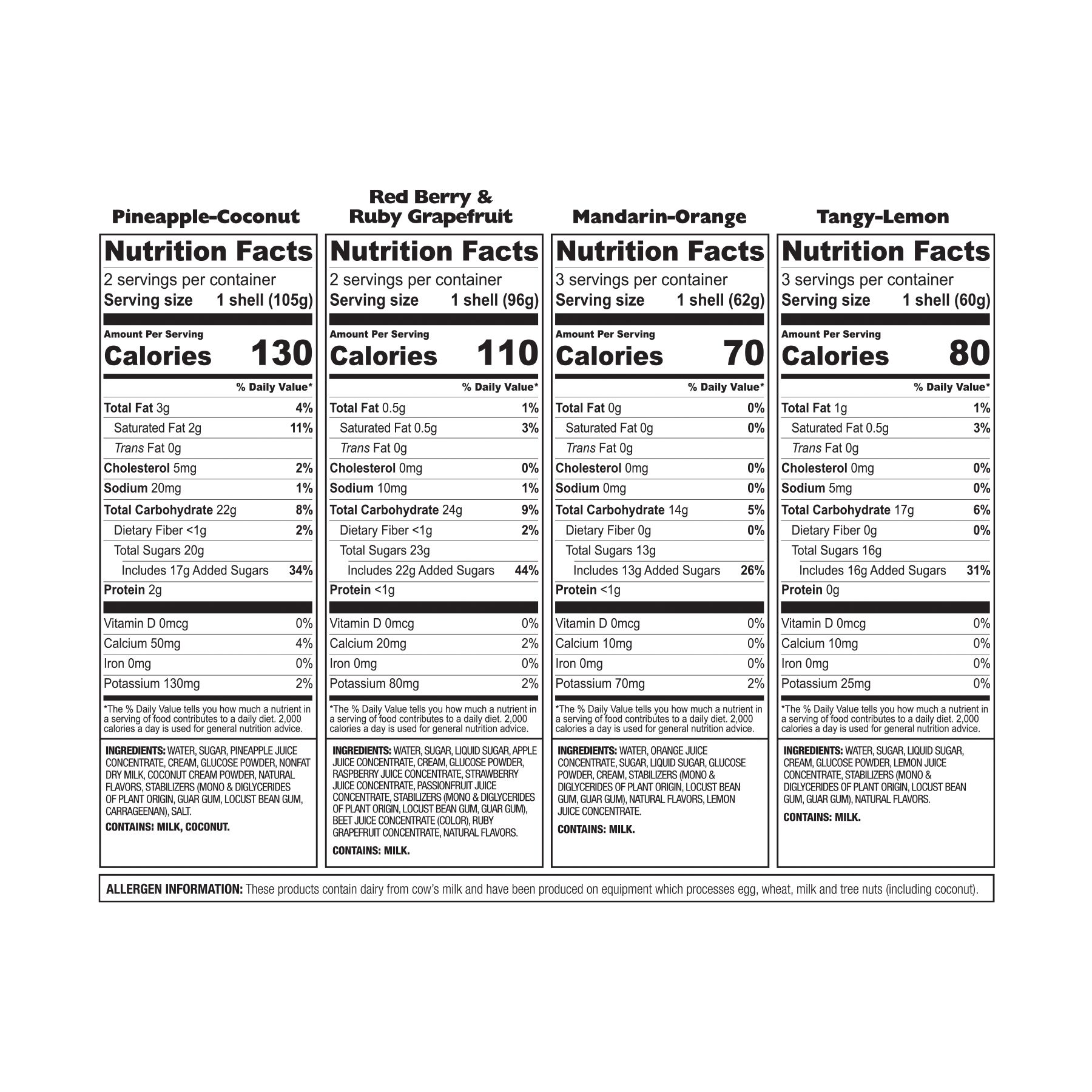 Includes two Pineapple Coconut, two Ruby Red Berry, three Mandarin Orange, and three Tangy Lemon fruit sorbets