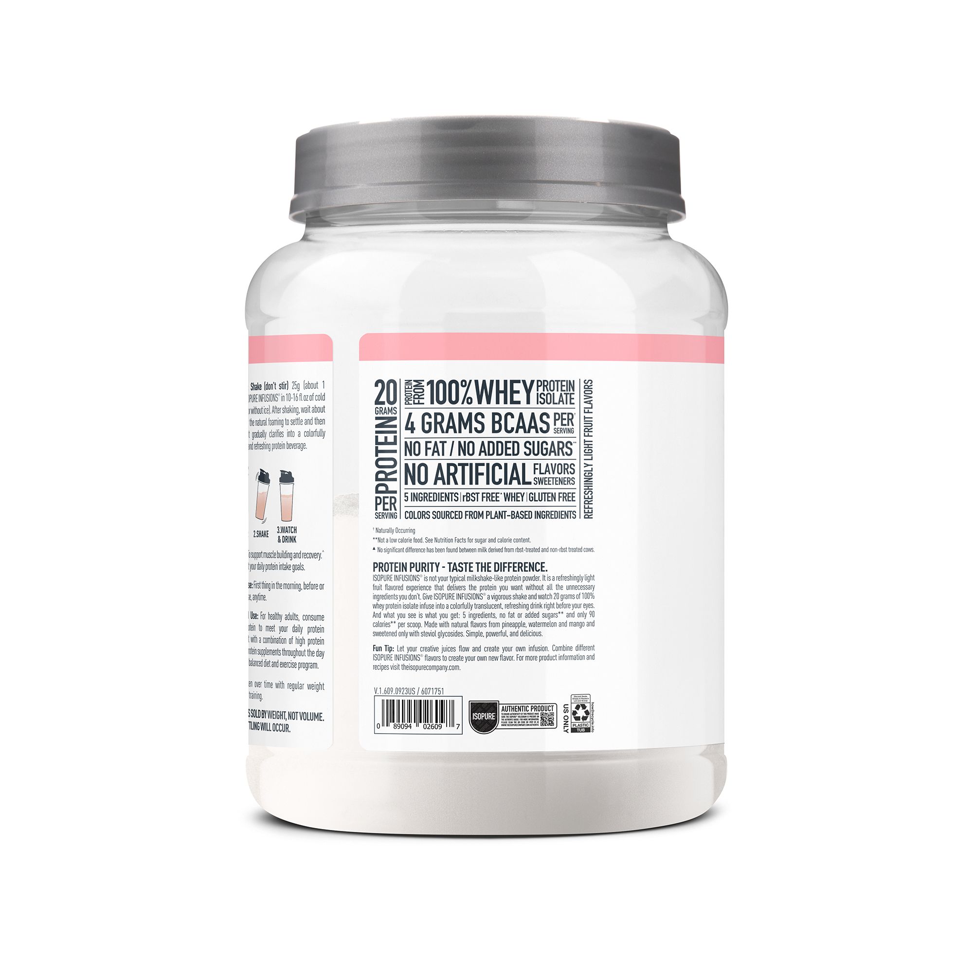 Isopure Infusions is not your typical milkshake-like protein powder. It is a refreshingly light fruit flavored experience that delivers the protein you want without all the unnecessary ingredients you don’t. Give Isopure Infusions a vigorous shake and watch 20 grams of 100% whey protein isolate infuse into a colorfully translucent, refreshing drink right before your eyes. And what you see is what you get: 5 ingredients, no fat or added sugars and only 90 calories per scoop. No artificial flavors or colors and sweetened only with stevia leaf extract. Simple, powerful, and delicious.
