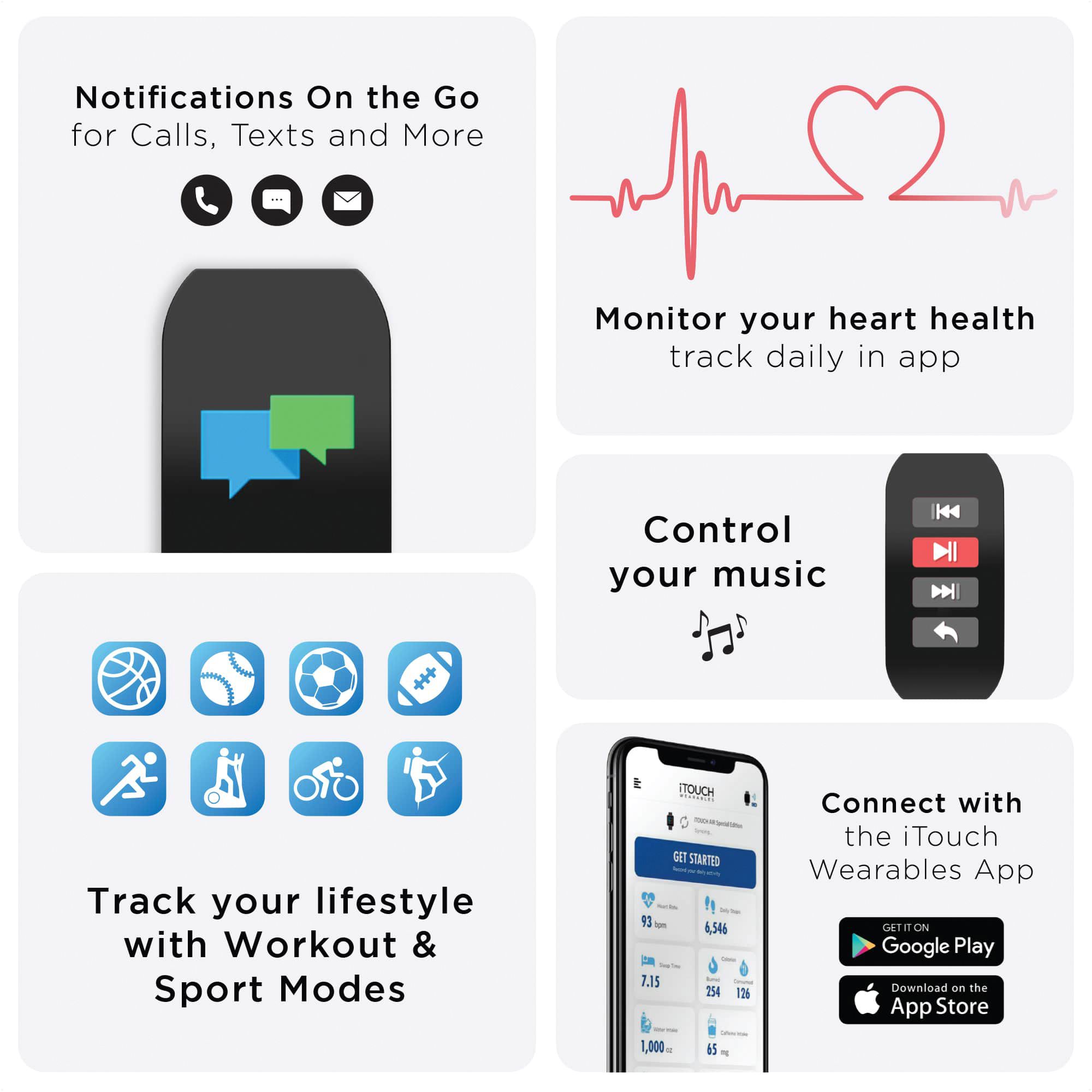 The iTouch Active is the perfect addition to your active lifestyle. By combining the most popular aspects of the best-selling iTouch slim models with new and improved technology, the iTouch Active will not disappoint. This affordable fitness tracker is committed to keeping you on top of your health by monitoring your heart rate, reminding you to hydrate, sports mode, and continuously tracking your steps.