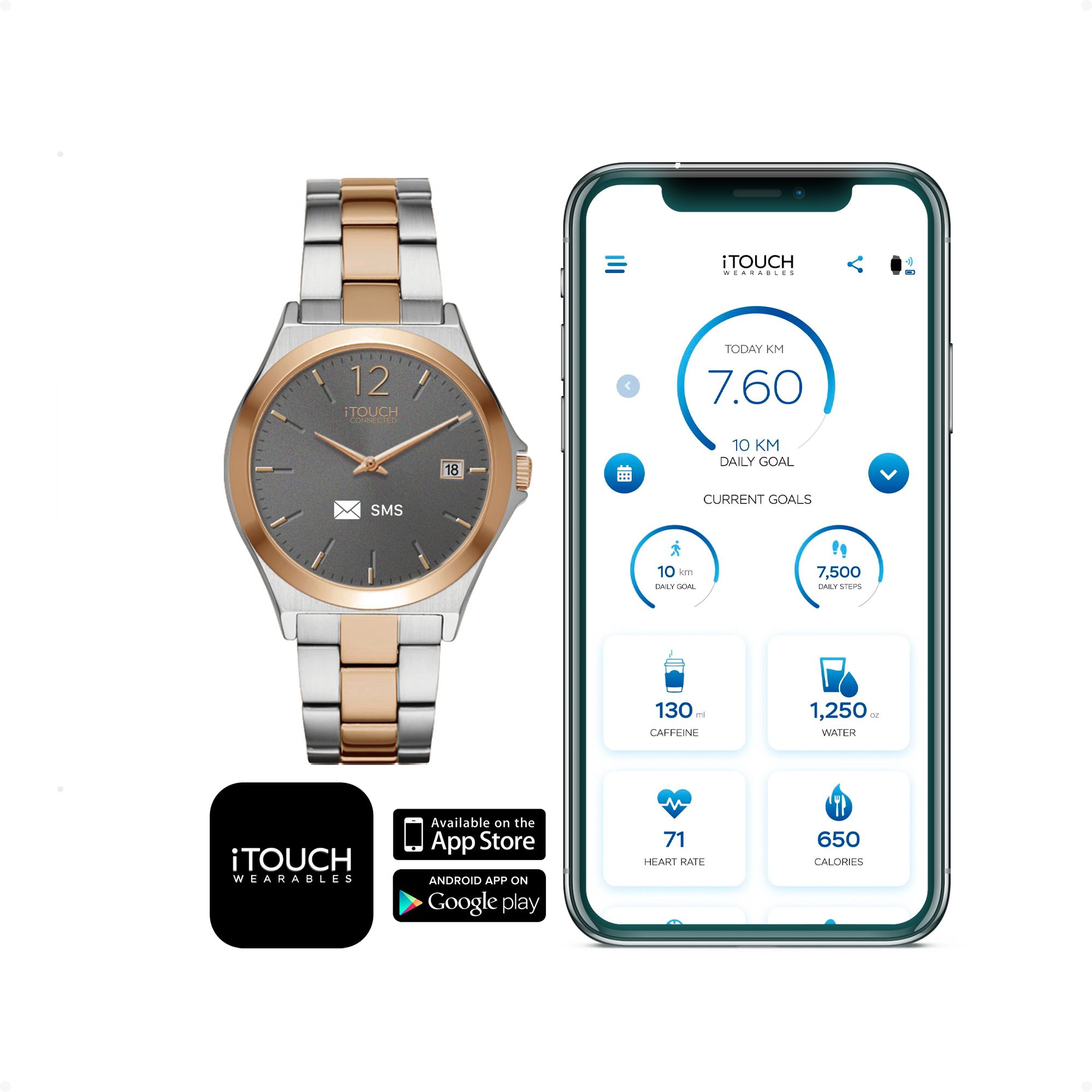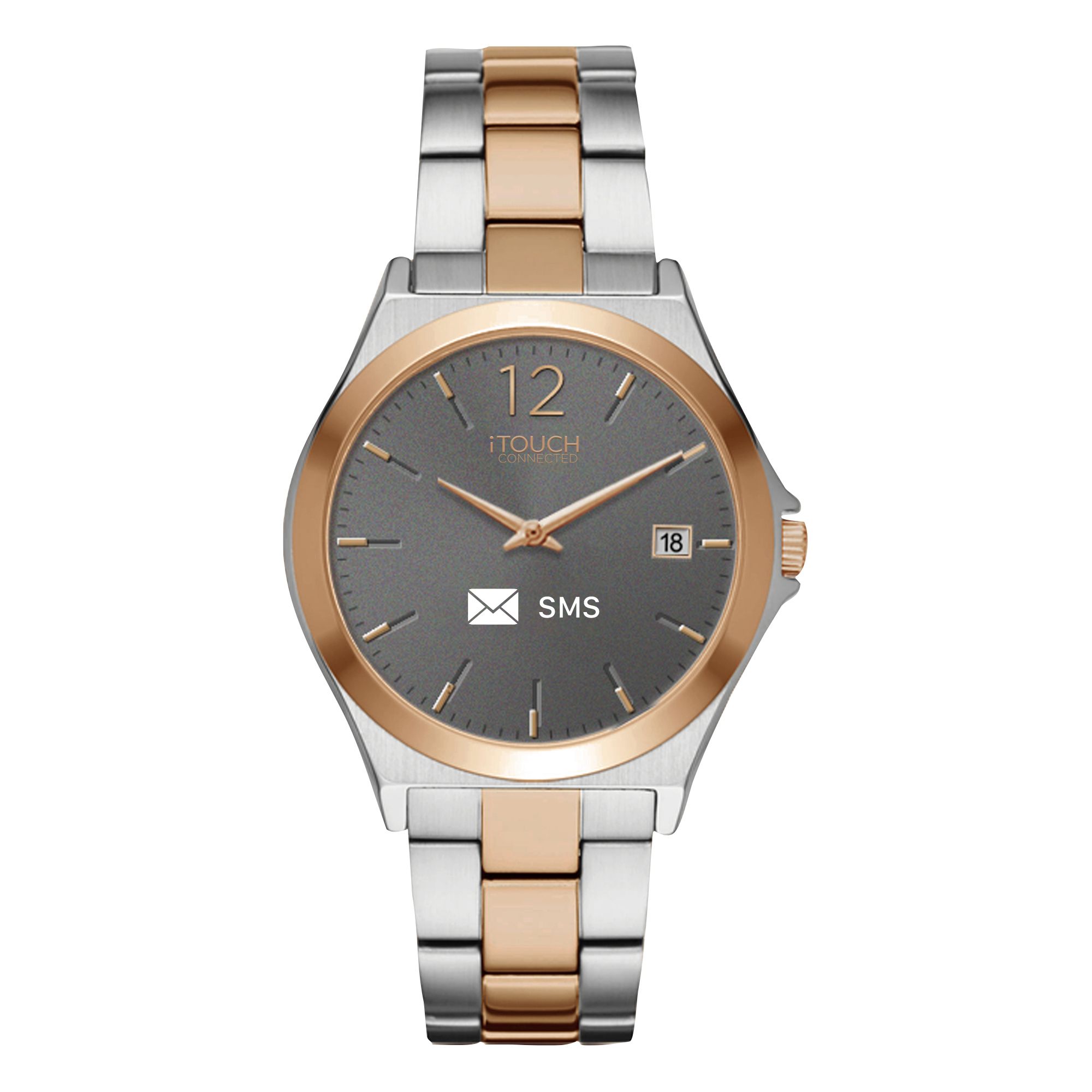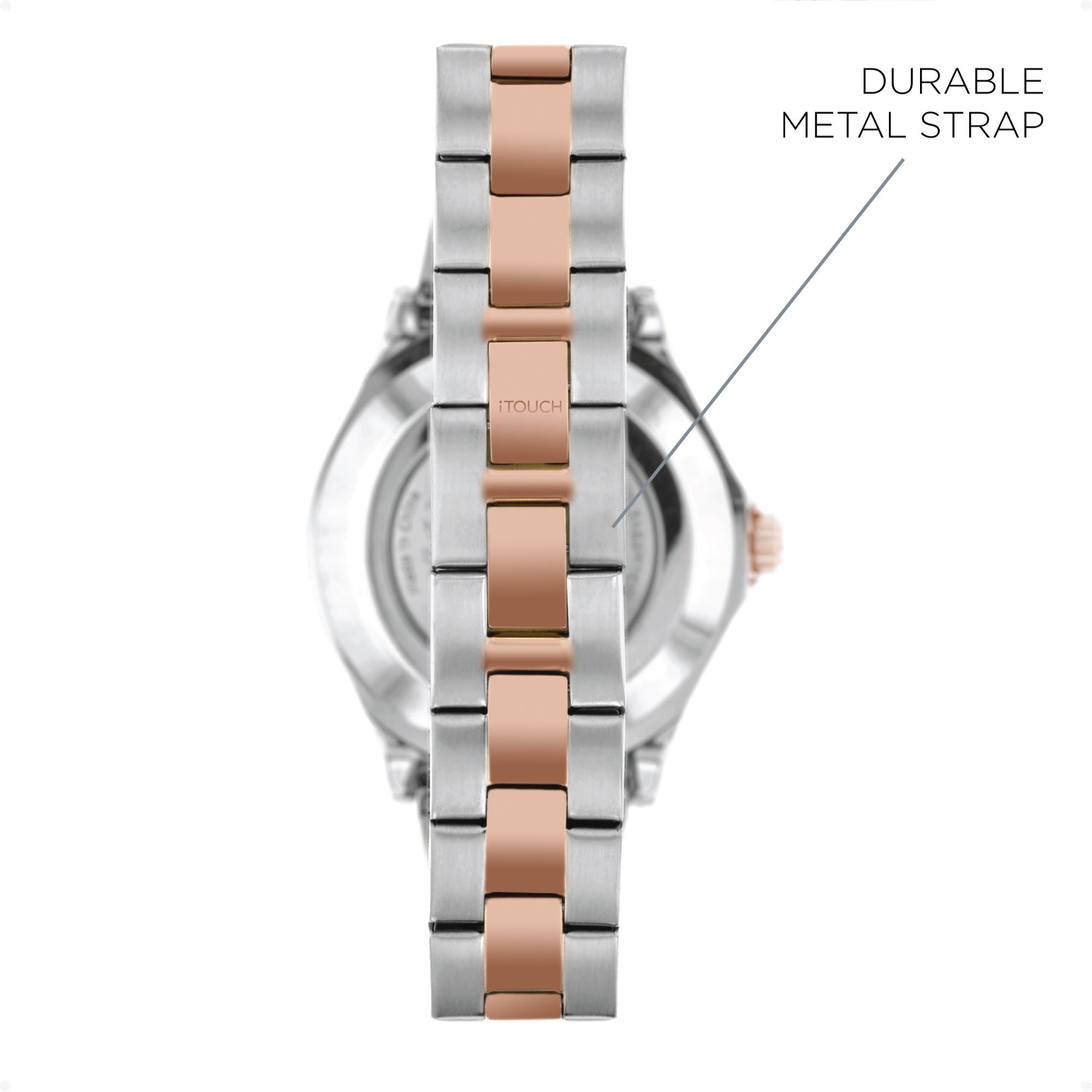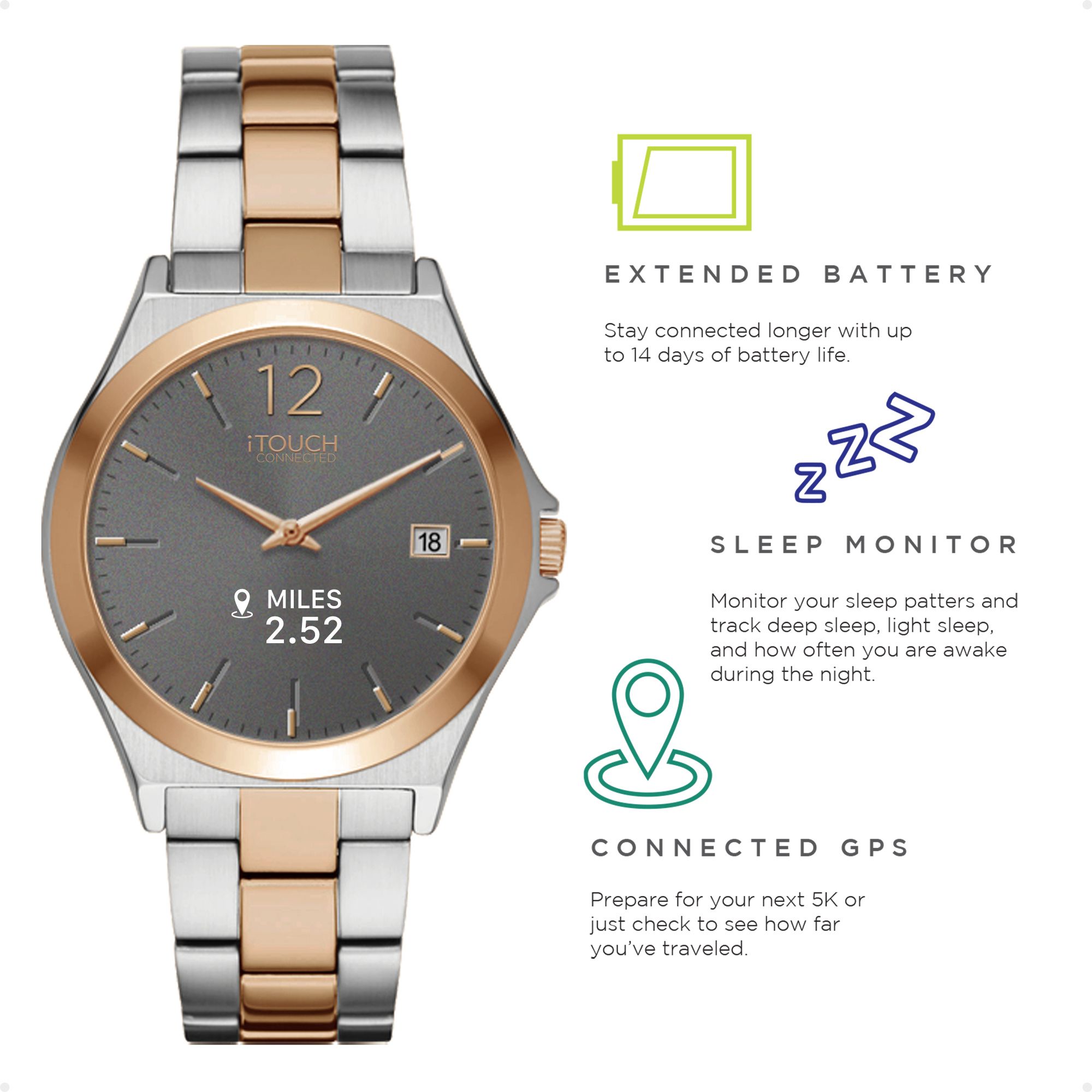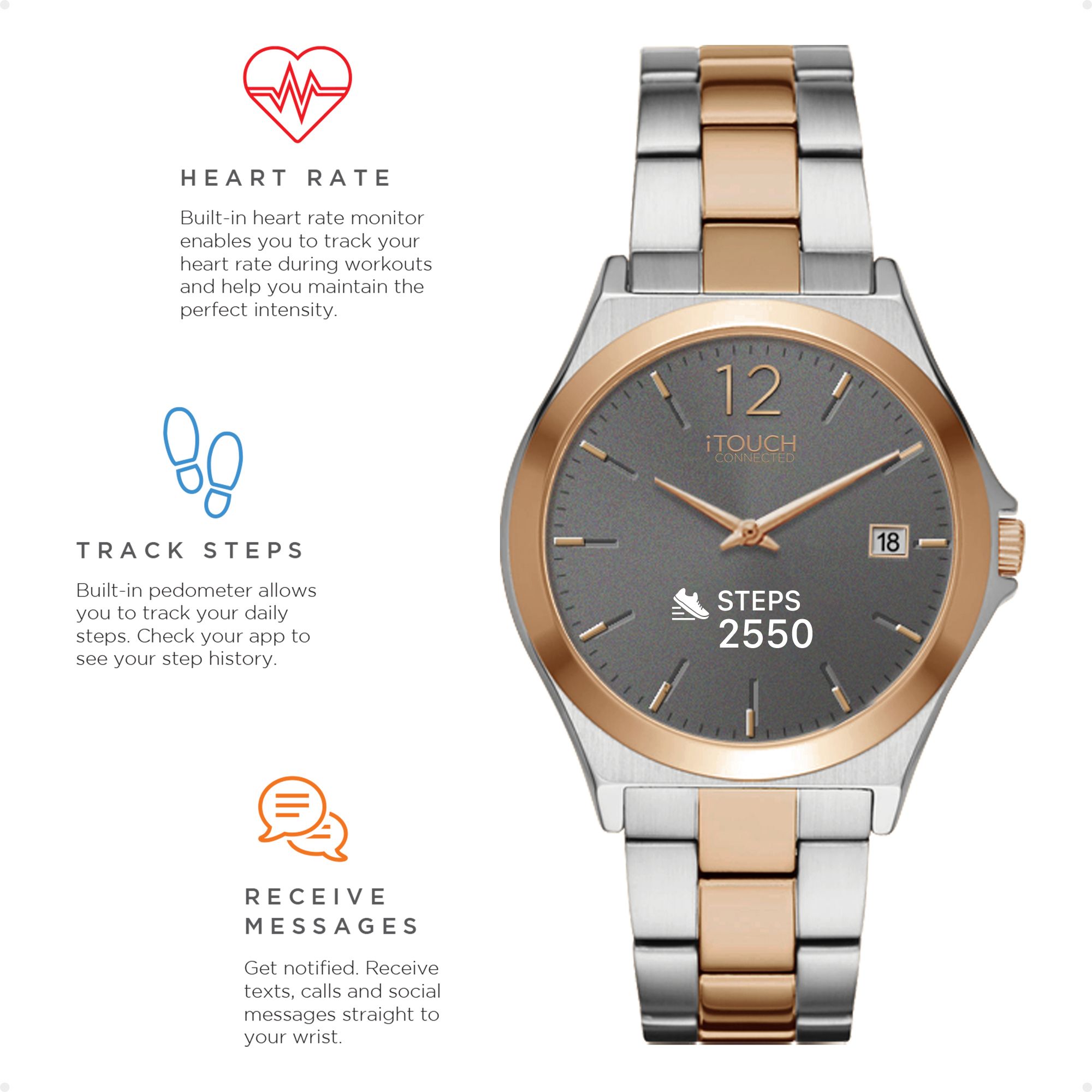 Use the iTouch Connected wearable fitness tracker to monitor your activity and to stay motivated while you reach your workout goals Waterproof watch comes complete with a calorie counter and pedometer Measure your heart rate and sleep with its one-touch sensor Connects to the iTouch app, available for iOS and Androids, so you can receive incoming phone messages, calls, and more Offers Bluetooth and GPS connectivity Built with style in mind, the neutral color and sleek design make it a great watch for both women and men Glass screen that is resistant to water, scratches, and dust Stainless steel band, extended battery life, and motion gesture Features: Sleep Monitor, Sedentary Reminder, Heartrate Monitor, Alarm, Camera Remote, Pedometer, Connected GPS, Find Watch, Notifications, IP68 - Waterproof, Extended Battery Life, Calorie Tracker, Distance Tracker, One Touch Input, OTA Support, Motion Gesture, Seamless Heartrate, LED Light Support 47mm Two-toned metal strap Includes smartwatch, USB charging cable, quick start guide, and warranty sign up Warranty: 1 year limited