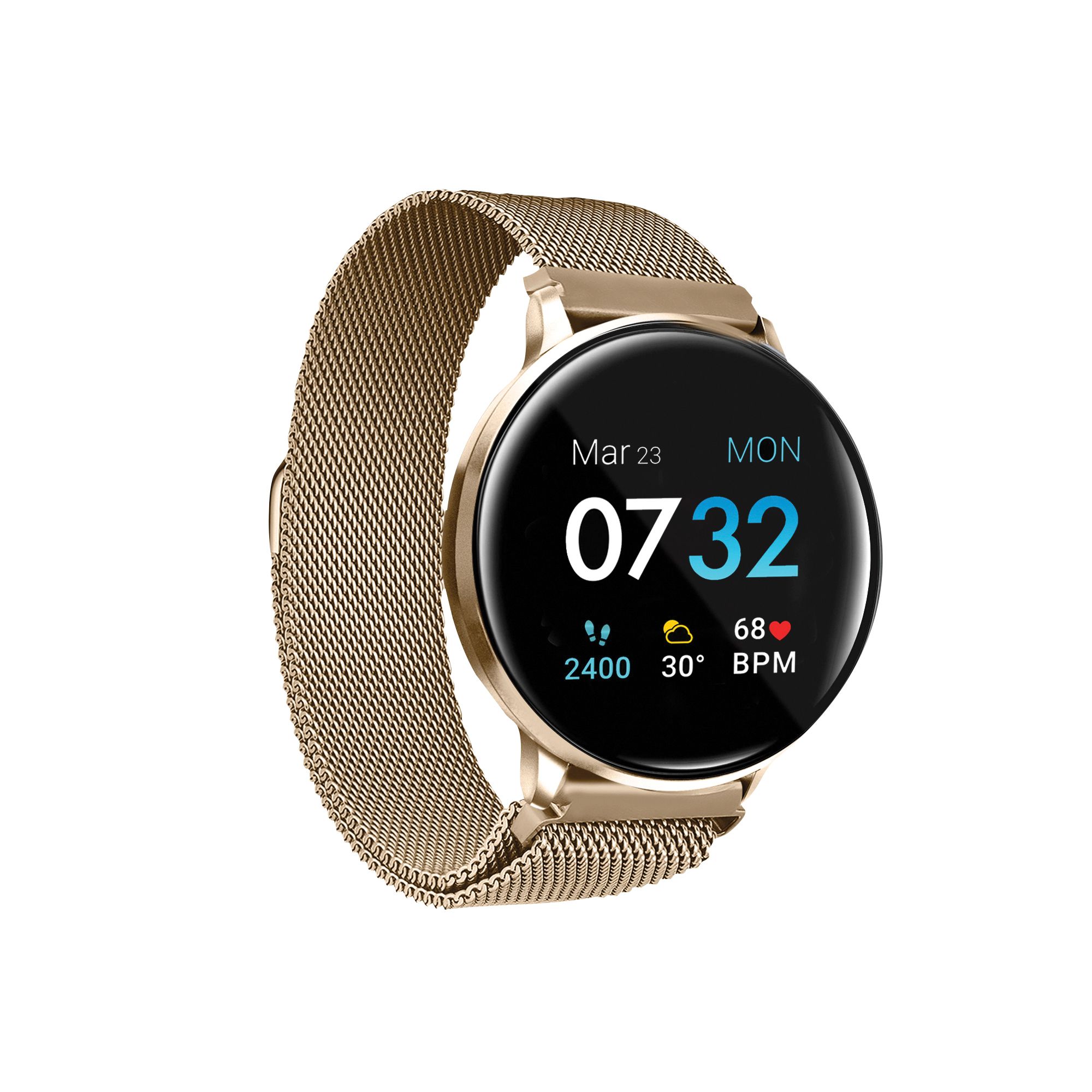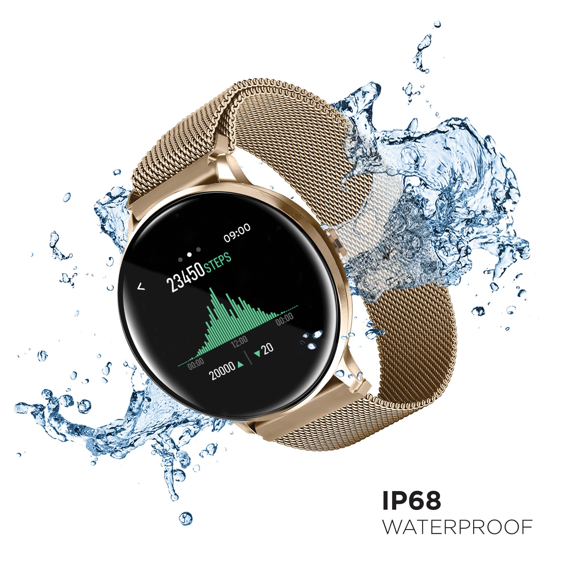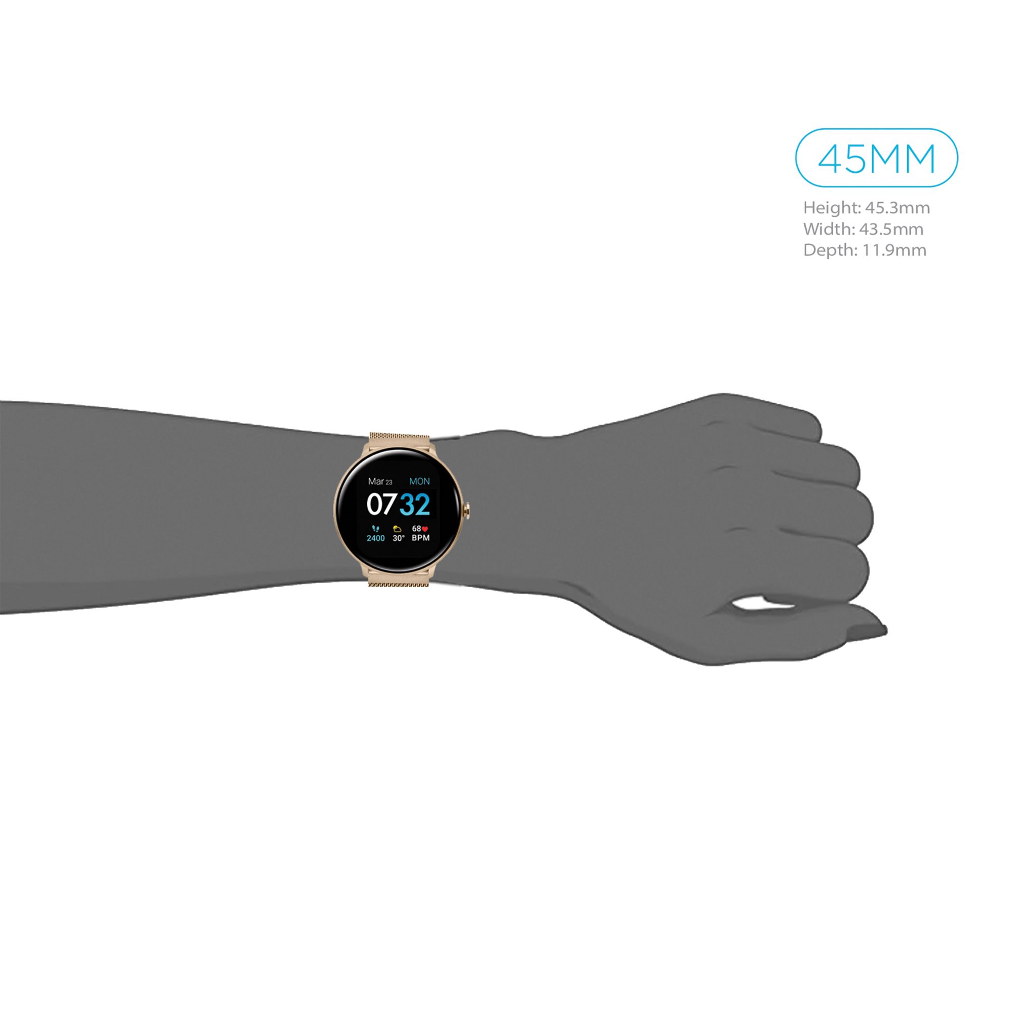 Keep track of your body temperature right on your wrist and detect illness in the early stages Monitor your activity and stay motivated while you reach your workout goals; Stay on top of your health while staying in touch with others Features a hydration reminder, breathing exercises, hygiene assistant, and an elevated heart rate reminder Waterproof watch comes complete with a calorie counter and pedometer with four sports modes and five workout modes Measure your heart rate and sleep with the one-touch sensor Connects to the iTouch app, available for iPhones and Androids, so you can receive incoming phone messages, calls, and more Bluetooth and GPS connectivity Glass screen that is resistant to water, scratches, and dust Solid silicone band, a bright LED face, power saving mode, and an extended battery life Features: Workout Mode, Multi-Sports Mode, IP68 Waterproof, Extended Battery Life, Calorie Tracker, Full Touch Input, Vibrant Animated Color Scheme, OTA Support, Motion Gesture, Connected GPS, Seamless Heart Rate, Breathing Exercises, Countdown Clock, Activity Minute Counter, Hydration Reminder, Elevated Heart Rate Reminder, Power Saving Mode, Body Temperature Monitor, Hygiene Assistant, Continuous 24 Hour Heart Rate, Sleep Monitor, Sedentary Reminder 45mm Gold case with gold mesh strap Includes smartwatch, USB charging cable, quick start guide, and warranty sign up Warranty: 1 year limited