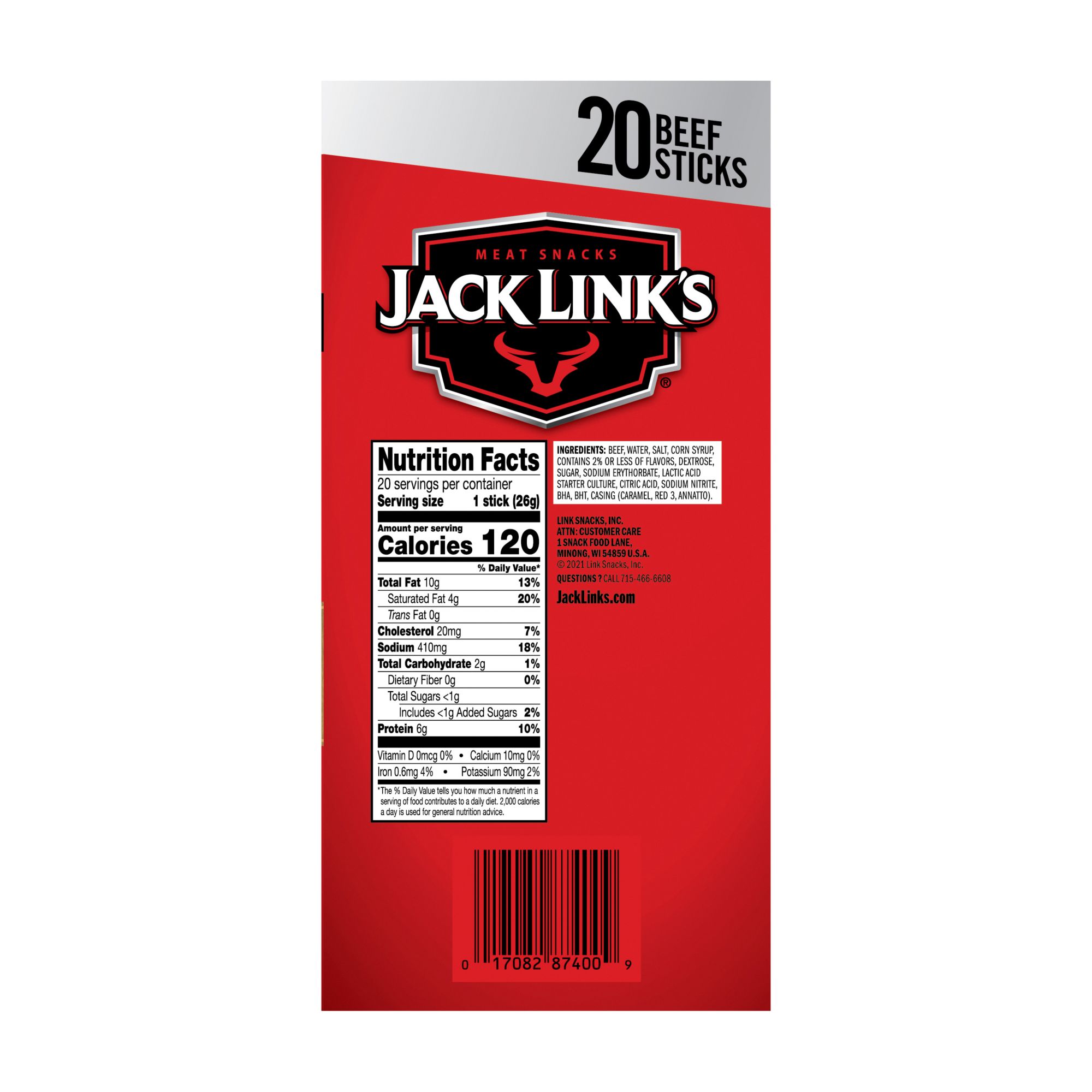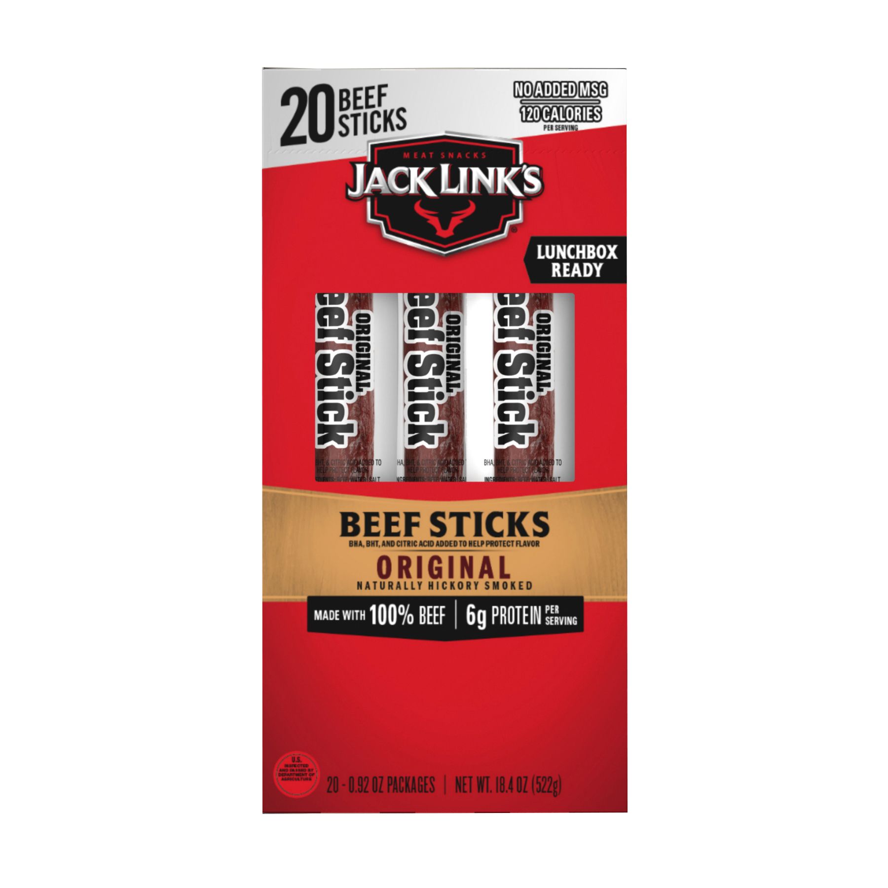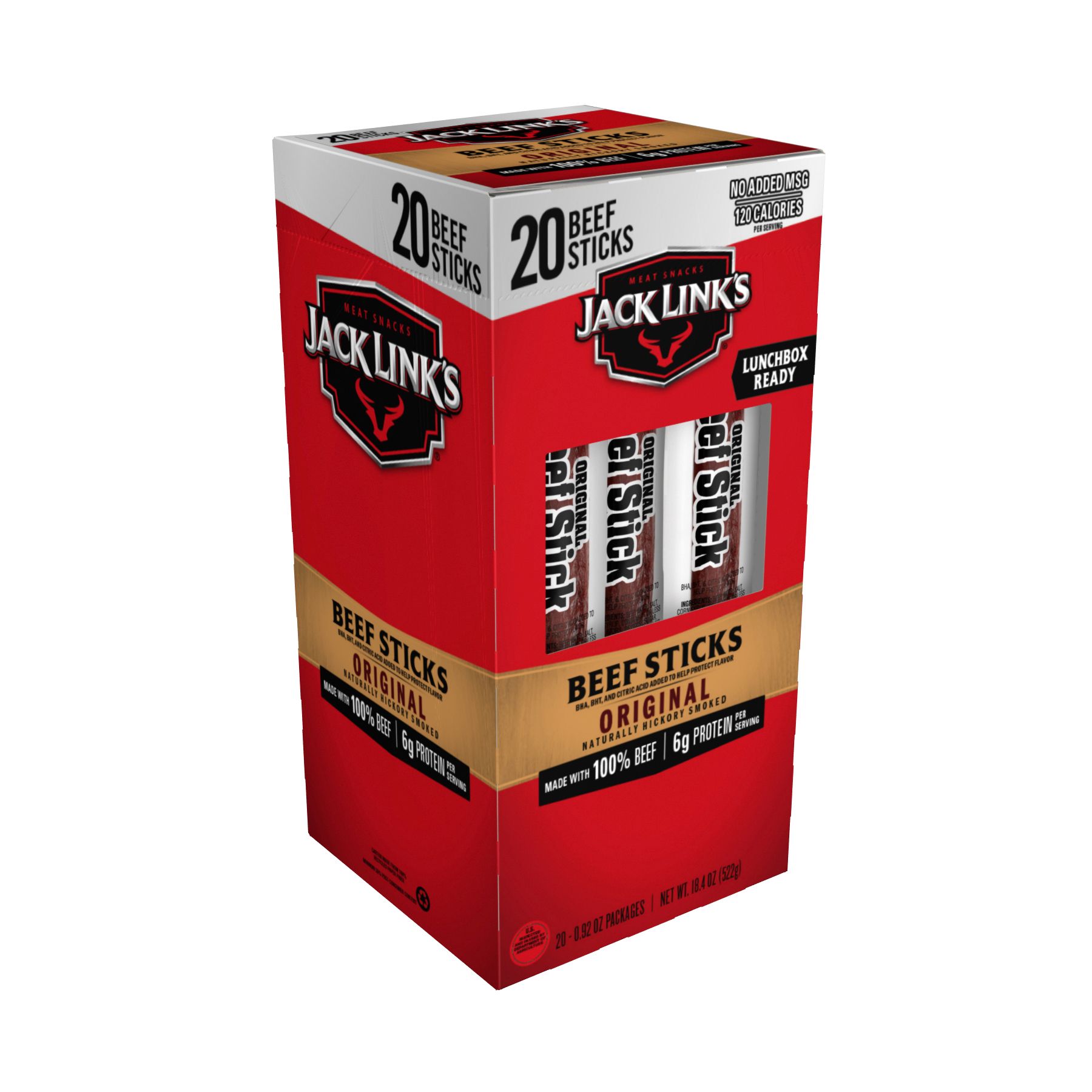 Jack Link’s Beef Sticks are made with 100% premium beef, then seasoned with simple ingredients like water, salt and spices. Each delicious beef stick has less than 1g of sugar and have 120 calories.