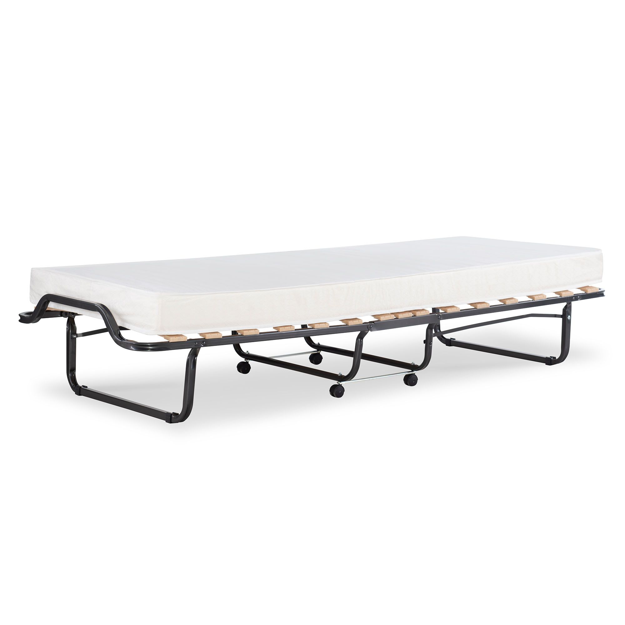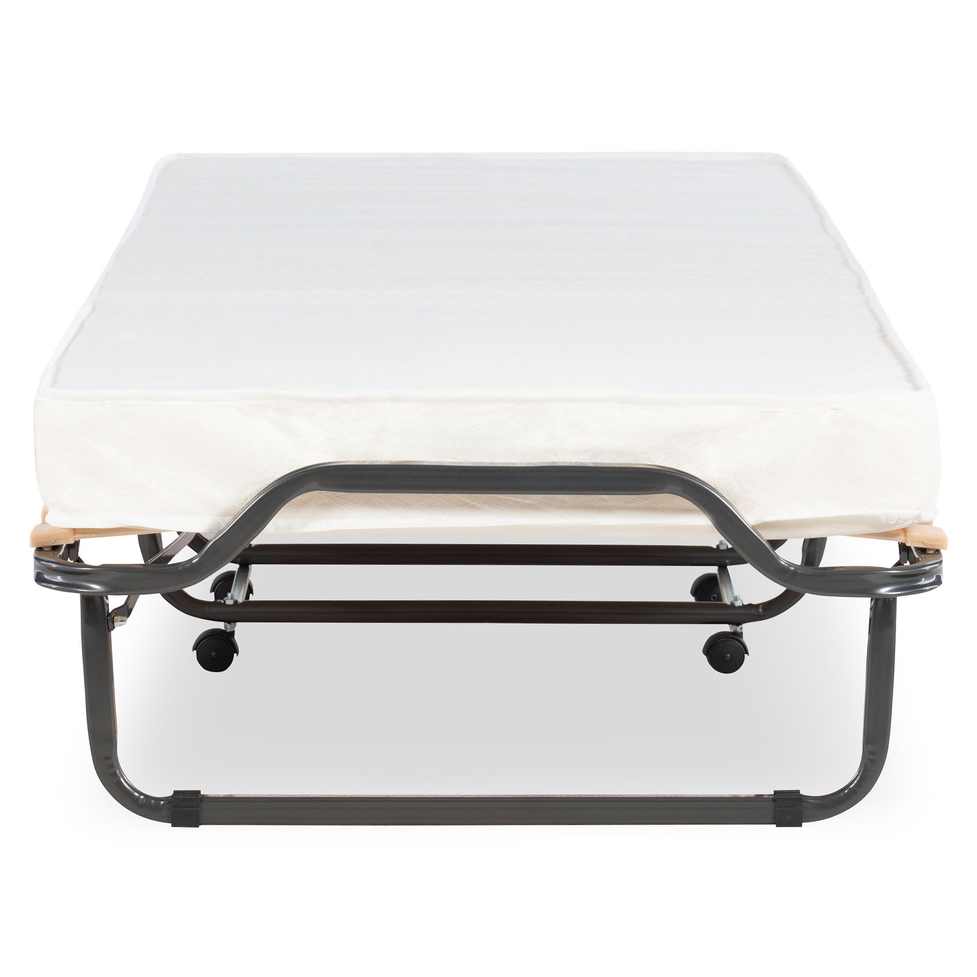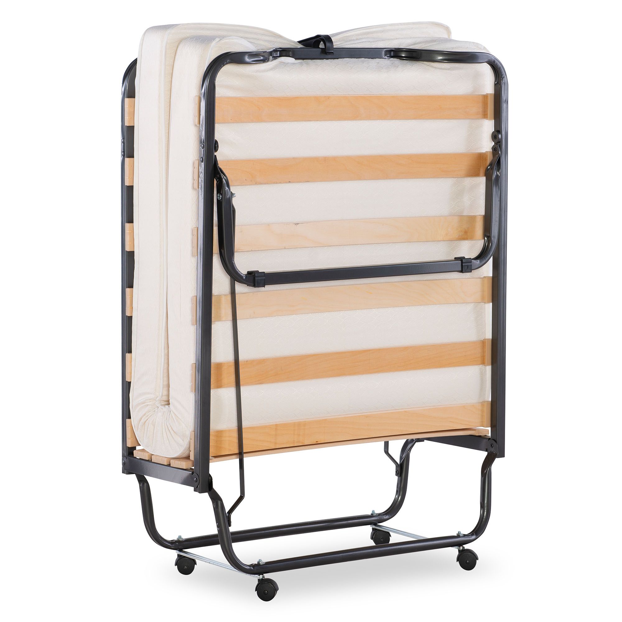 Frame is made of steel tubing with durable wood slats Comes with a memory foam-topped, twin-size mattress Soft, beige damask fabric cover Compact design allows easy setup and storage Integrated transport casters Assembly required Includes folding bed and twin-sized mattress topped with memory foam Warranty: 30 days limited